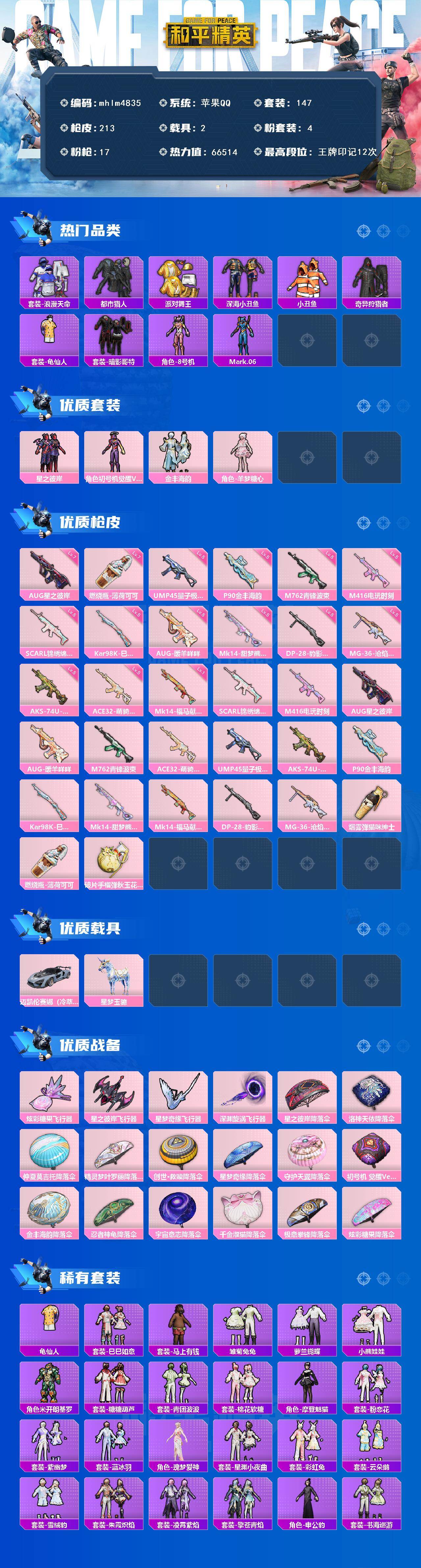 苹果 手Q-4粉装-17特效枪-2载具-4粉色飞行器-66514热力值-12王牌印记-147套装-213枪皮