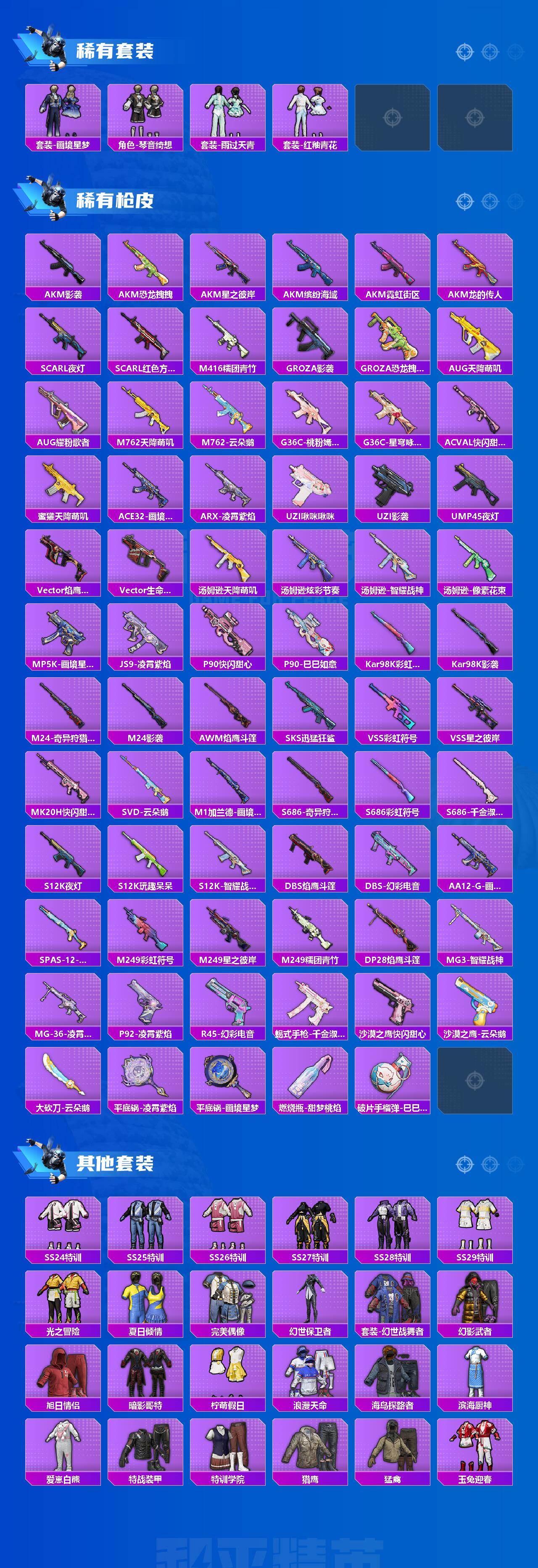 【粉色枪皮等级】:SCAR-L-锦绣绵绵(五级),M416-电玩时刻(五级),AUG-星之彼岸(七级),AUG-暖羊咩咩(