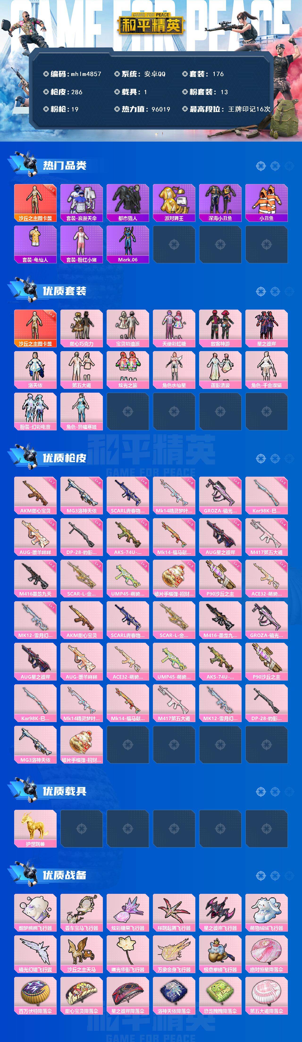 【mhlm4857】安卓 手Q-1神装-13粉装-19特效枪-1载具-11粉色飞行器-96019热力值-16王牌印记-176套装-286枪皮