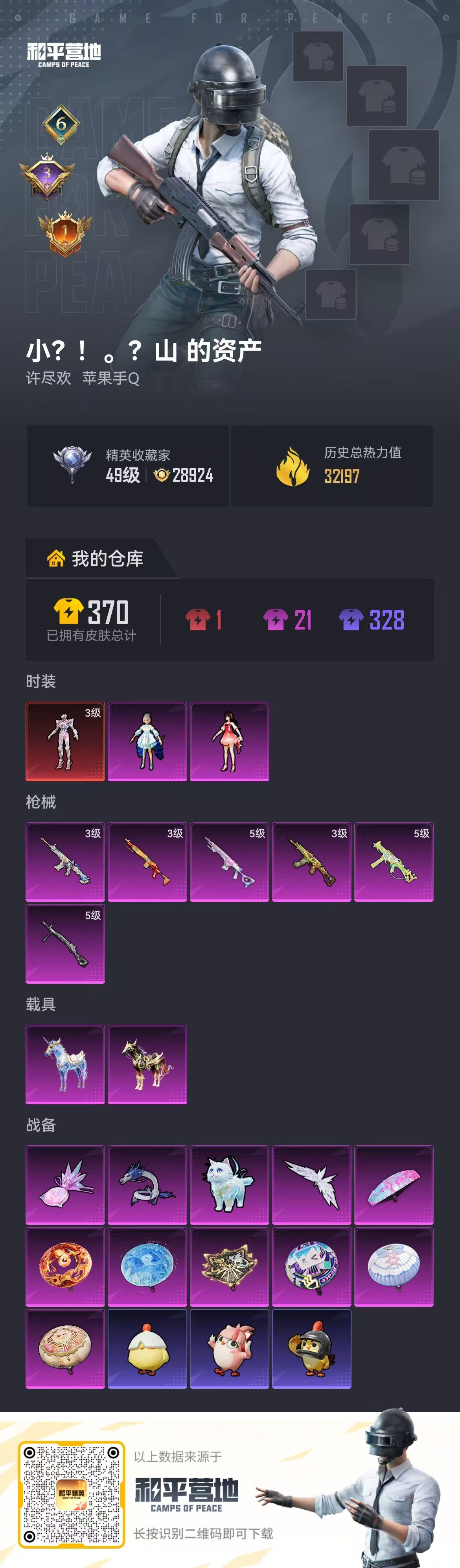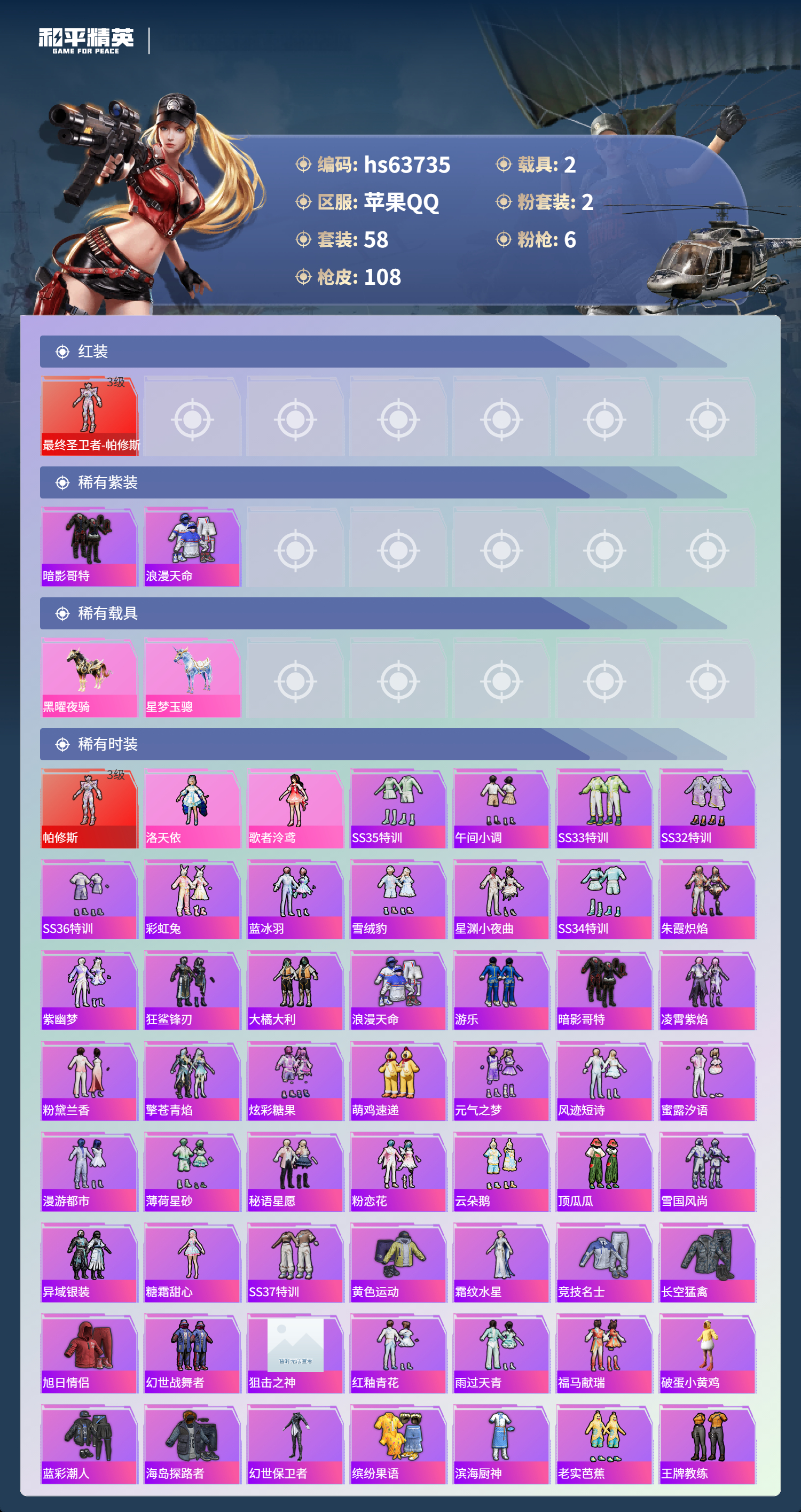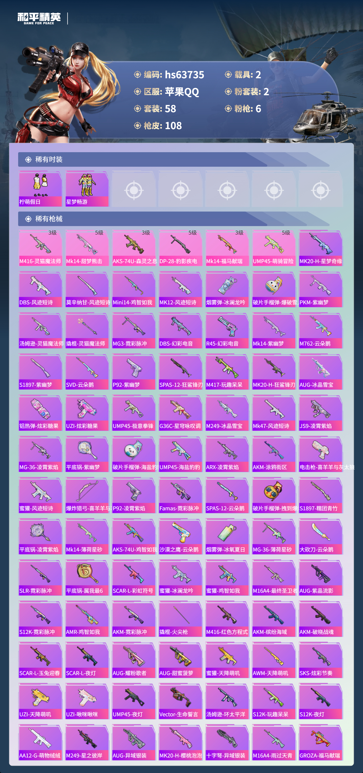 hs63735 苹果手Q-6王牌印记-1红装-2粉装-6特效枪-2载具-32197热力值-58套装-108枪皮-3卓越印记-1传奇印记