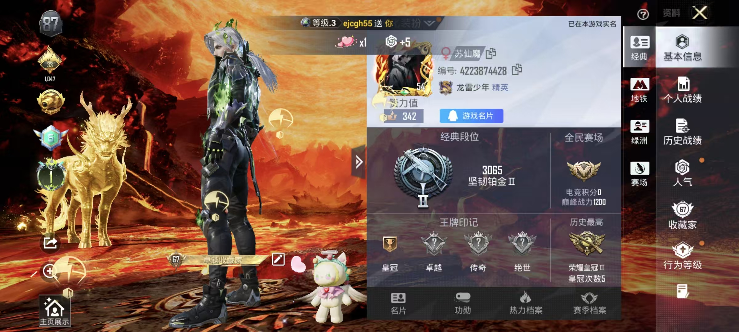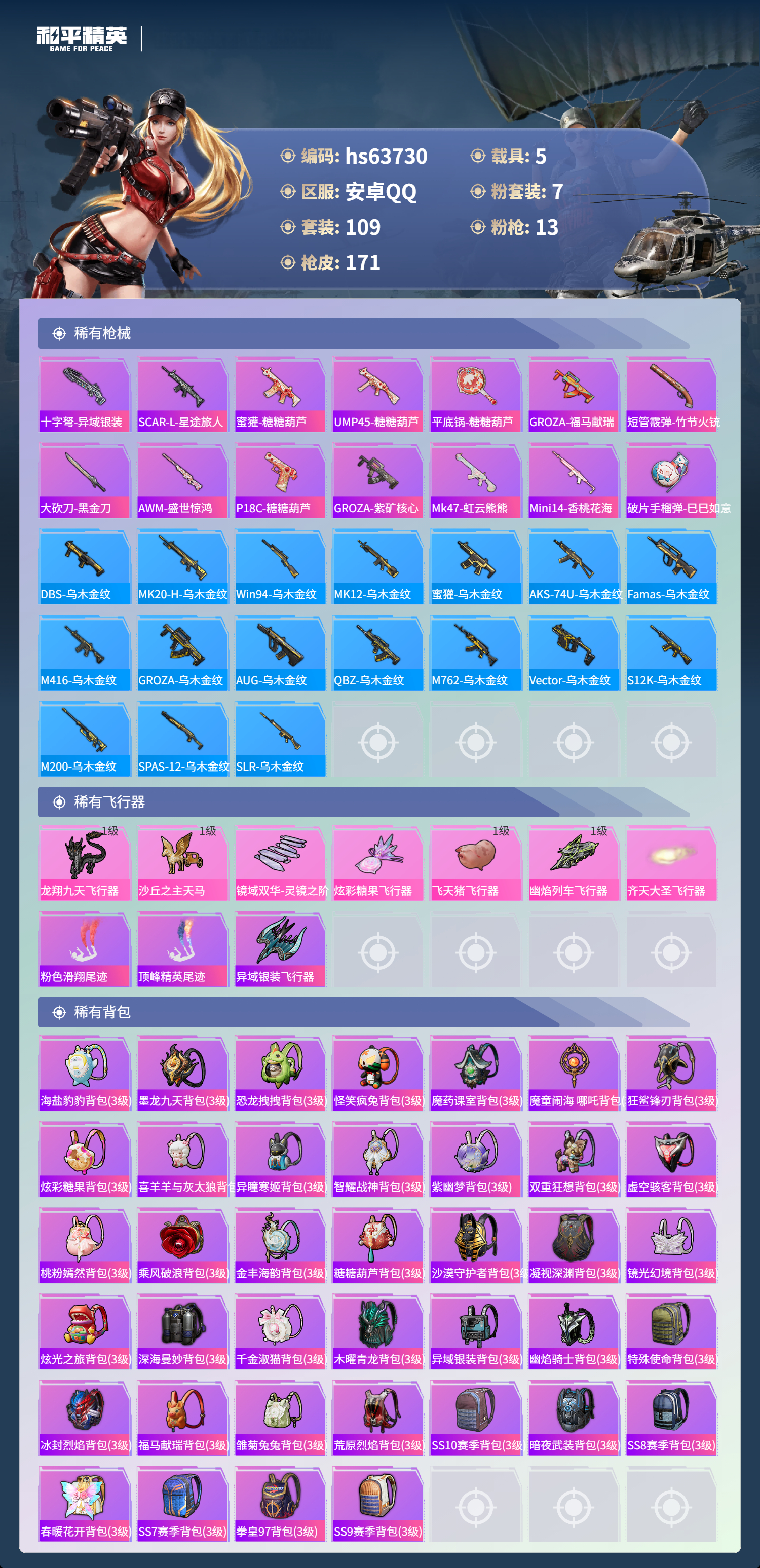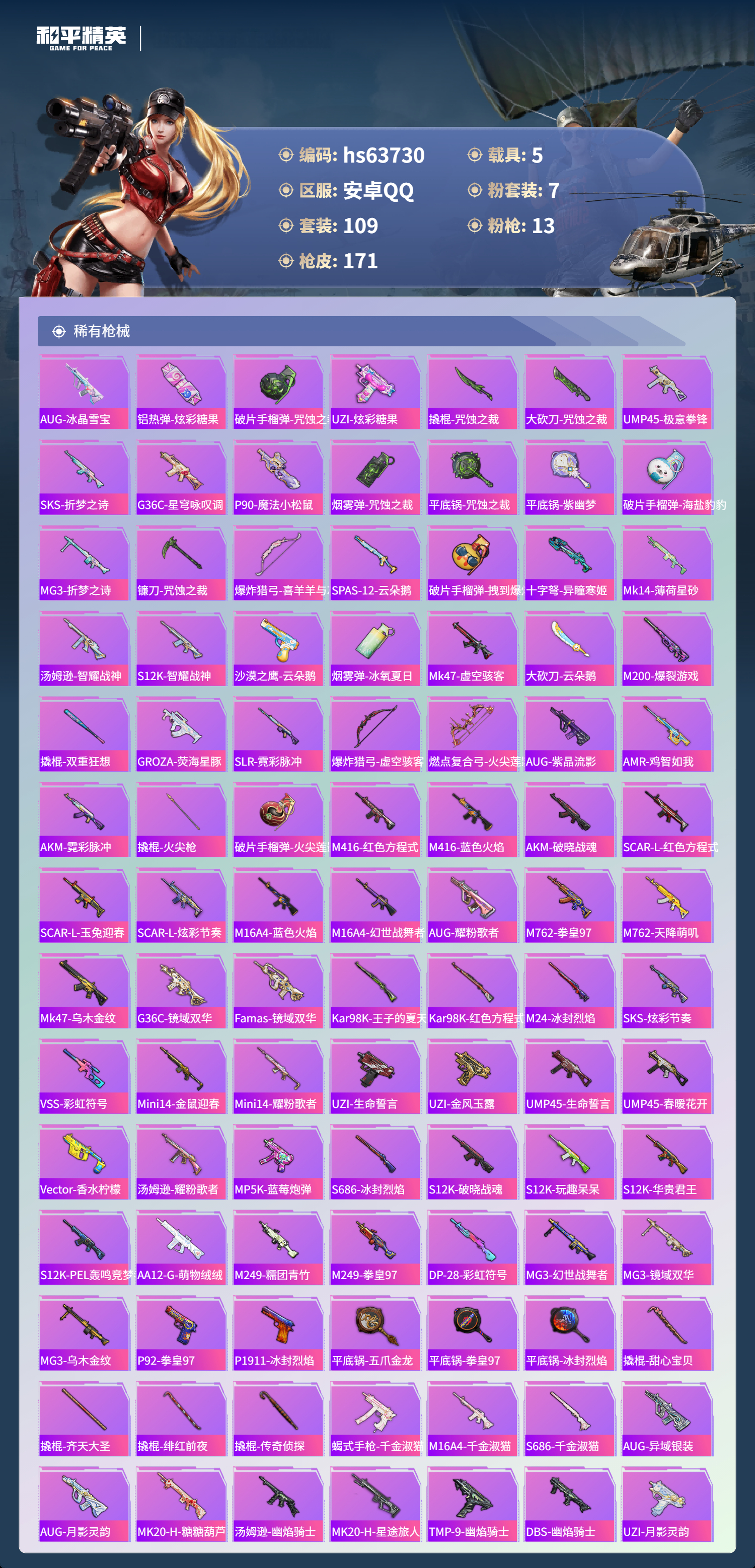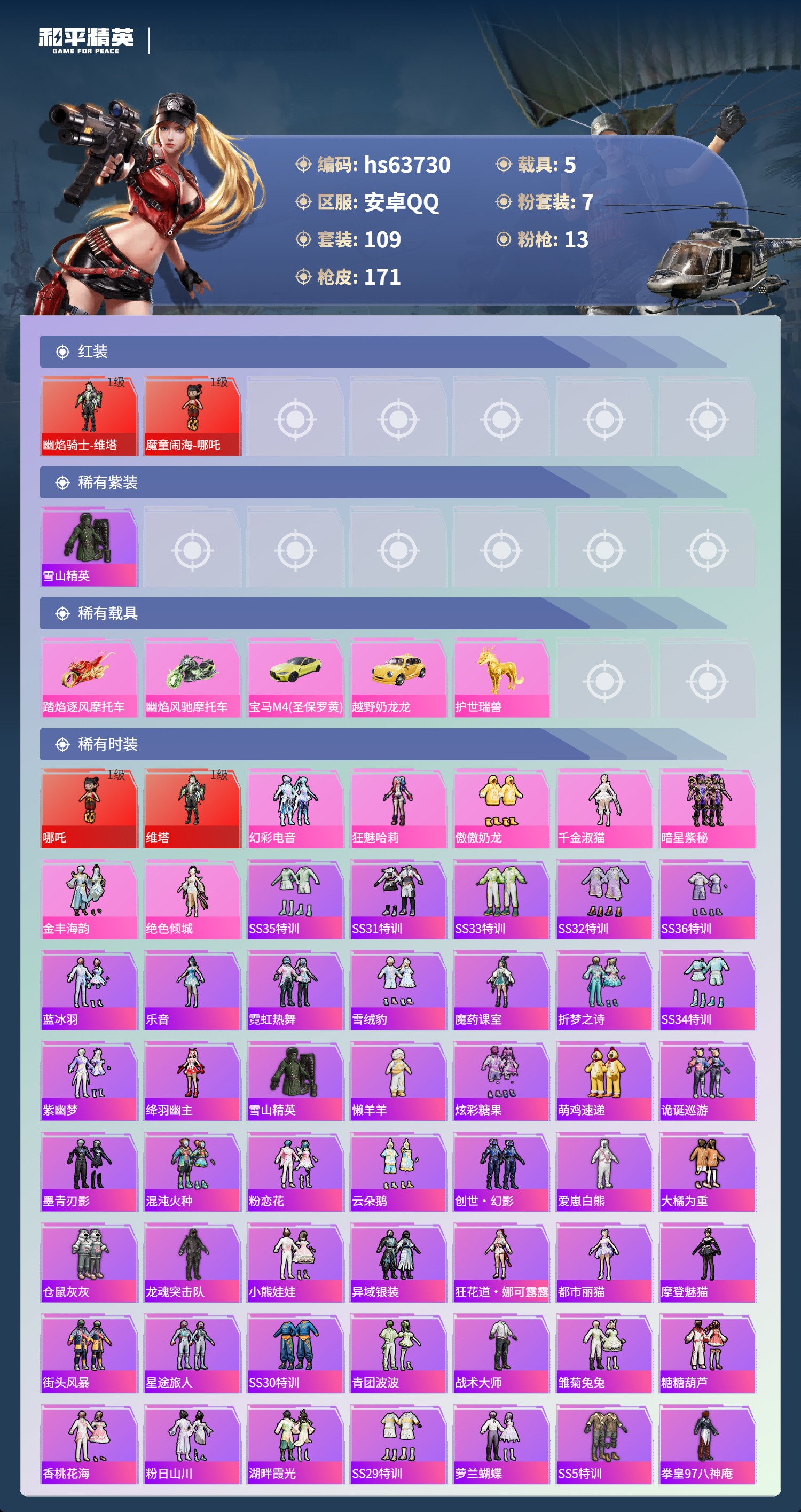 hs63730 安卓手Q-0王牌印记-2红装-7粉装-13特效枪-5载具-61670热力值-109套装-171枪皮