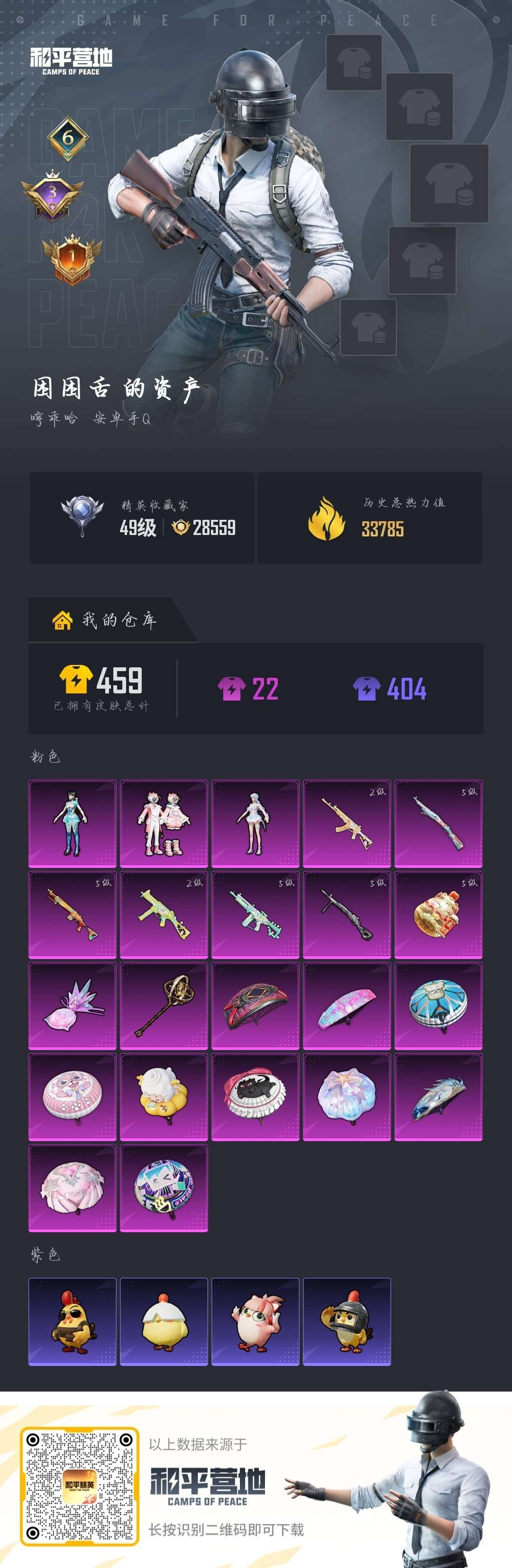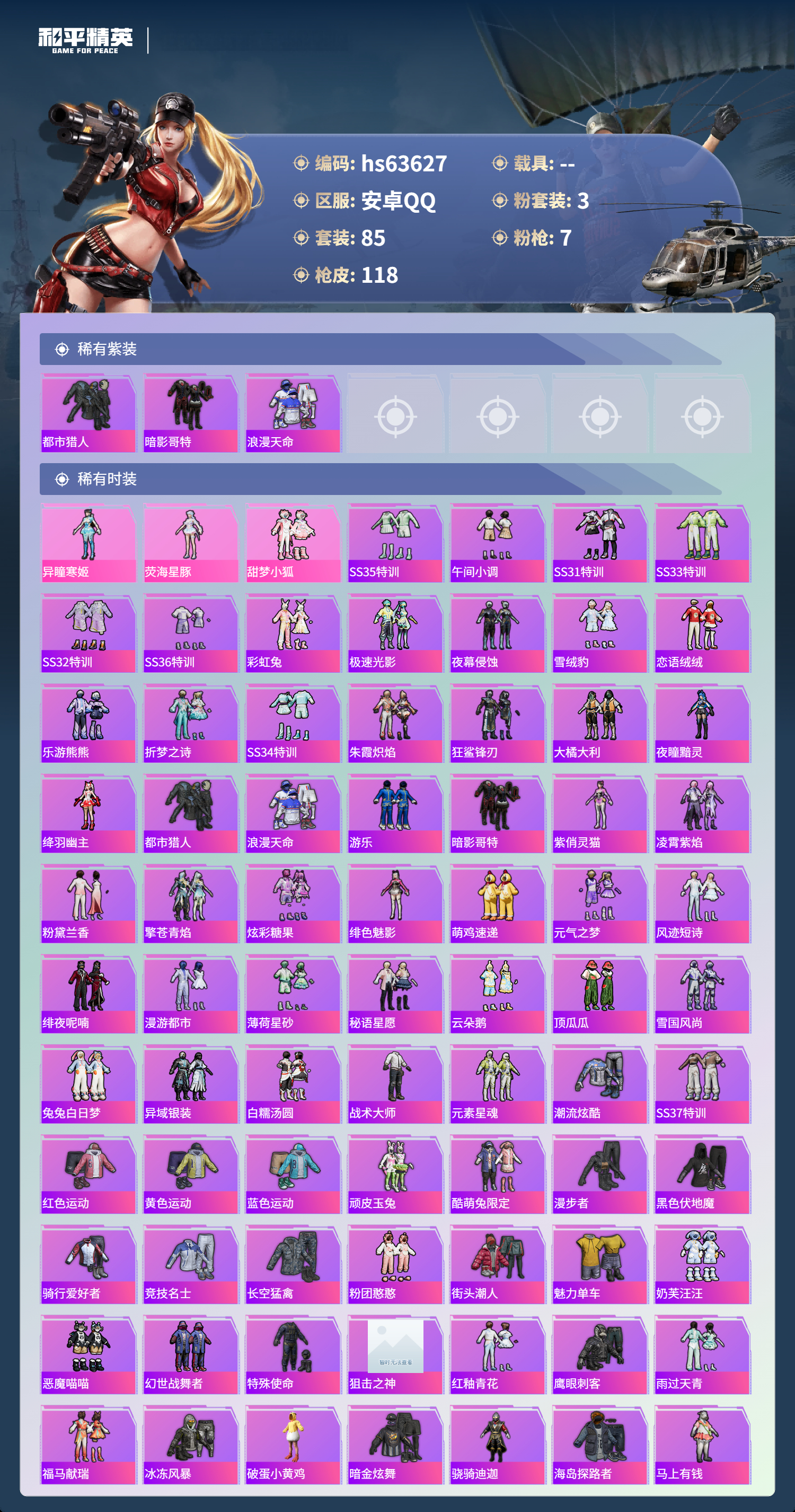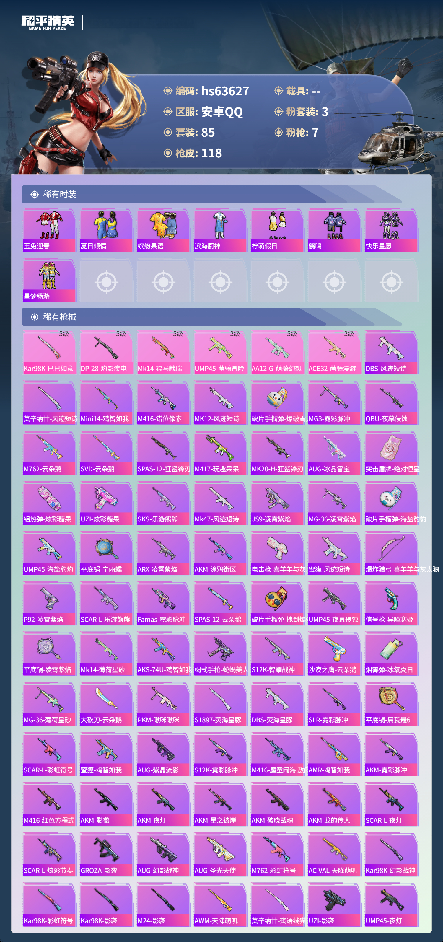 hs63627 安卓手Q-6王牌印记-3粉装-7特效枪-33785热力值-85套装-118枪皮-3卓越印记-1传奇印记