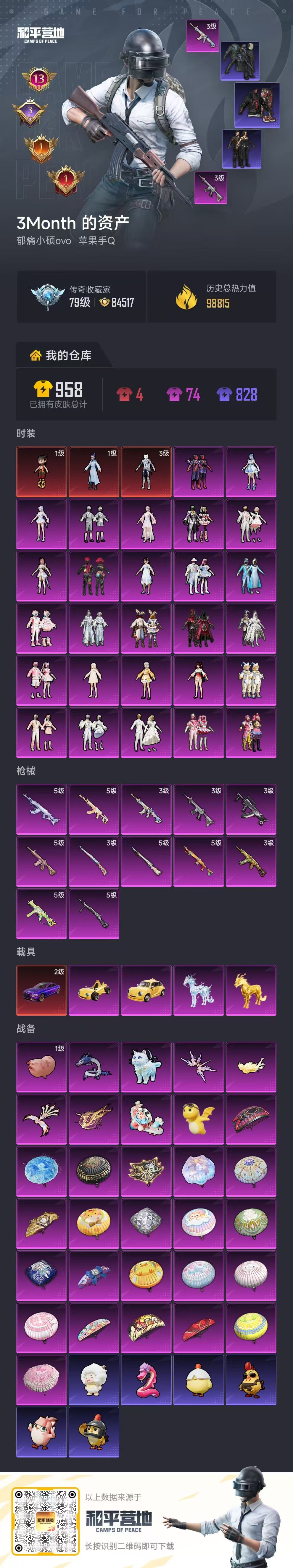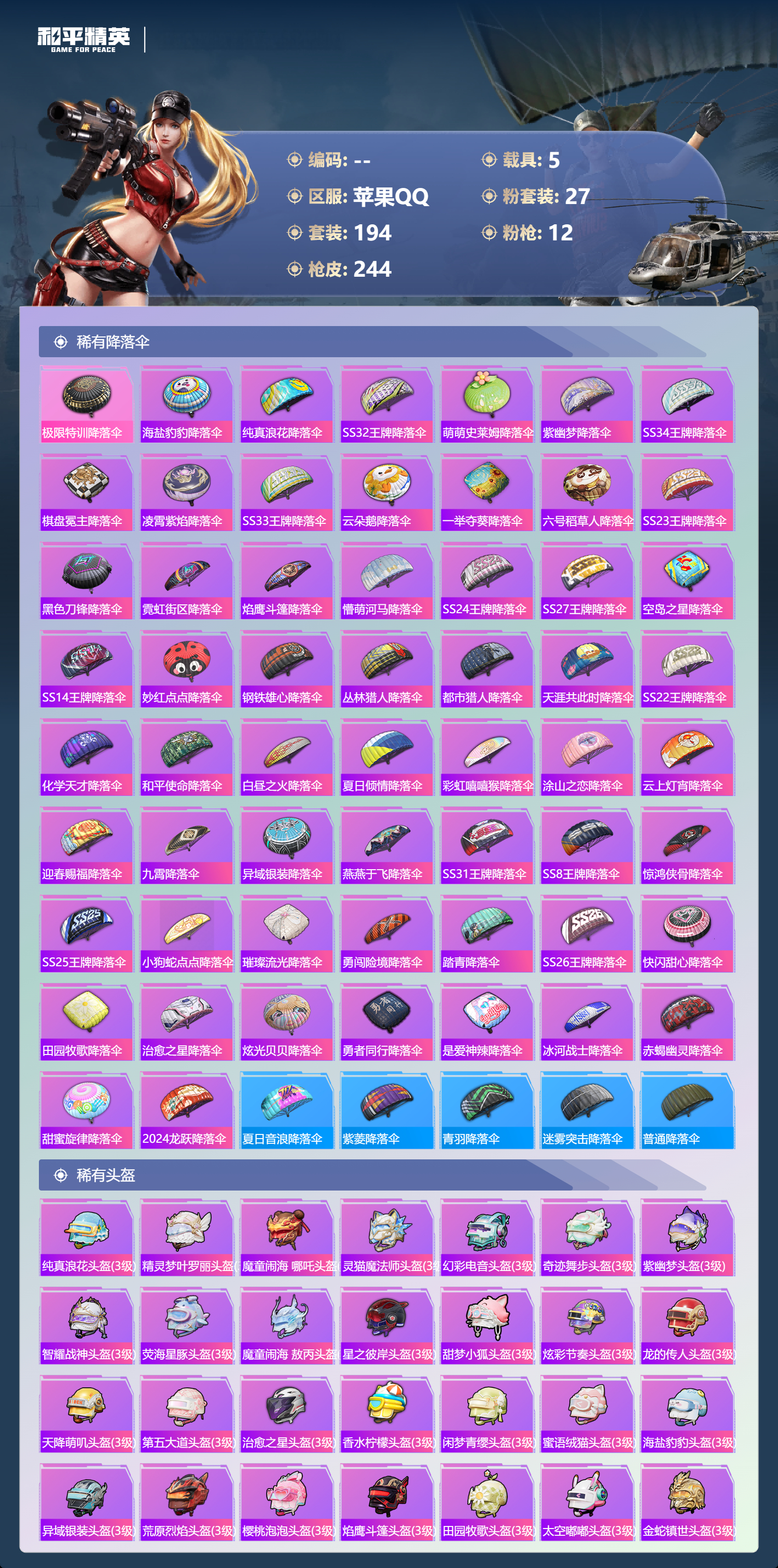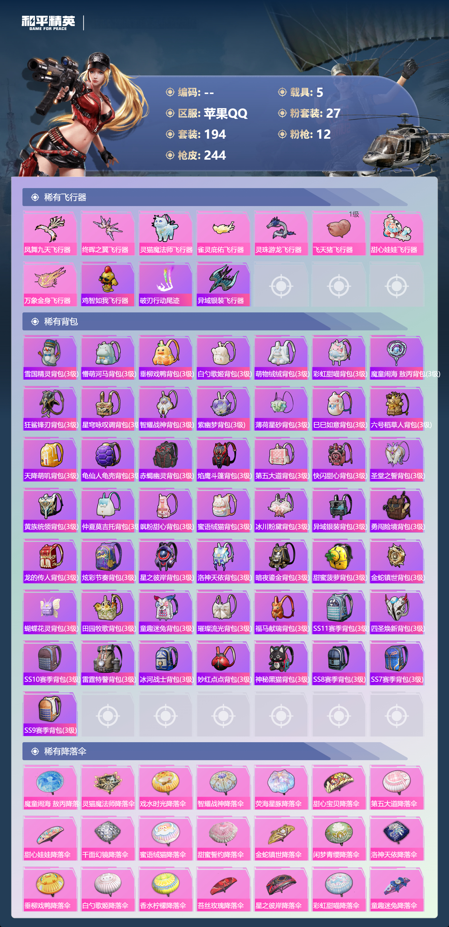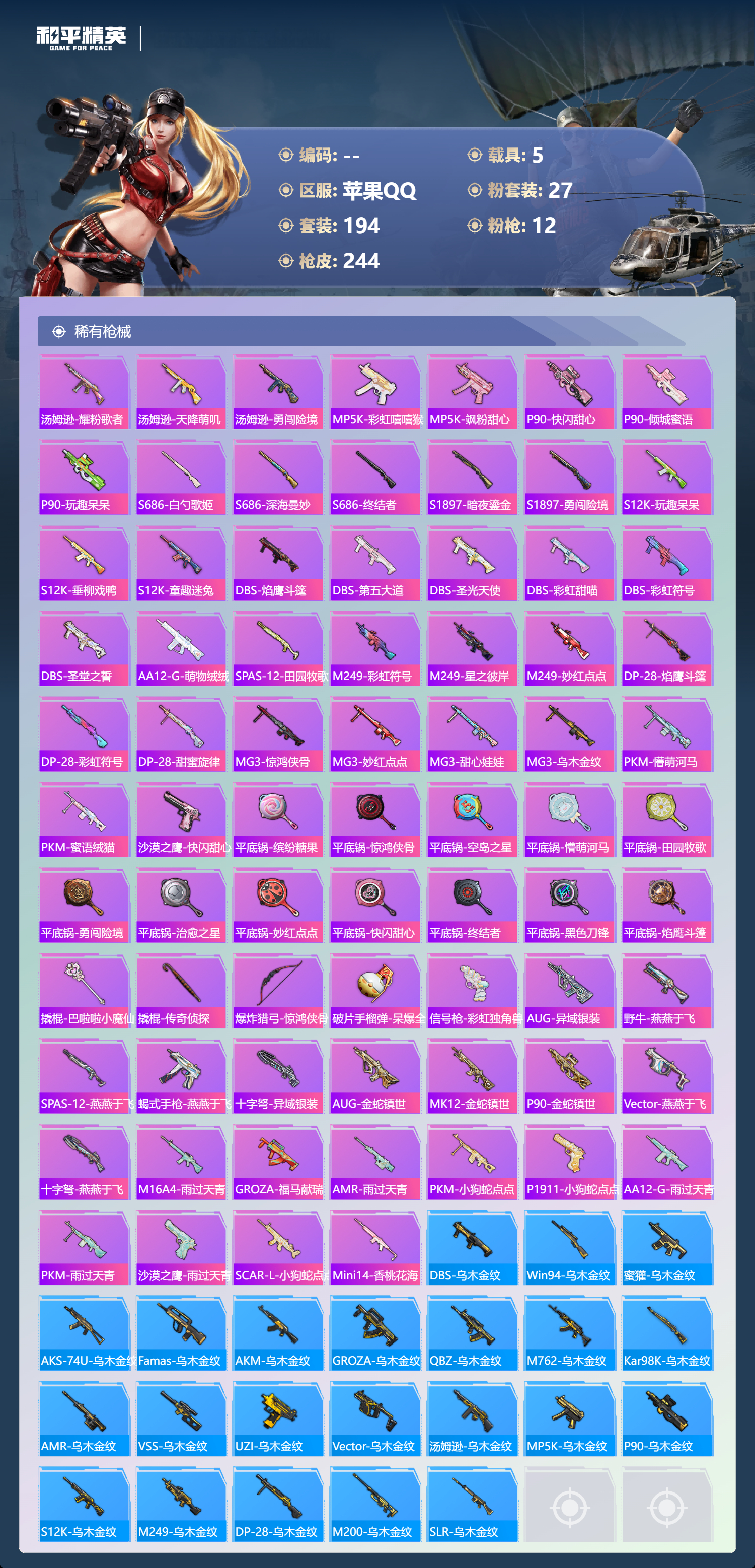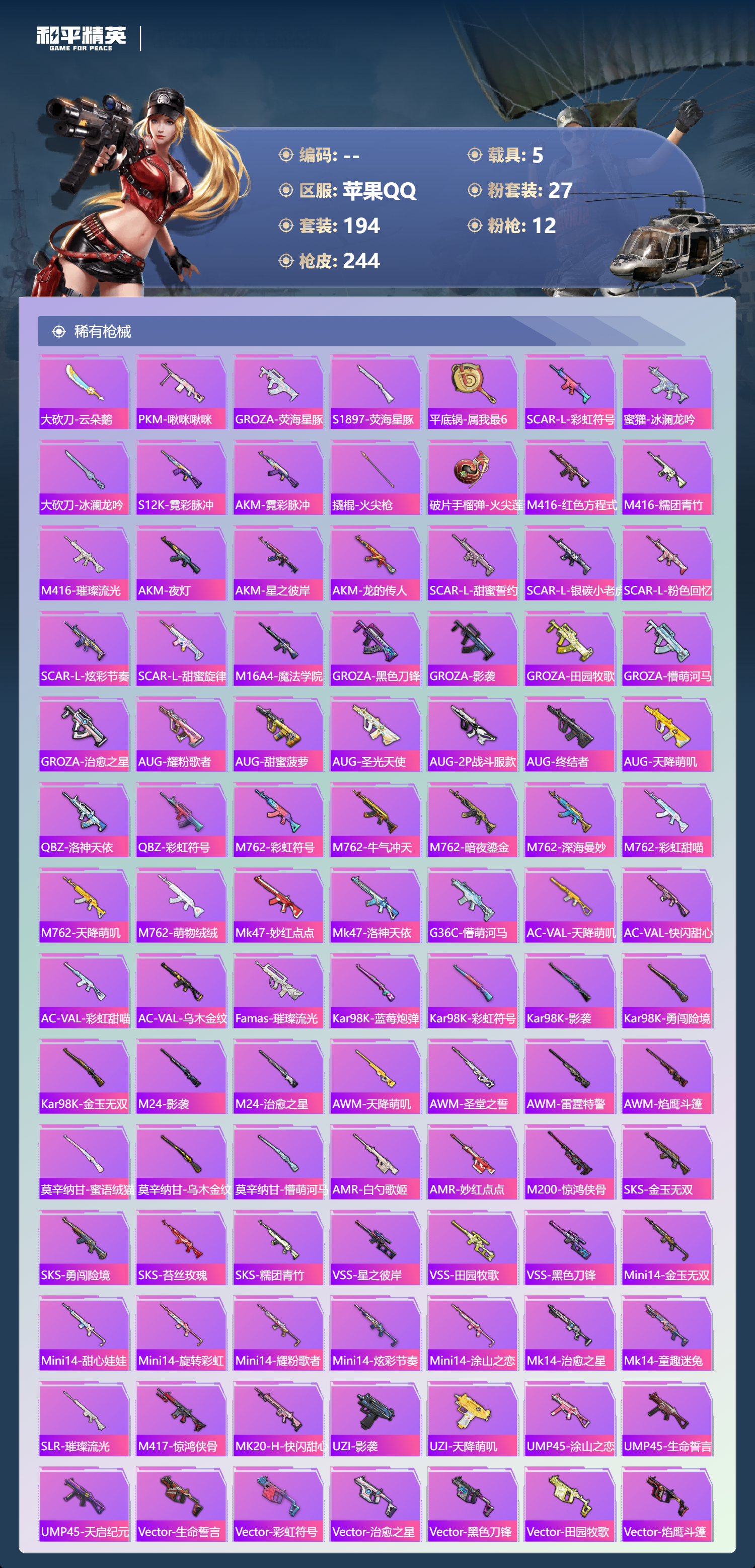 hs63724 苹果手Q-13王牌印记-3红装-27粉装-12特效枪-5载具-98815热力值-194套装-244枪皮-3卓越印记-1传奇印记