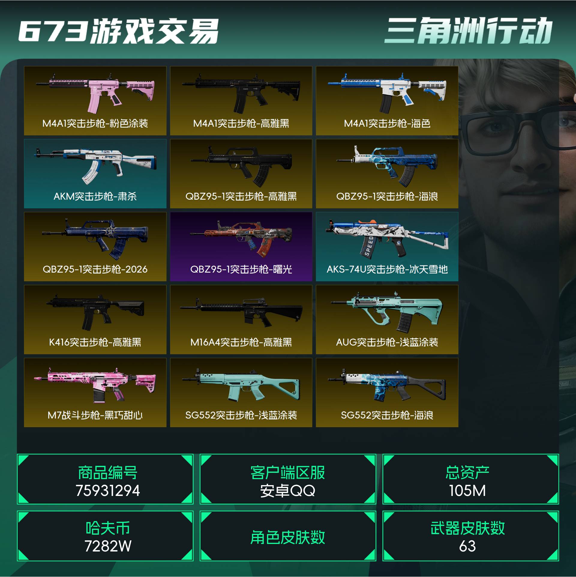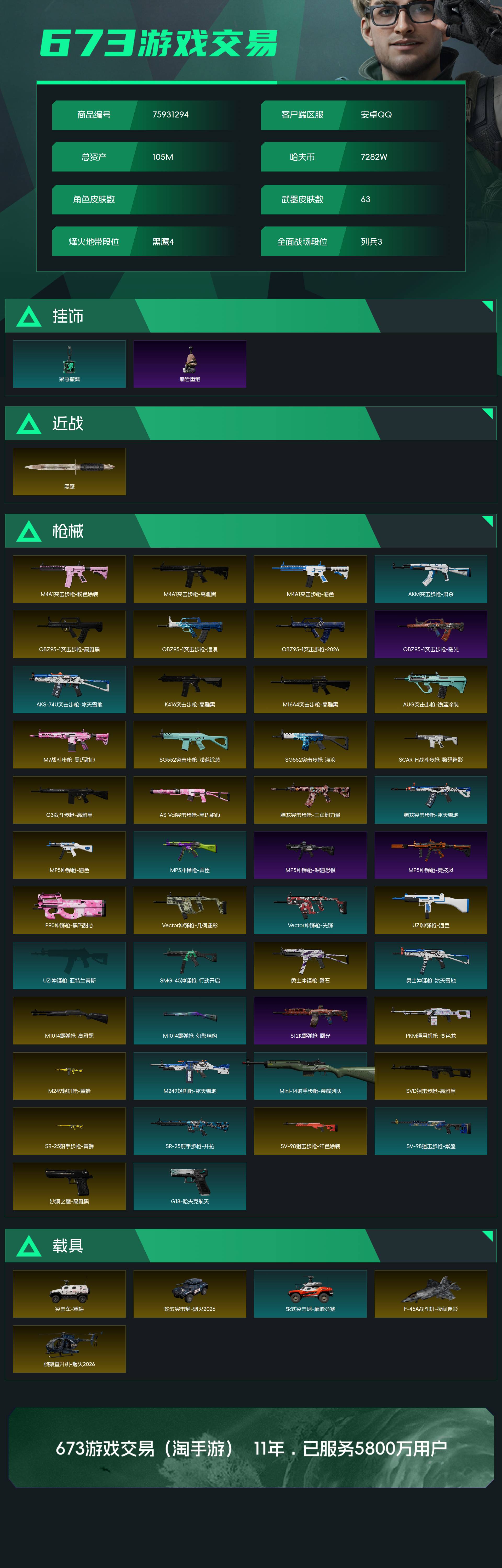 烽火段位黑鹰4 战场段位列兵3 总资产105M 哈夫币7282W 挂饰3 近战1 枪械63 载具8