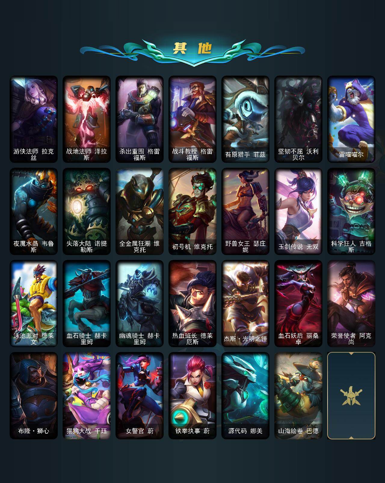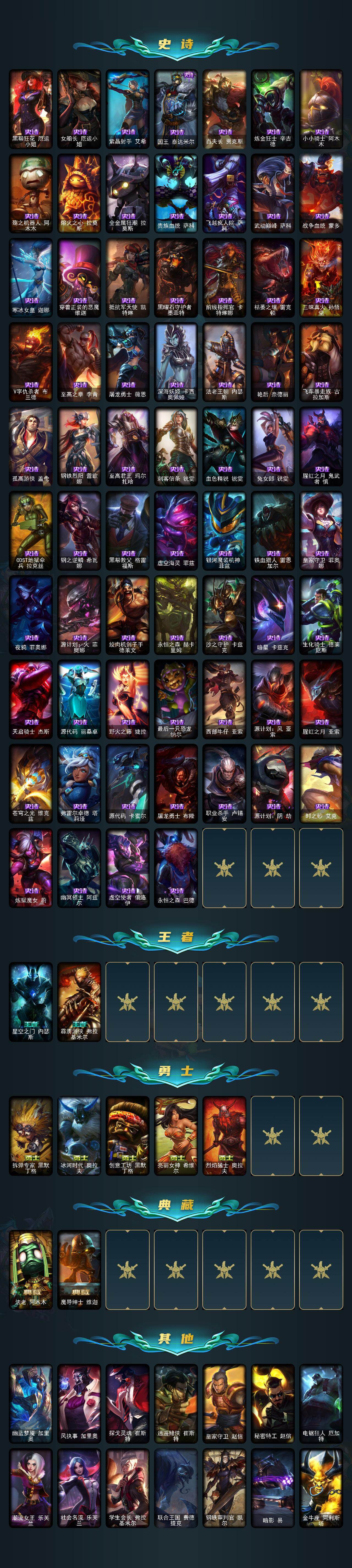 172英雄/292皮肤/3神话/35限定/4臻彩/49炫彩/25传说
