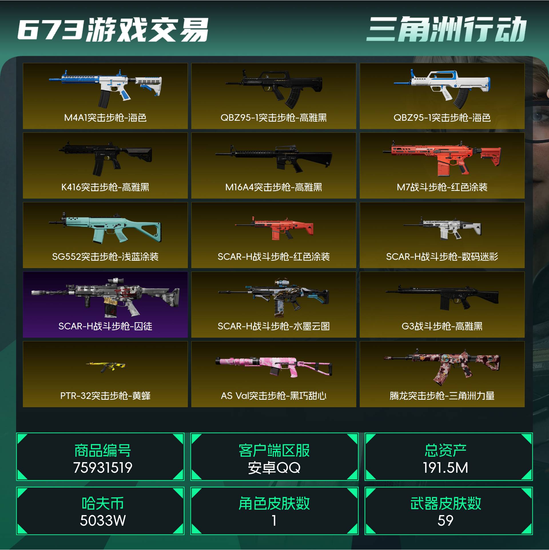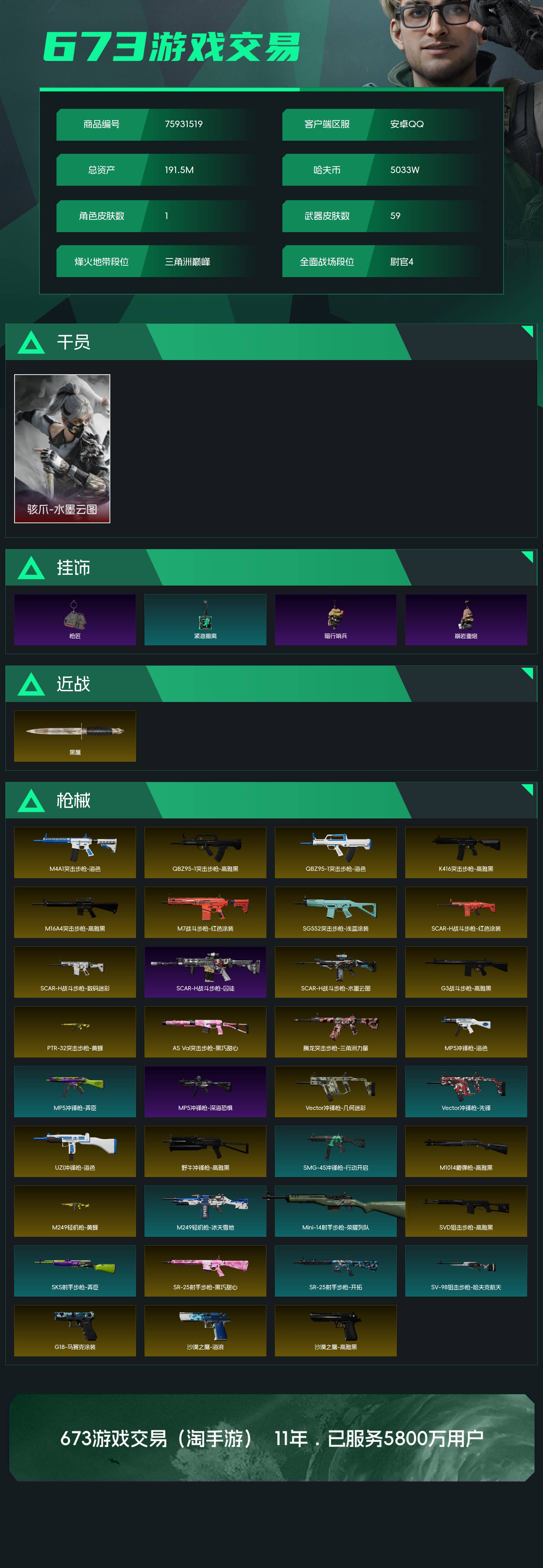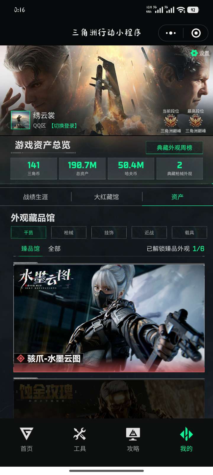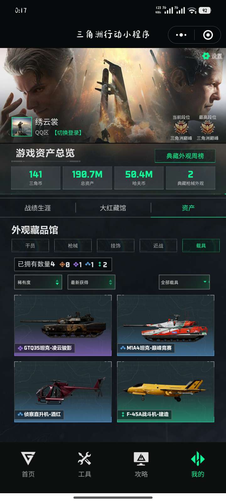 烽火段位三角洲巅峰 战场段位尉官4 总资产191.5M 哈夫币5033W 干员1 挂饰14 近战2 枪械59 载具4