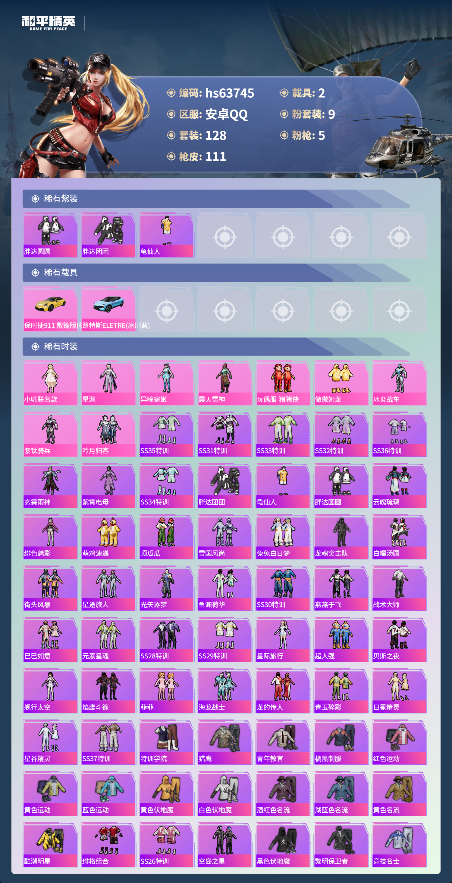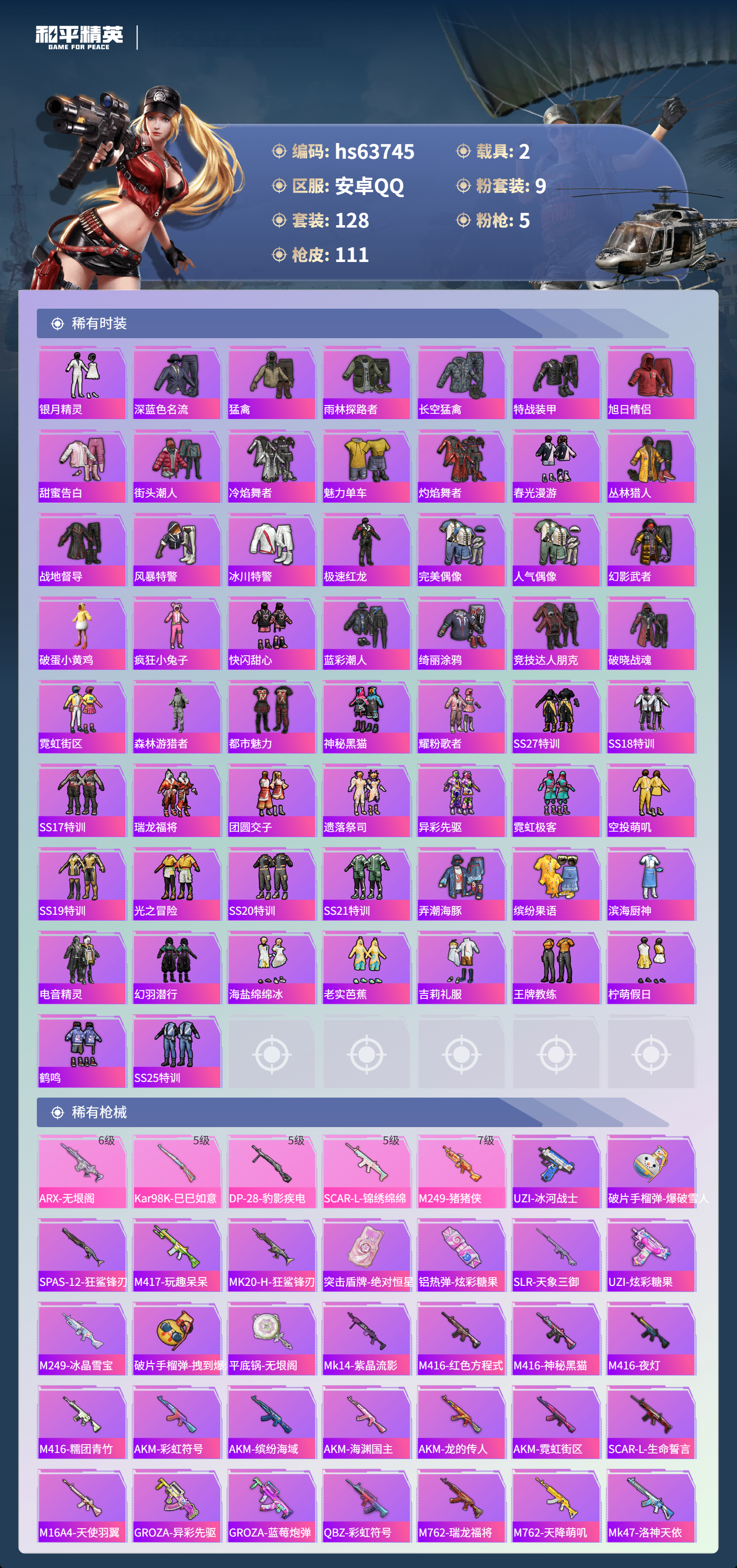 hs63745 安卓手Q-10王牌印记-9粉装-5特效枪-2载具-42980热力值-128套装-111枪皮-5卓越印记-1传奇印记