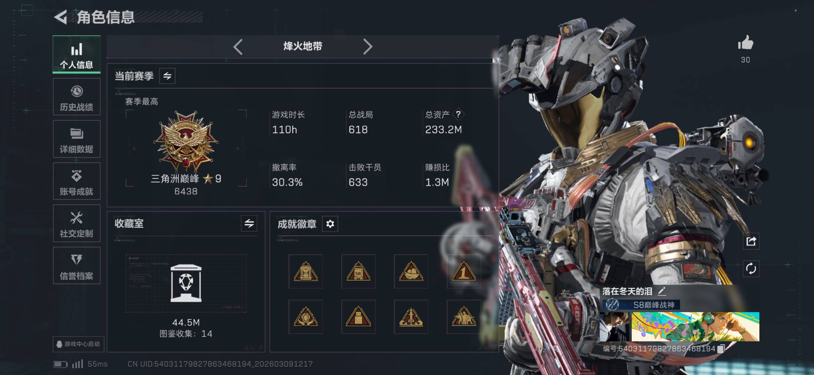 {特价出售}[ 赛季九格4月16号到期 ]等级:60总资产:233.2M 纯币440387 红皮:凌霄戍卫 骇爪联动 刀皮 信条 砖皮: 棱镜攻势S2优品C 悬赏令巨浪优品S 特勤处:仓库9,训练满,靶场满 部门44444 深蓝-不破誓约,红狼-电锯惊魂,露娜-金牌射手,乌鲁鲁-荒原猎手