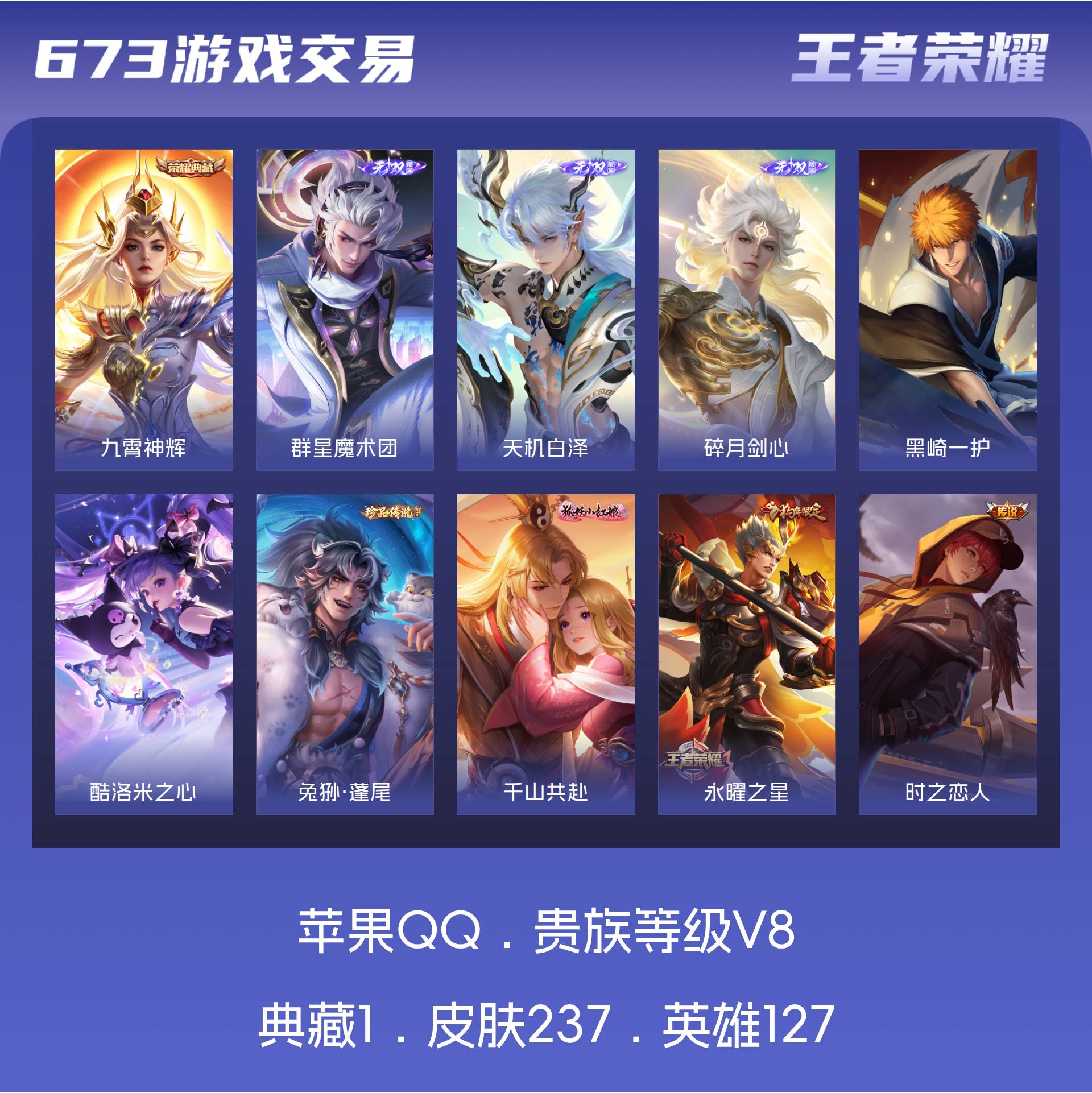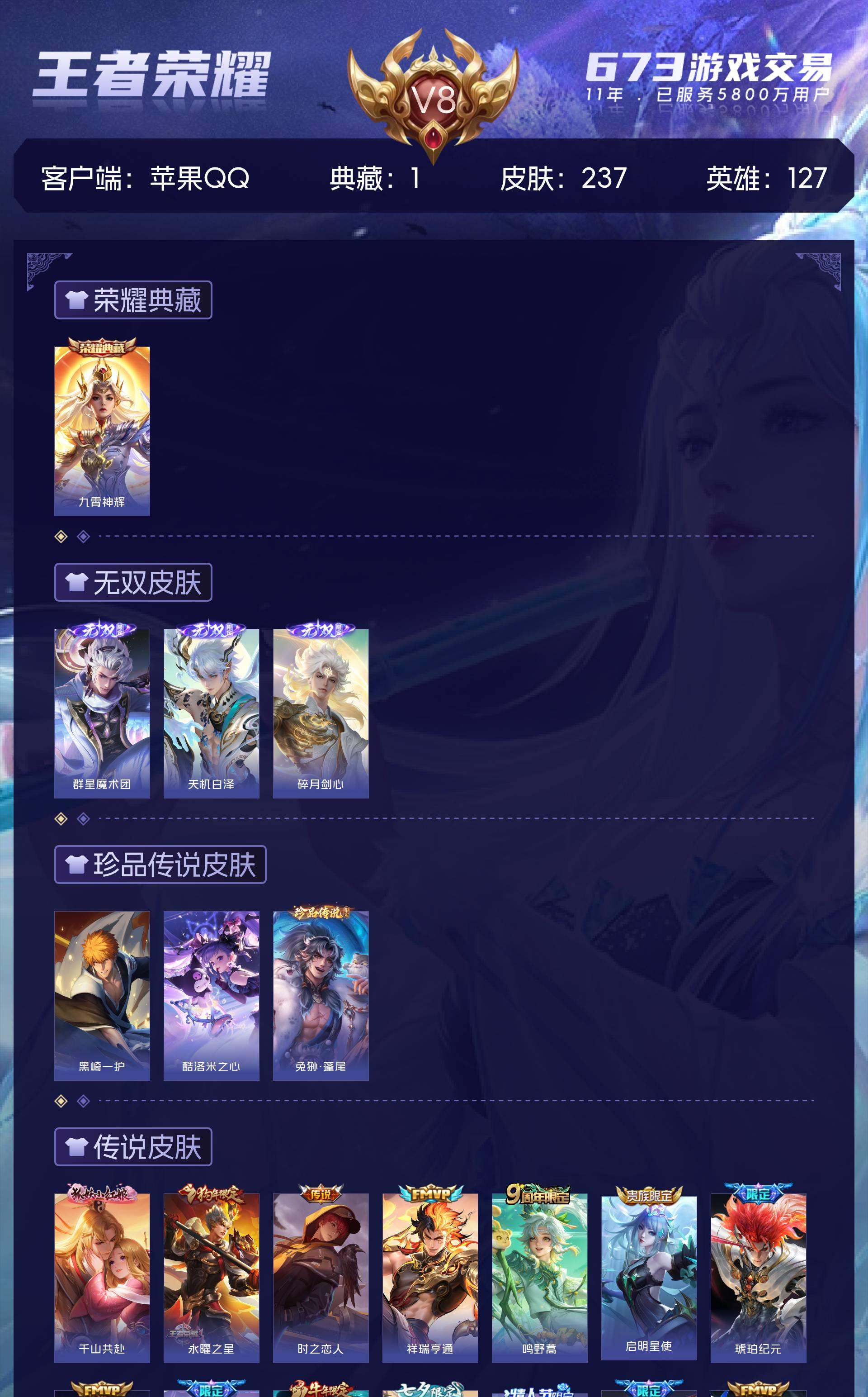 苹果QQ/至尊星耀/237皮肤/127英雄/1典藏/0珍品无双/3无双/3珍品传说/22传说/86史