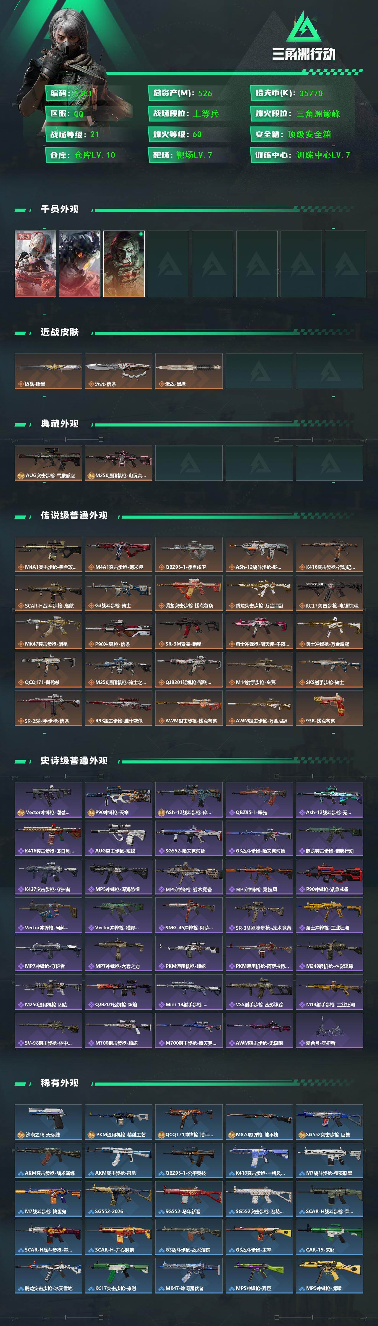 {特价出售}等级:60总资产:526m 纯币35770K 隐藏挂饰:1S黑夜猎手 红皮:威龙-凌霄戍卫/骇爪-维什戴尔 刀皮: 近战-暗星/近战-信条 砖皮: M250通用机枪-电玩高手S2(优品S)/AUG突击步枪-气象感应(优品B) 特勤处:仓库10,训练7,靶场7, 部门44444潜水2,292发.338AP,390发7.62×51AP,122发M61 红狼-电锯惊魂
