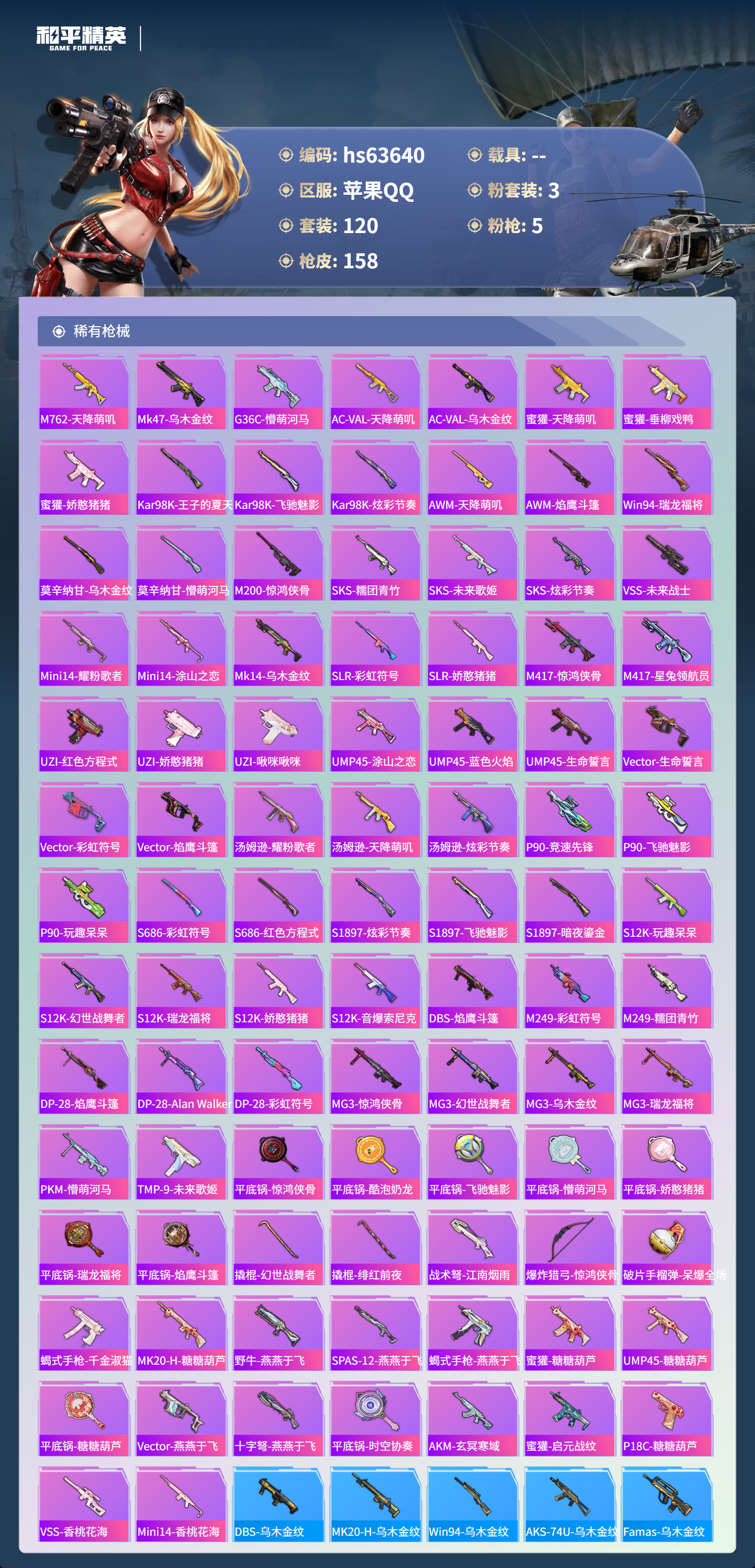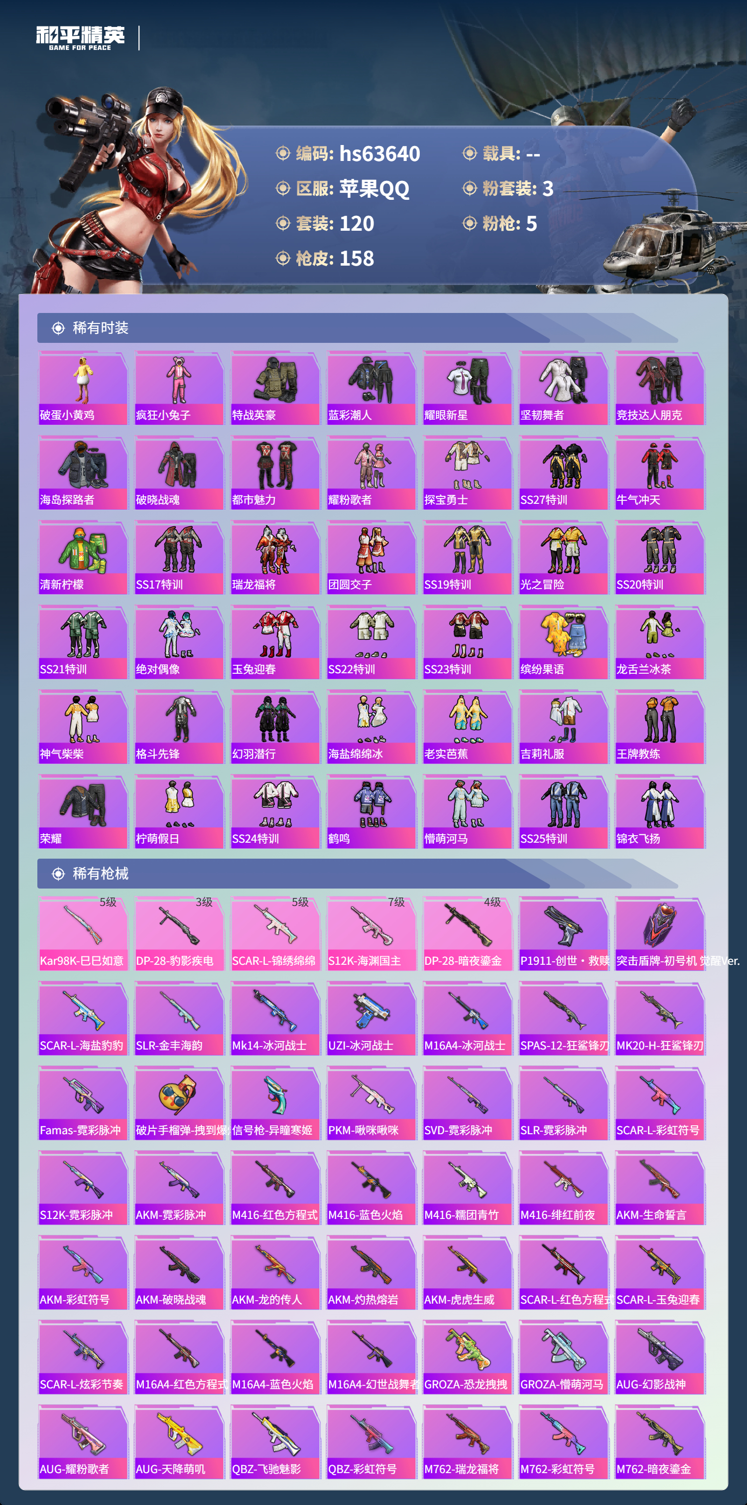 hs63640 苹果手Q-13王牌印记-3粉装-5特效枪-44674热力值-120套装-158枪皮