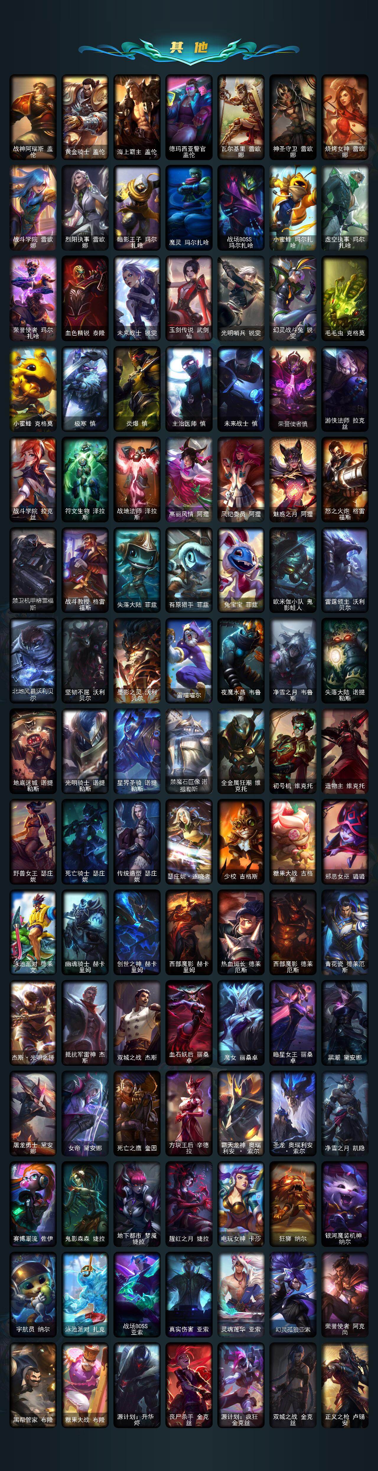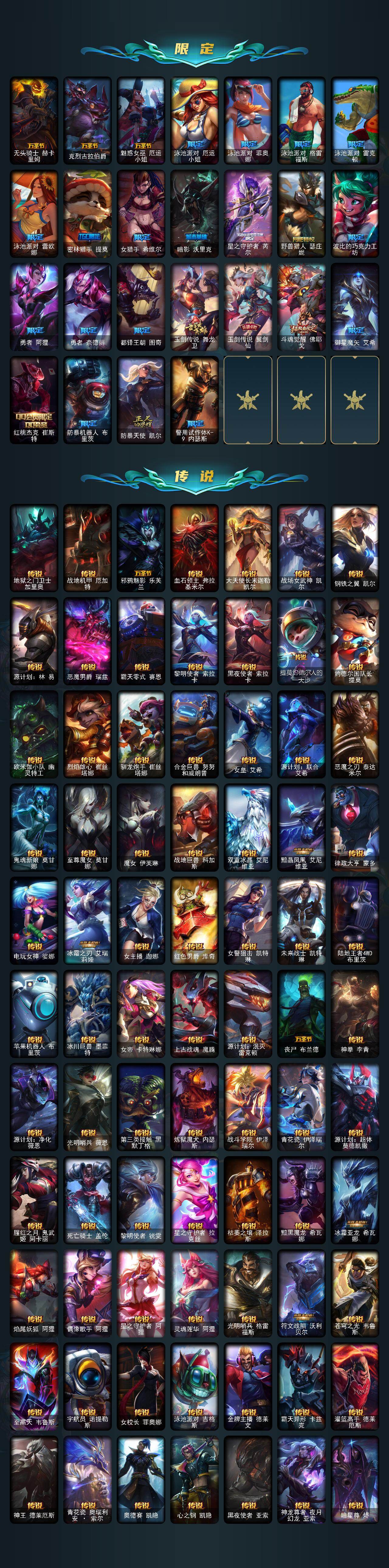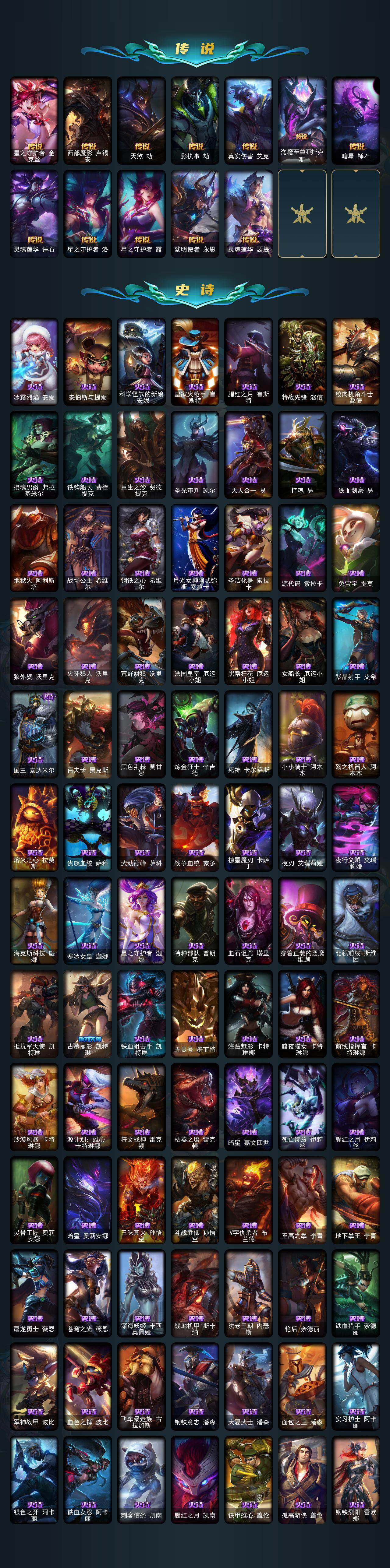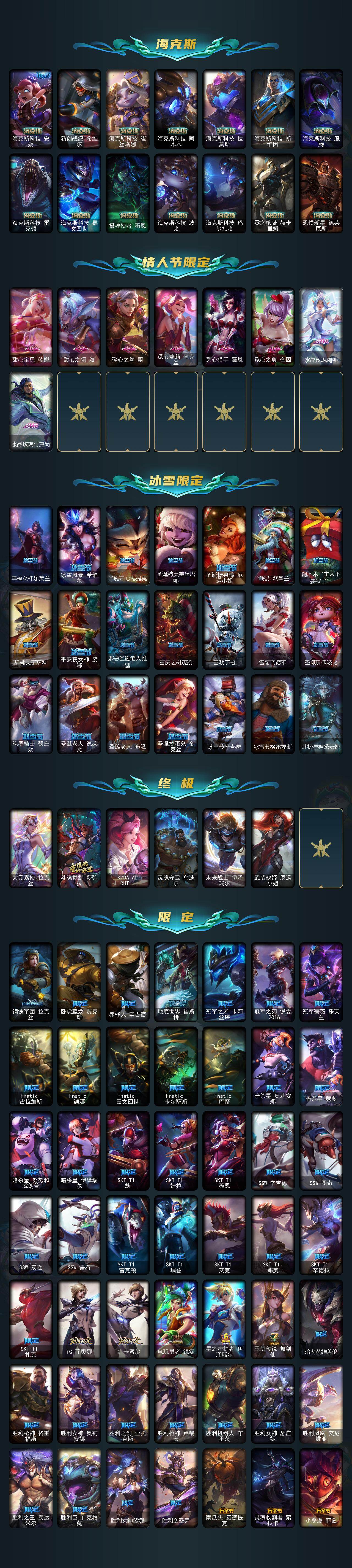 【神话皮肤】:十周年纪念安妮,殿堂传奇乐芙兰,十五周年纪念希维尔,水晶圣骑艾希,新卧虎藏龙贾克斯,暗星科加斯,神凰行者瑞羽圣凰艾尼维亚,水晶掠夺者卡兹克,永恒之森奥恩,海克斯科技阿木木,海克斯科技安妮,海克斯科技波比,海克斯科技崔丝塔娜,海克斯科技嘉文四世,海克斯科技拉莫斯,海克斯科技雷克顿,海克斯科技玛尔扎哈,海克斯科技魔腾,海克斯科技斯维因,恐惧新星德莱厄斯,零之枪骑赫卡里姆,摄魂使者薇恩,新