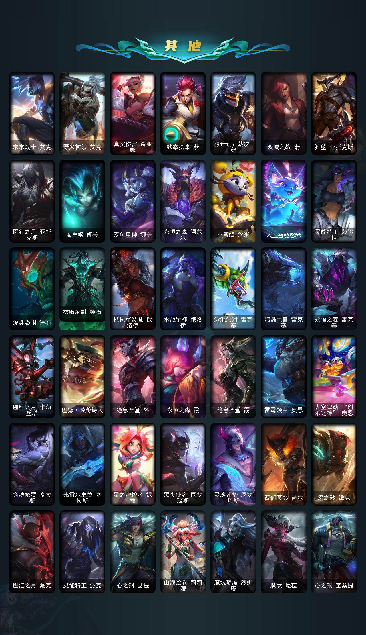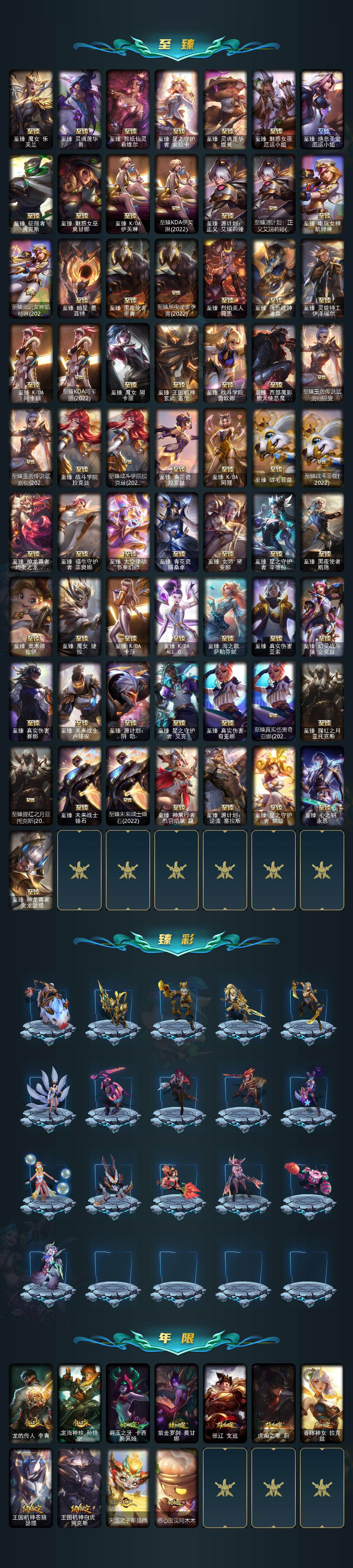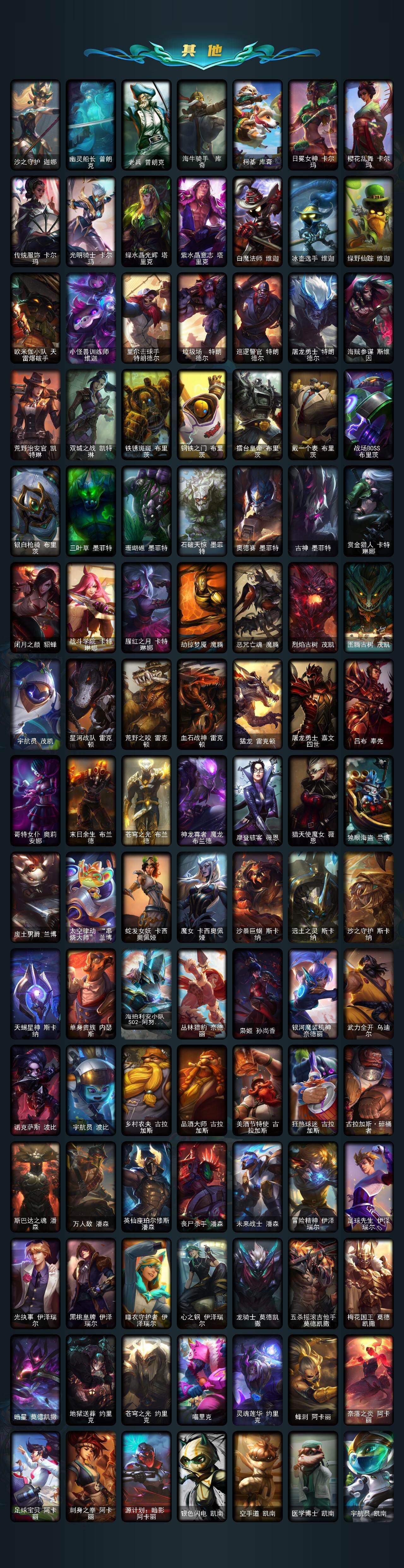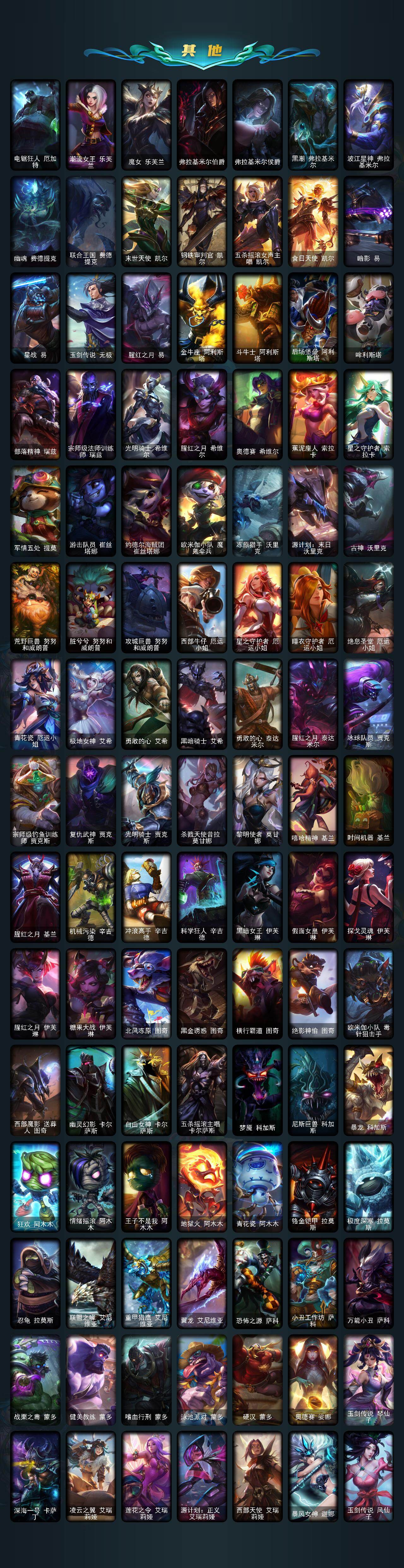 【神话皮肤】:十周年纪念安妮,殿堂传奇乐芙兰,十五周年纪念希维尔,水晶圣骑艾希,新卧虎藏龙贾克斯,暗星科加斯,神凰行者瑞羽圣凰艾尼维亚,水晶掠夺者卡兹克,永恒之森奥恩,海克斯科技阿木木,海克斯科技安妮,海克斯科技波比,海克斯科技崔丝塔娜,海克斯科技嘉文四世,海克斯科技拉莫斯,海克斯科技雷克顿,海克斯科技玛尔扎哈,海克斯科技魔腾,海克斯科技斯维因,恐惧新星德莱厄斯,零之枪骑赫卡里姆,摄魂使者薇恩,新