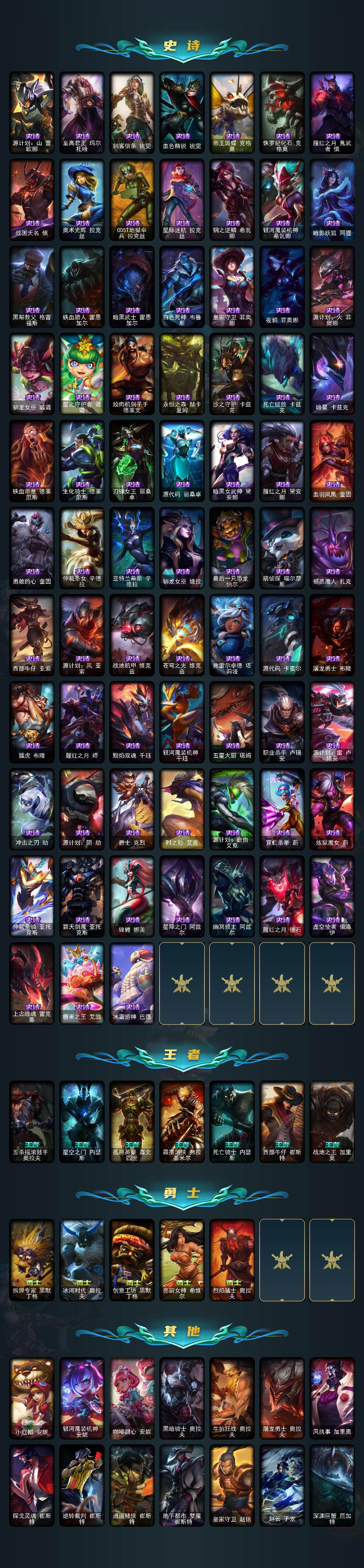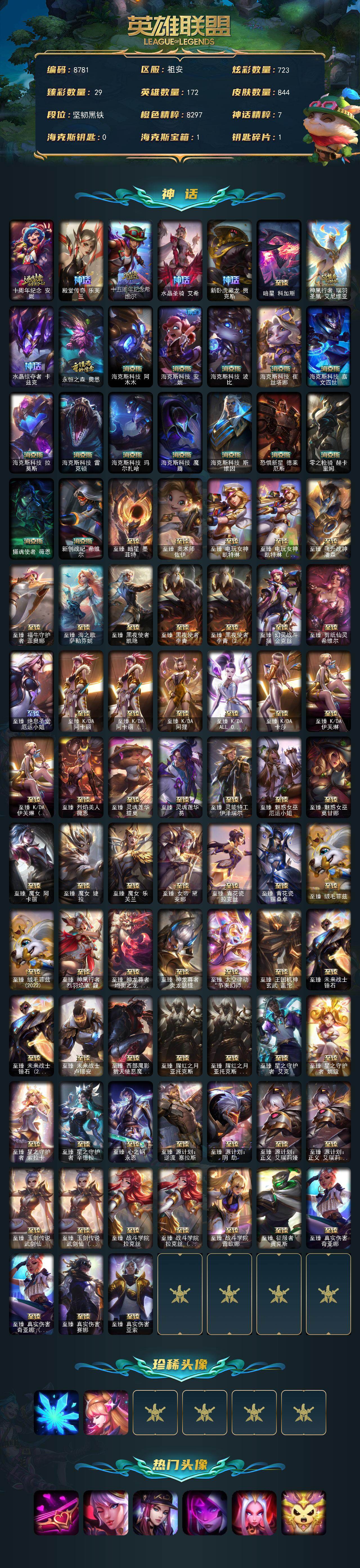 未定级段位-172英雄-844皮肤-723炫彩-8终极-87神话-115限定-89传说-164史诗
