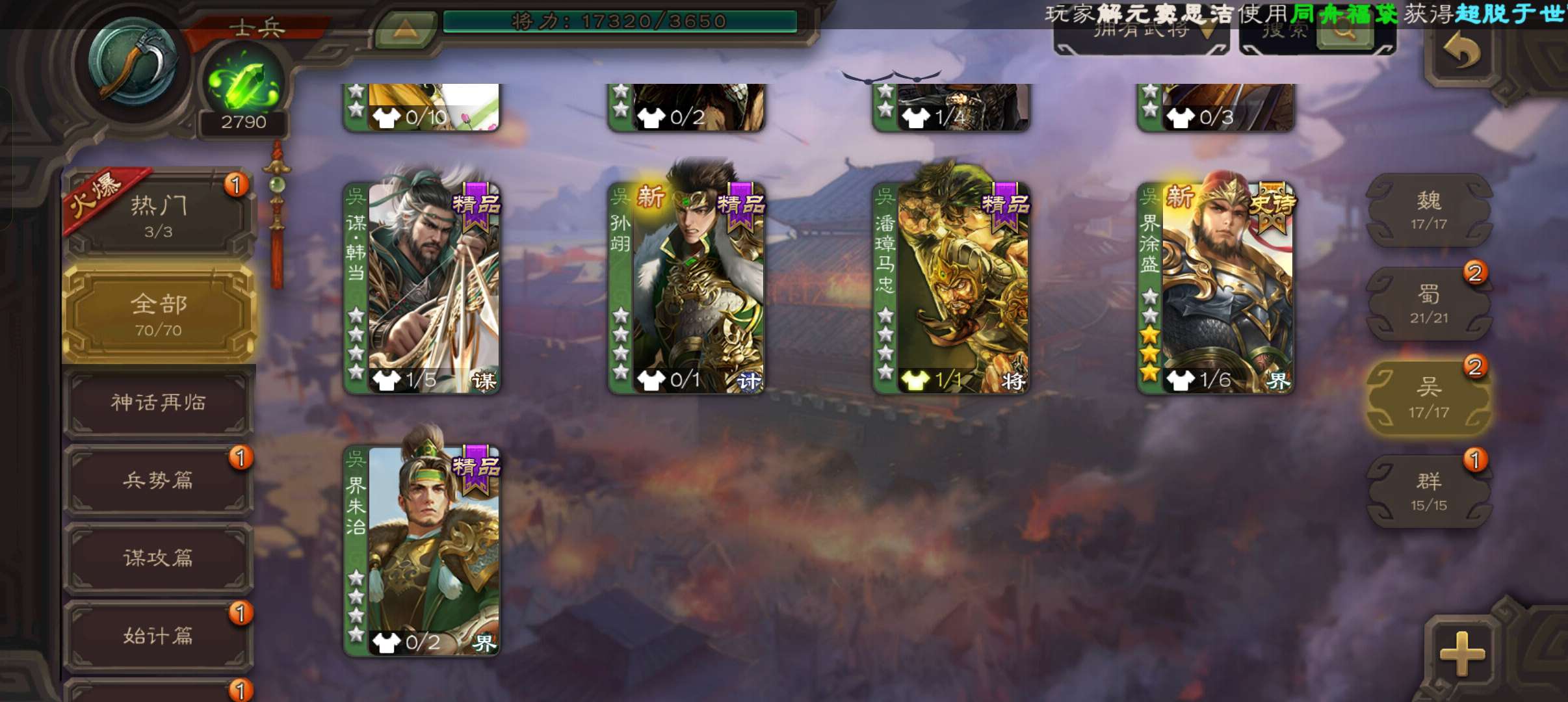 70将超级兵,6.5万羽毛2800将魂,大宝界徐盛神赵云花鬘谯周4史诗,甘夫人谋韩当,112令