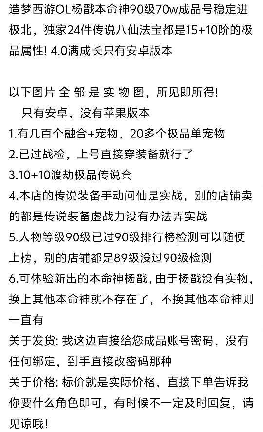 造梦西游OL杨戬本命神90级70w成品号稳定进极北,独家24件八仙15+10阶的极品属性全角色任选。