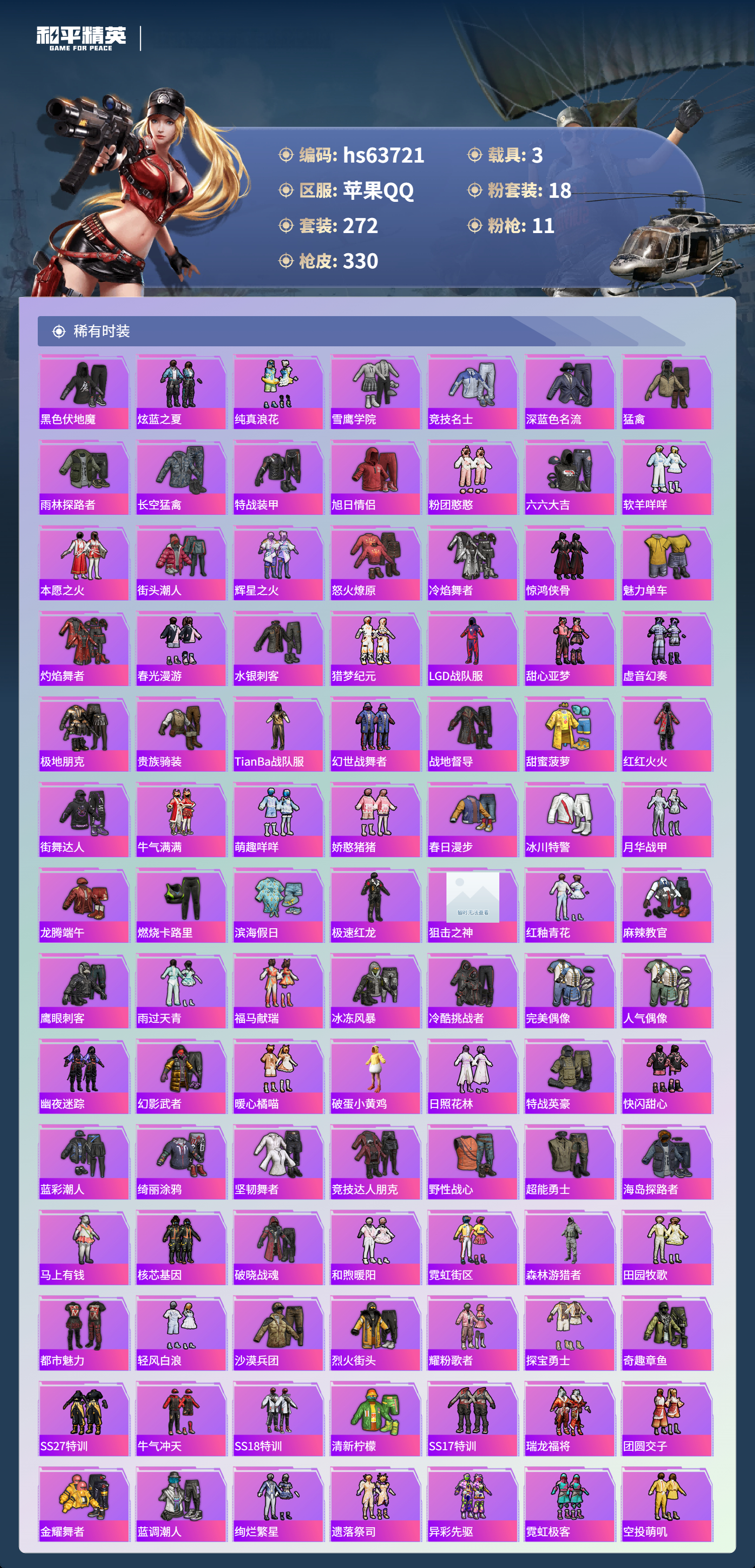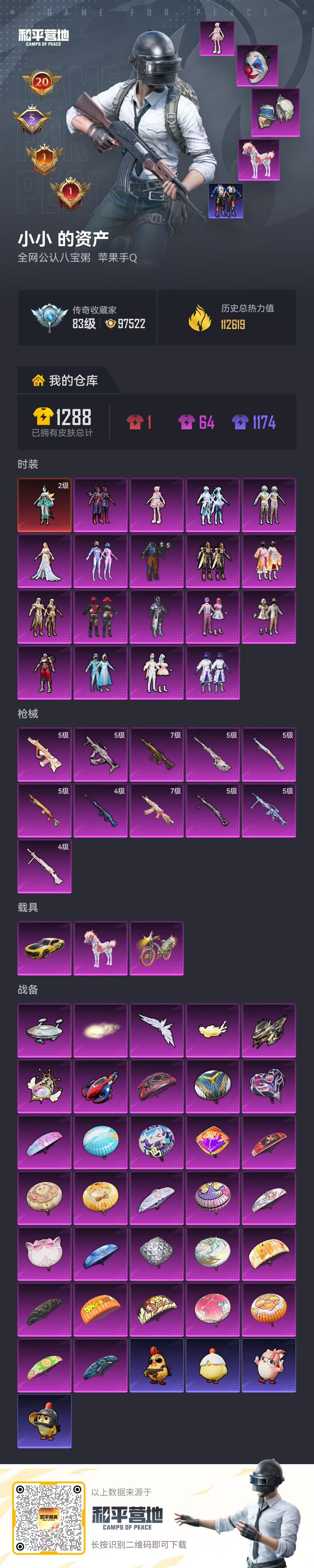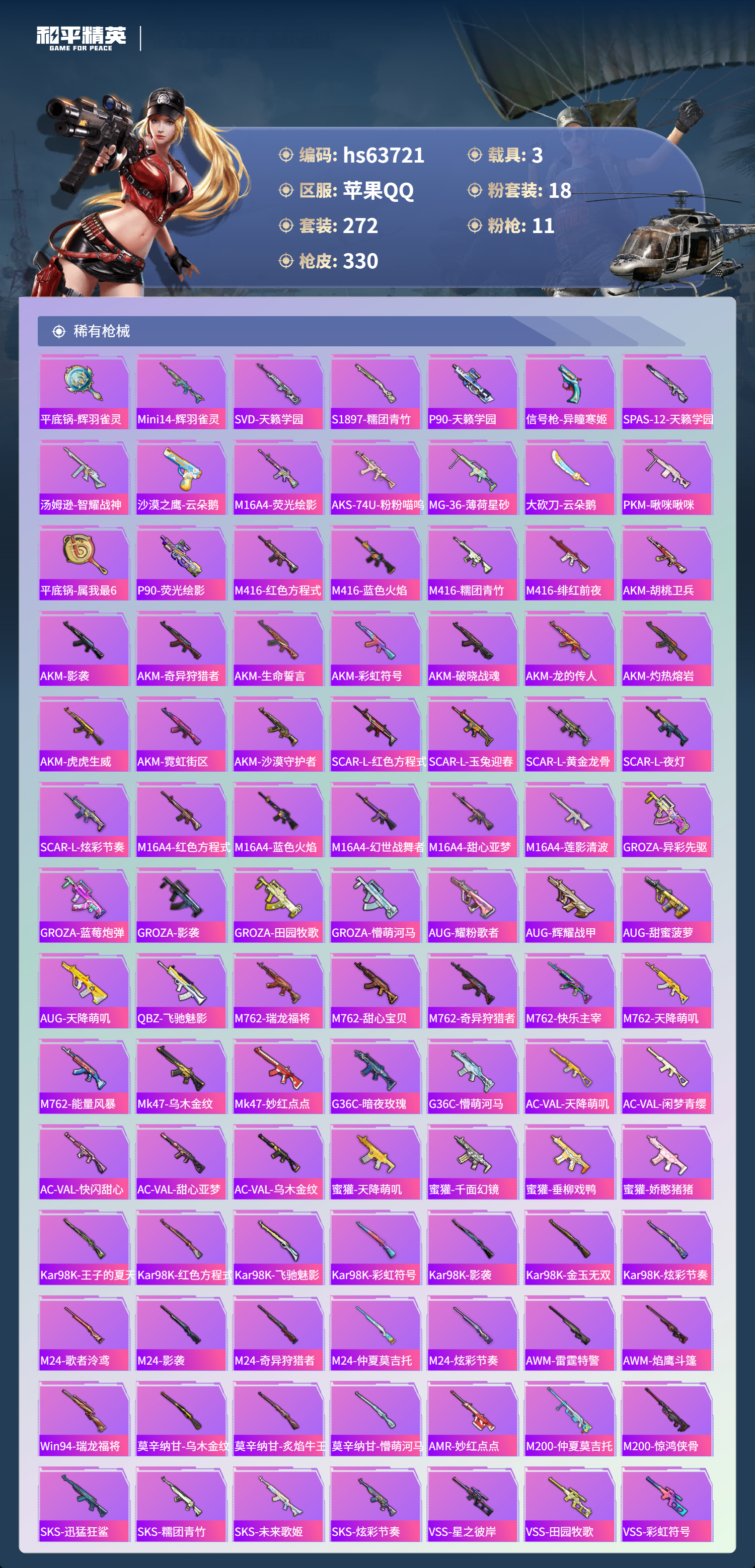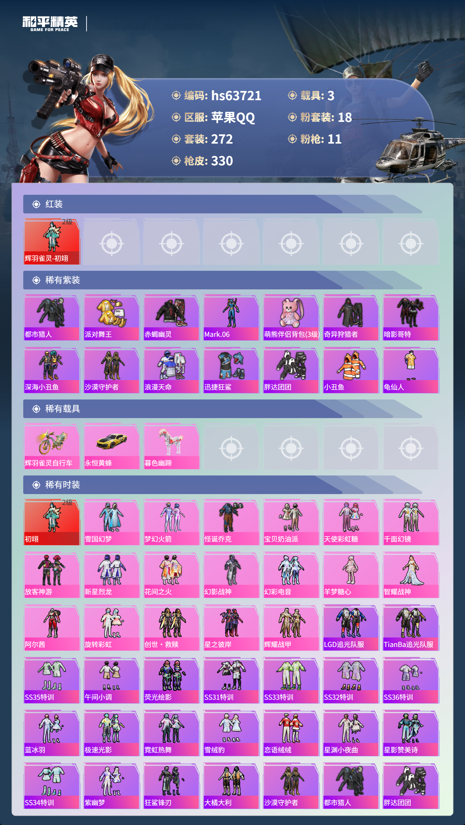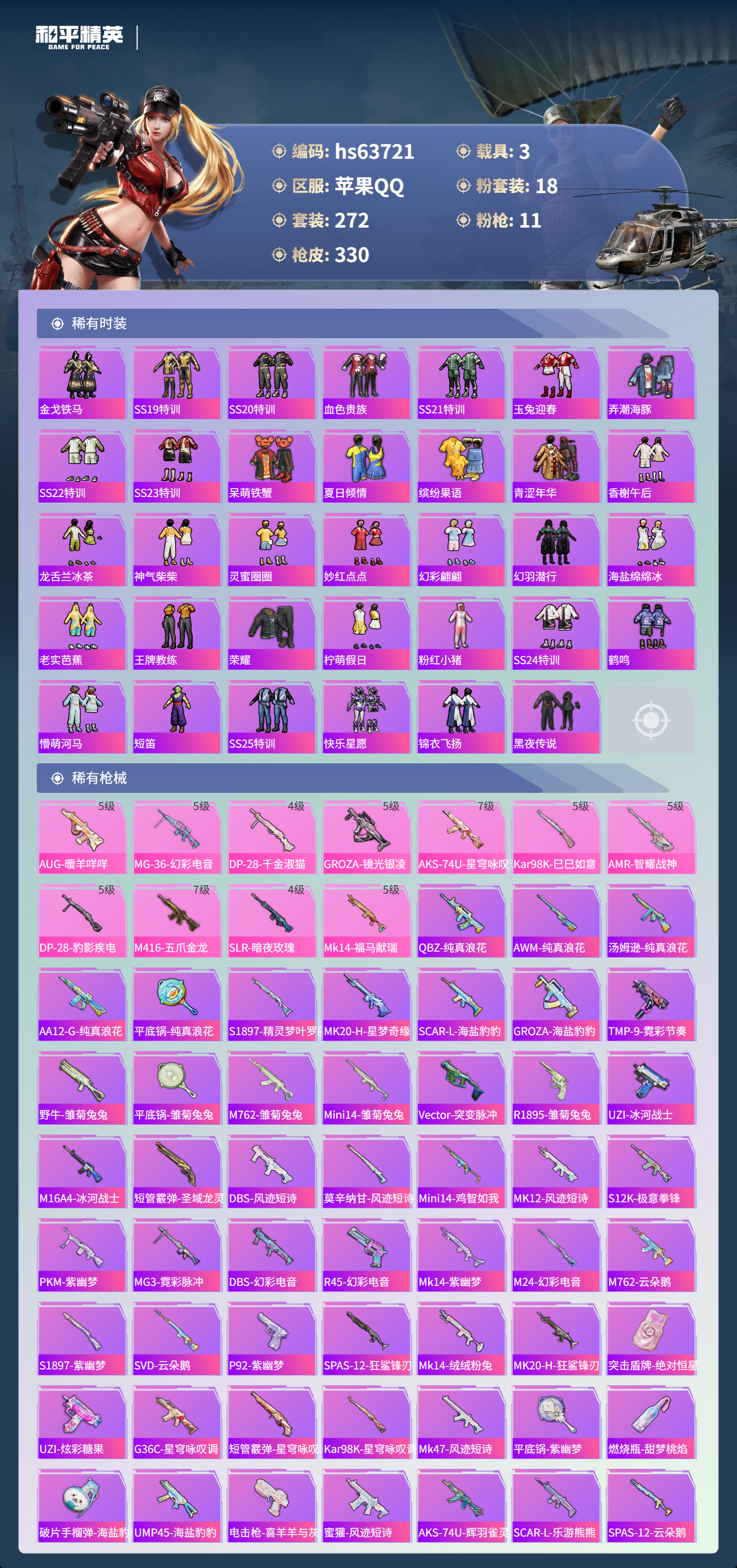 hs63721 苹果手Q-20王牌印记-1红装-18粉装-11特效枪-3载具-热力值-272套装-330枪皮-5卓越印记-1传奇印记