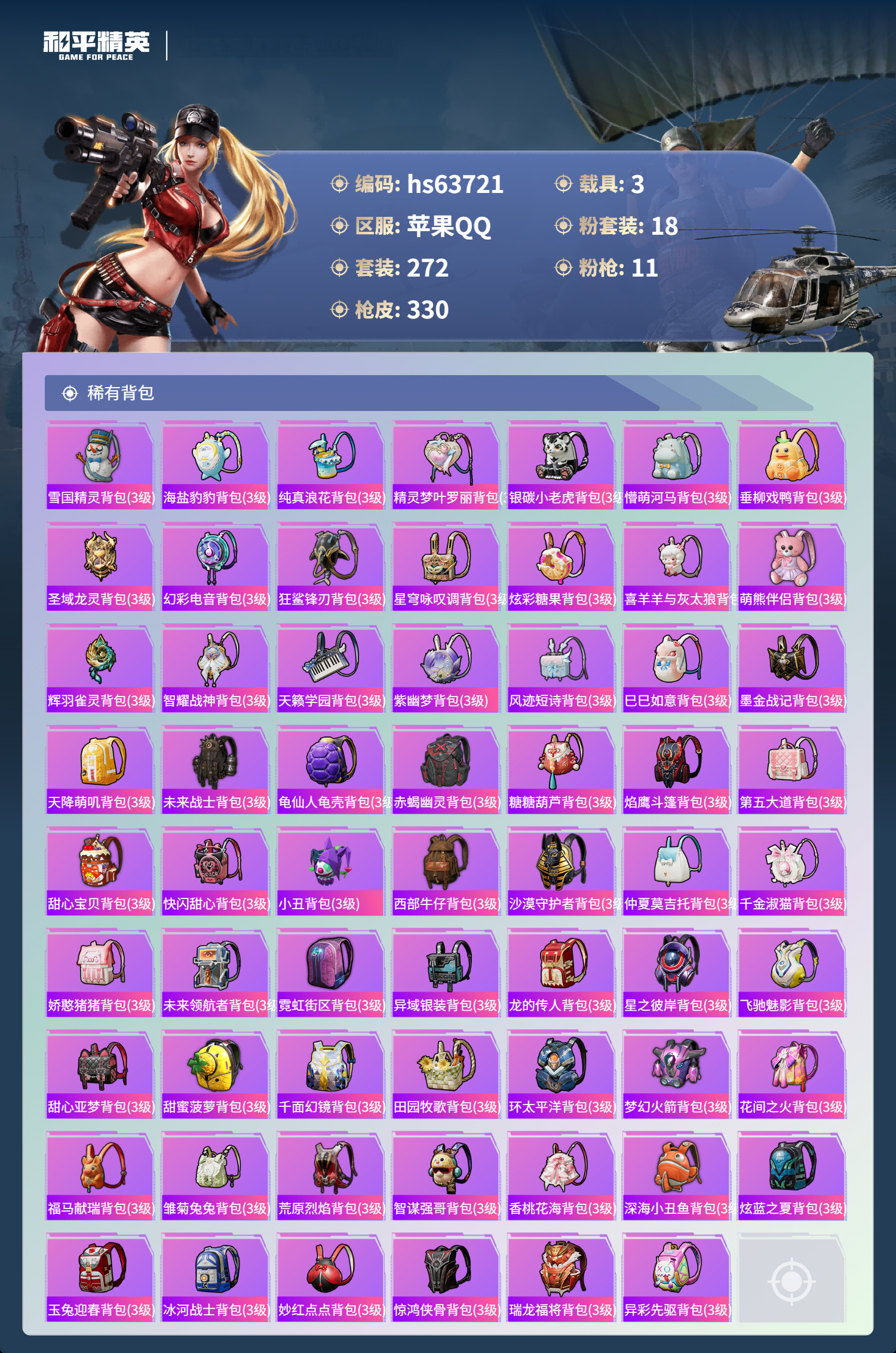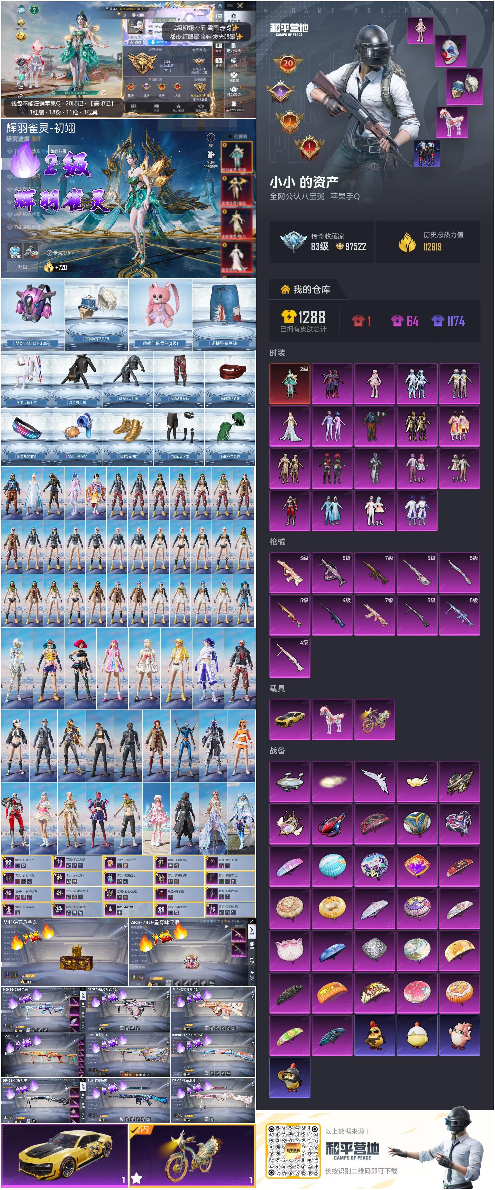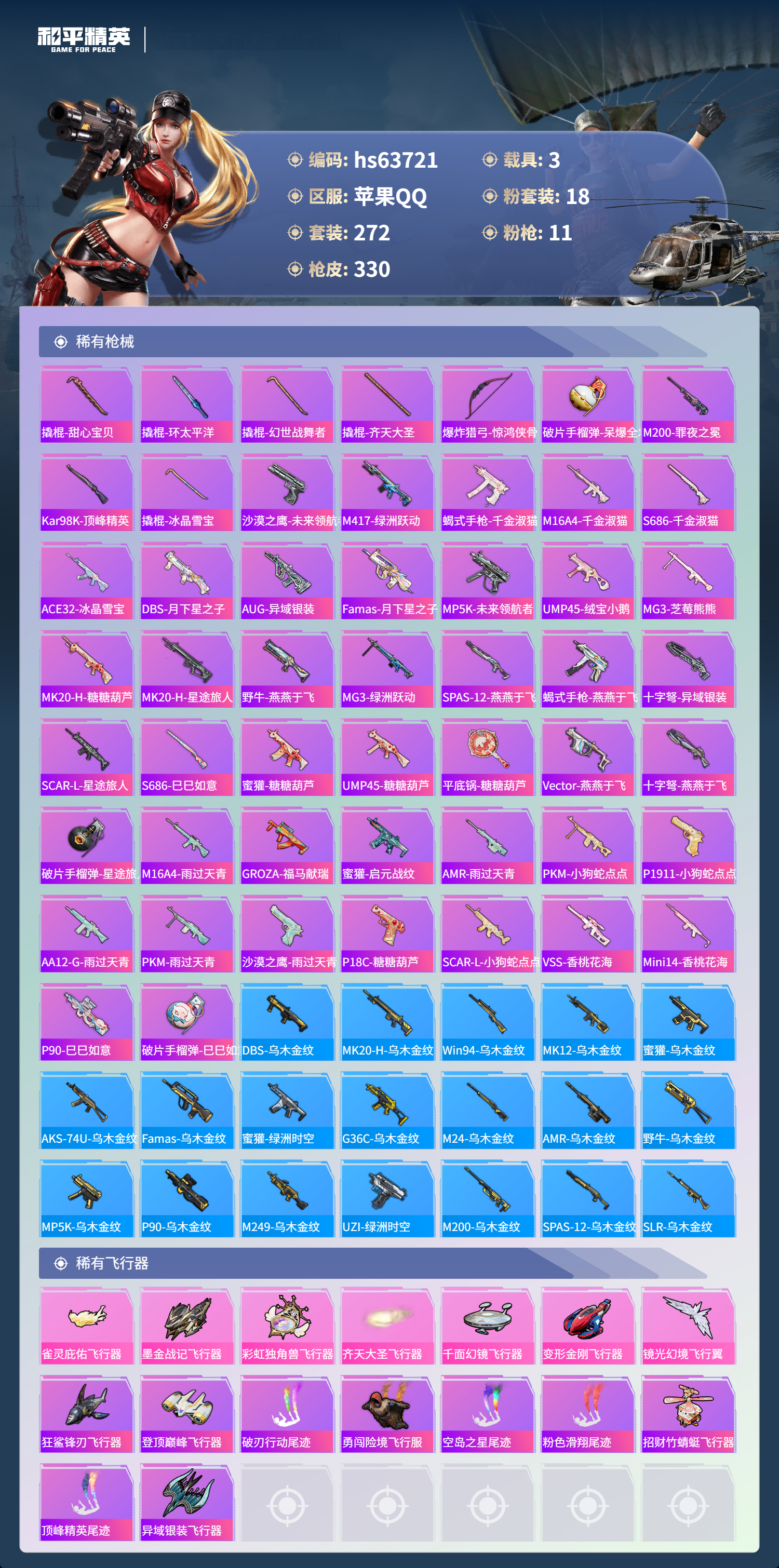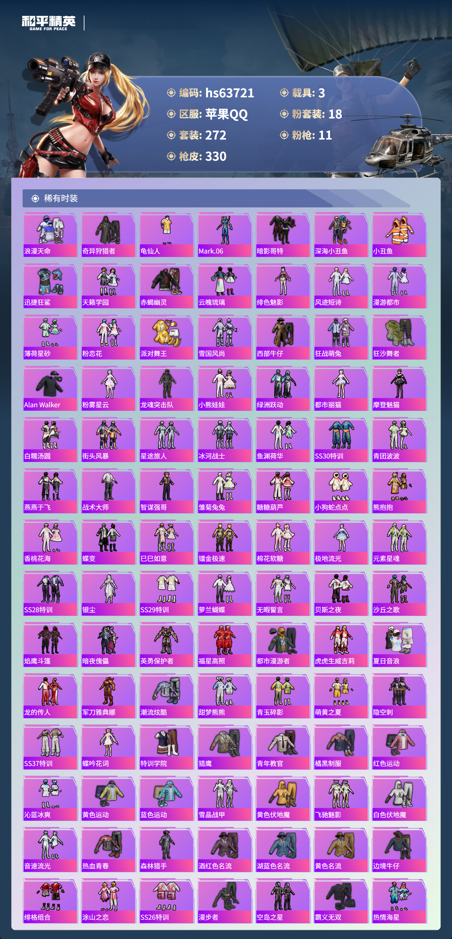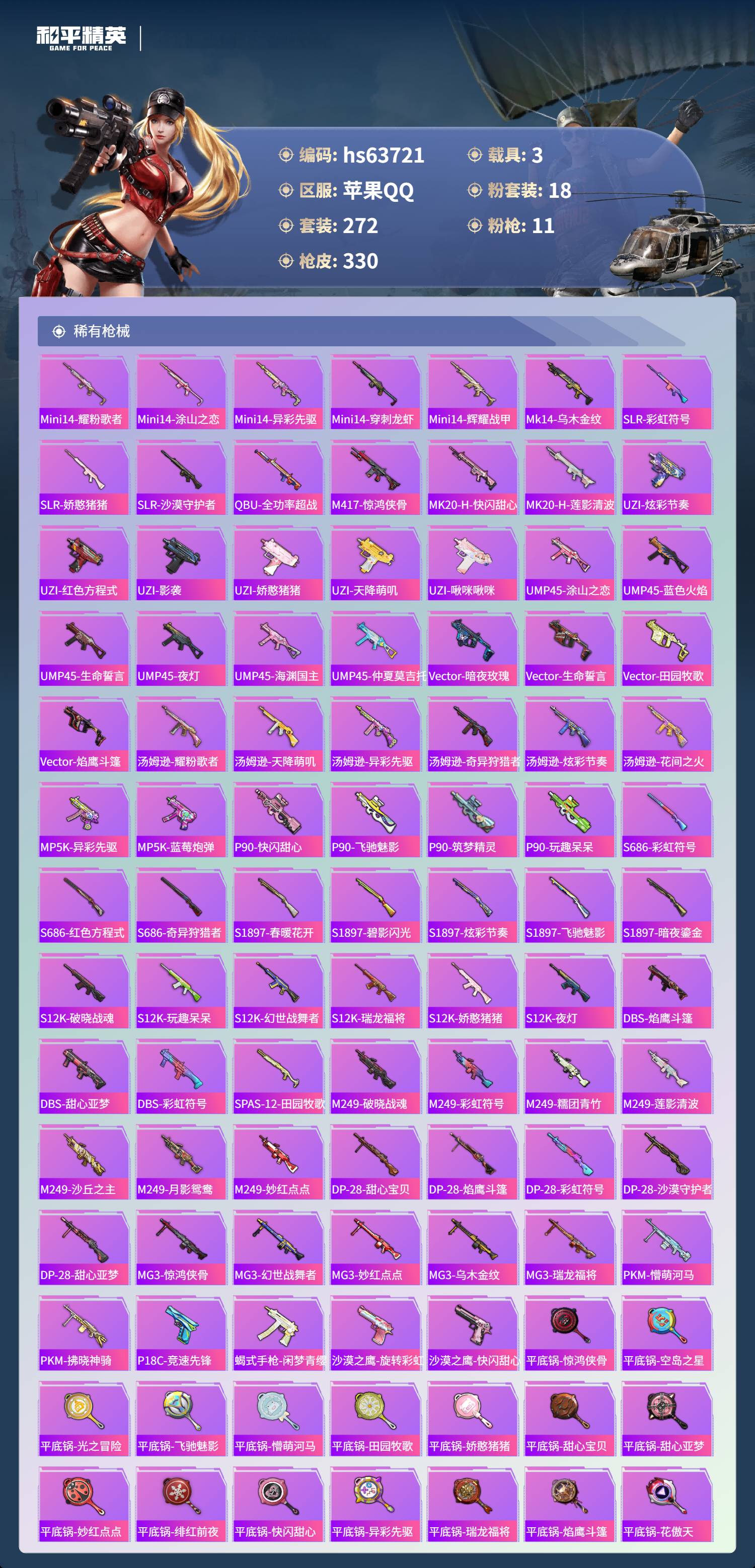 hs63721 苹果手Q-20王牌印记-1红装-18粉装-11特效枪-3载具-热力值-272套装-330枪皮-5卓越印记-1传奇印记