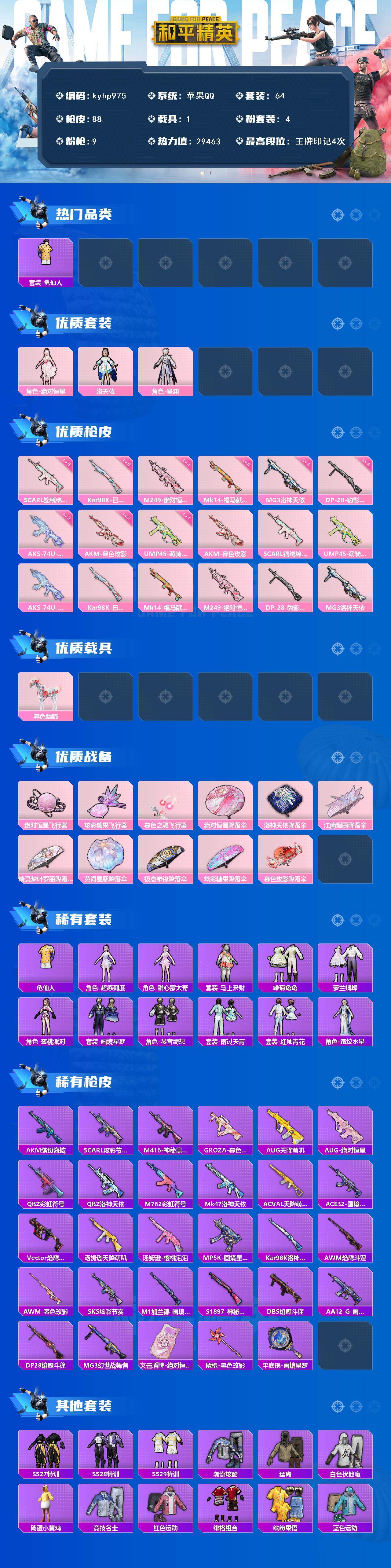 苹果 手Q-4粉装-9特效枪-1载具-3粉色飞行器-29463热力值-4王牌印记-64套装-88枪皮