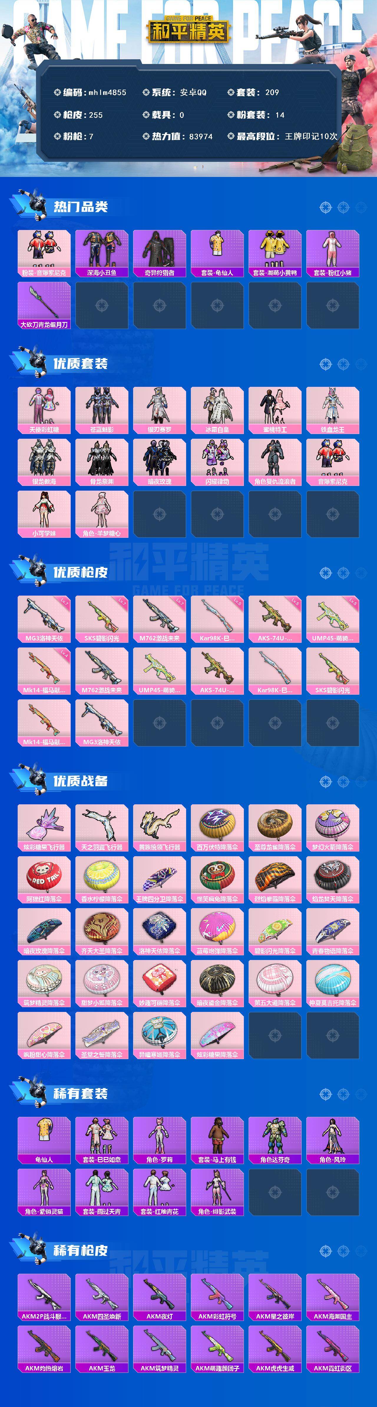 安卓 手Q-14粉装-7特效枪-0载具-3粉色飞行器-83974热力值-10王牌印记-209套装-255枪皮