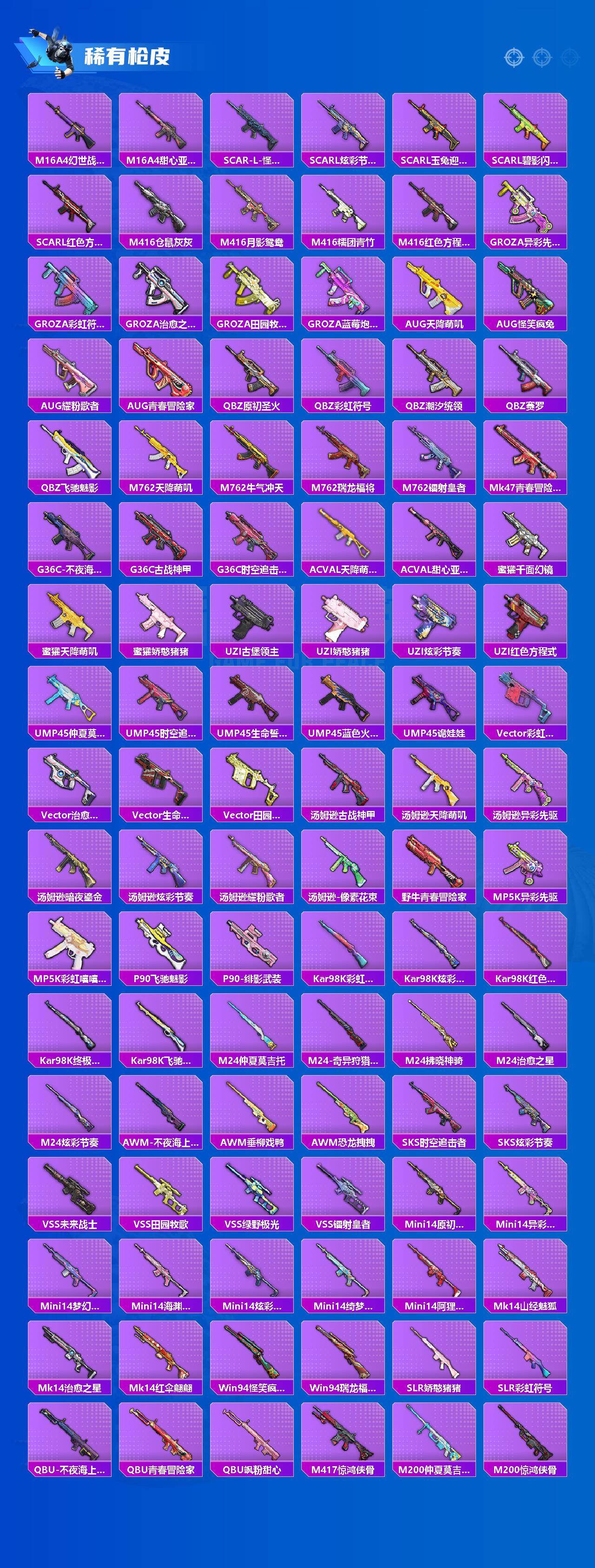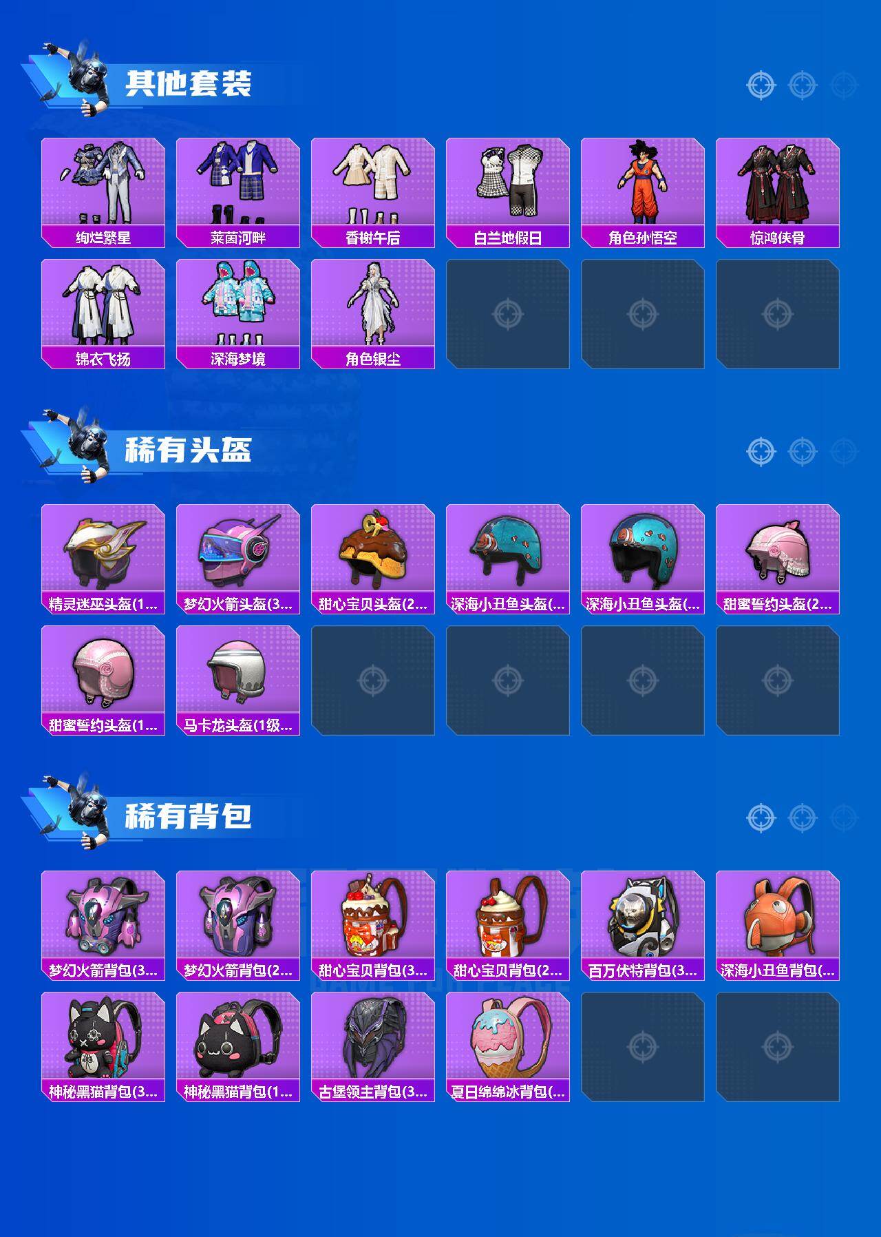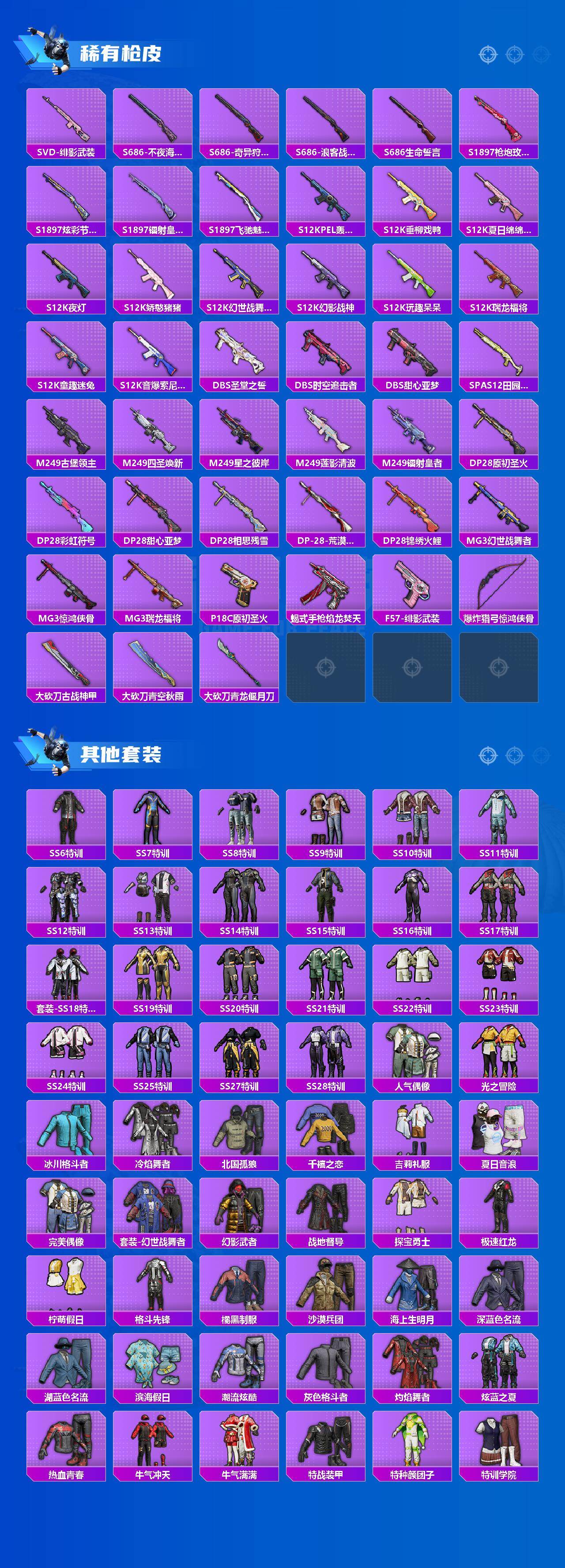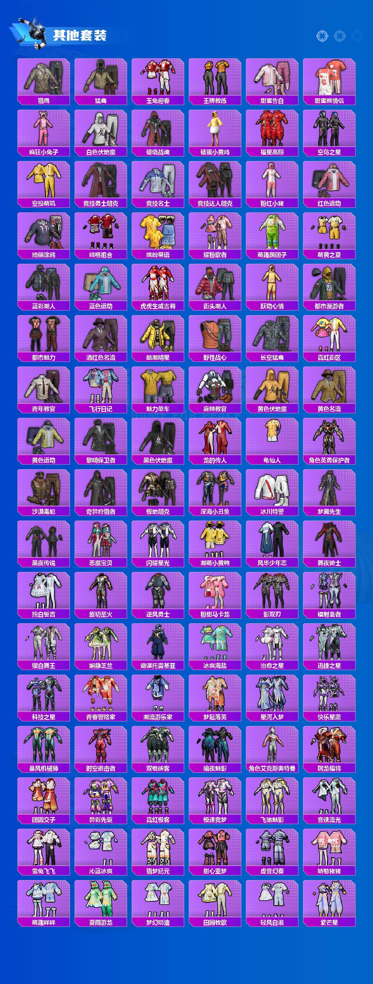 【粉色套装】:粉装-天使彩虹糖,粉装-苍蓝魅影,粉装-银刃赛罗,粉装-冰霜白皇,粉装-蜜桃特工,粉装-铁血龙王,粉装-银龙傲海,粉装-骨龙祭渊,粉装-暗夜玫瑰,粉装-闪耀律动,角色-复仇流浪者,粉装-音爆索尼克,角色-小可学妹,角色-羊梦糖心