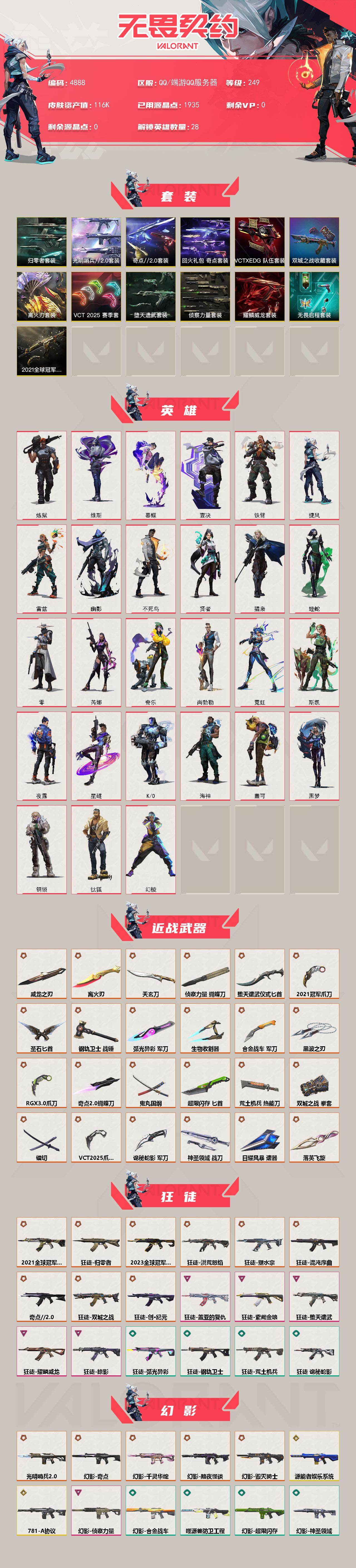 【套装】:离火刃套装,2021全球冠军赛套装,VCT 2025 赛季套装,离火刃套装,《双城之战》收藏套装,光明哨兵//2.0套装,奇点//2.0套装,归零者套装,VCTxEDG 队伍套装,回火礼包:奇点套装,侦察力量套装,堕天遗武套装,耀鳞威龙套装,无畏启程套装