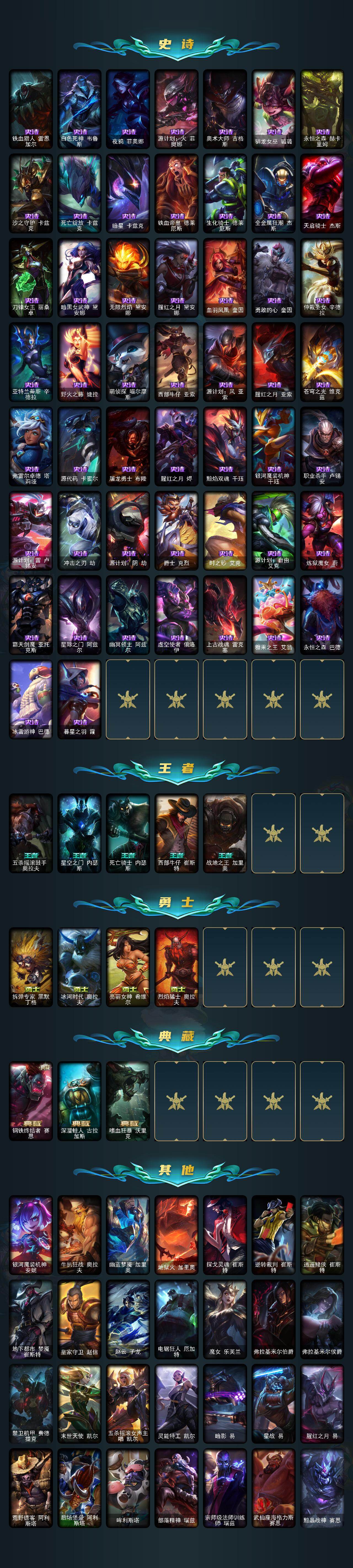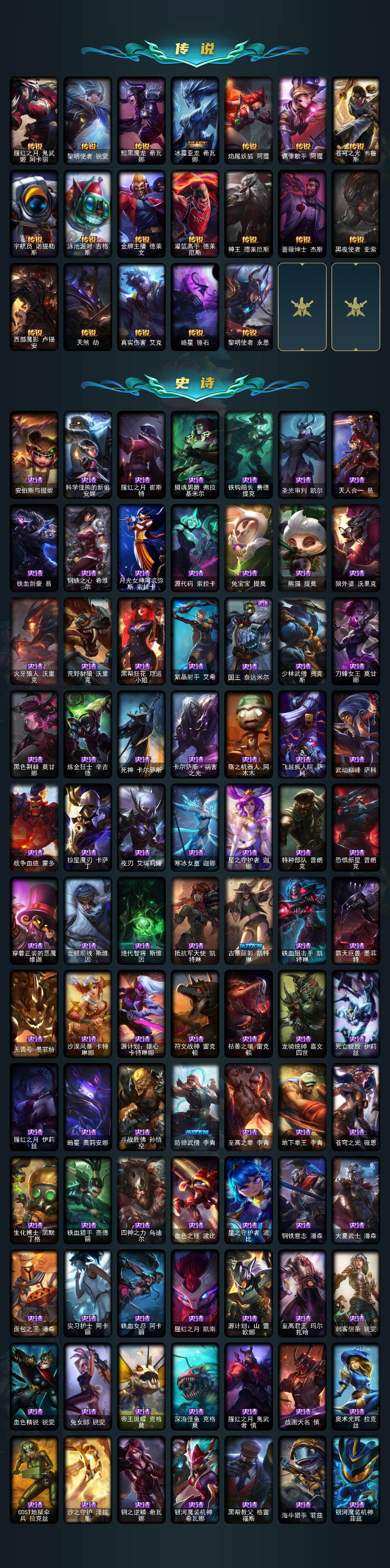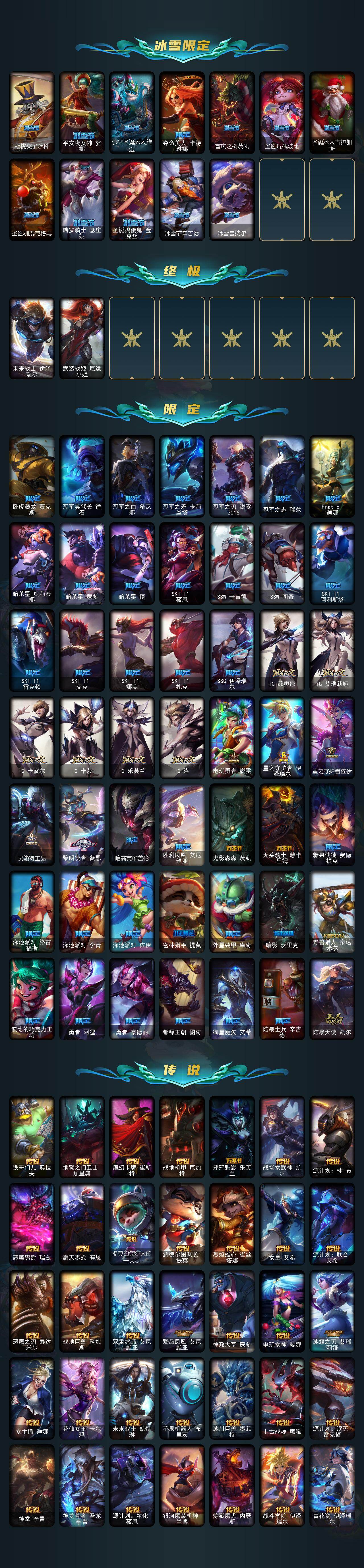 【神话皮肤】:十周年纪念安妮,源代码乐芙兰,十五周年纪念希维尔,神凰行者瑞羽圣凰艾尼维亚,永恒之森奥恩,海克斯科技嘉文四世,海克斯科技卡萨丁,海克斯科技克格莫,海克斯科技雷克顿,恐惧新星德莱厄斯,零之枪骑赫卡里姆,摄魂使者薇恩,新创战纪希维尔,至臻真实伤害亚索,至臻KDA阿狸,至臻KDAALLOUT卡莎,至臻灵能特工伊泽瑞尔,至臻墨之影武者亚索,至臻绒毛菲兹,至臻腥红之月亚托克斯,至臻源