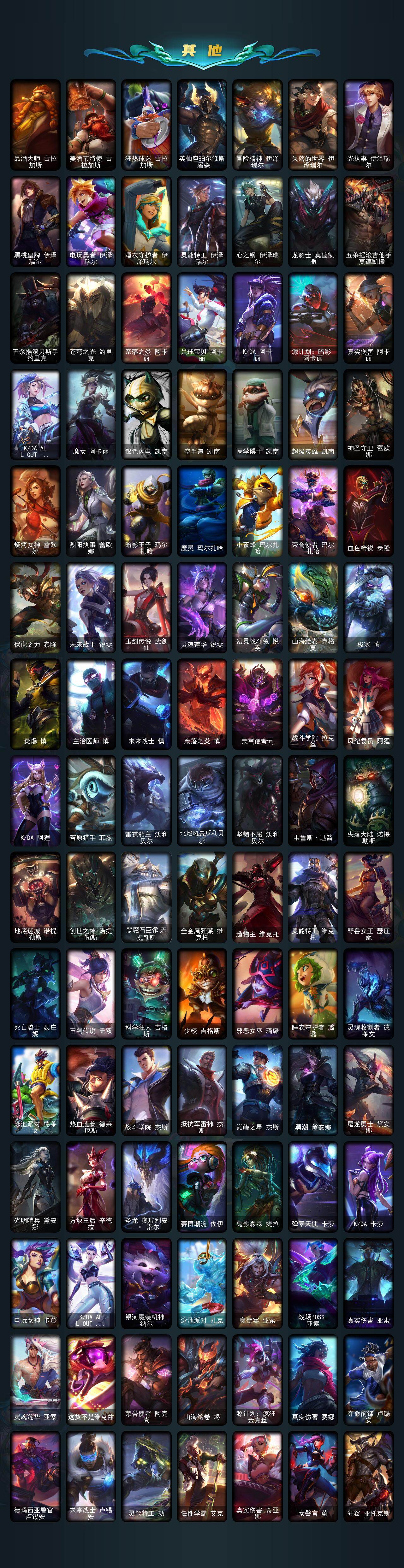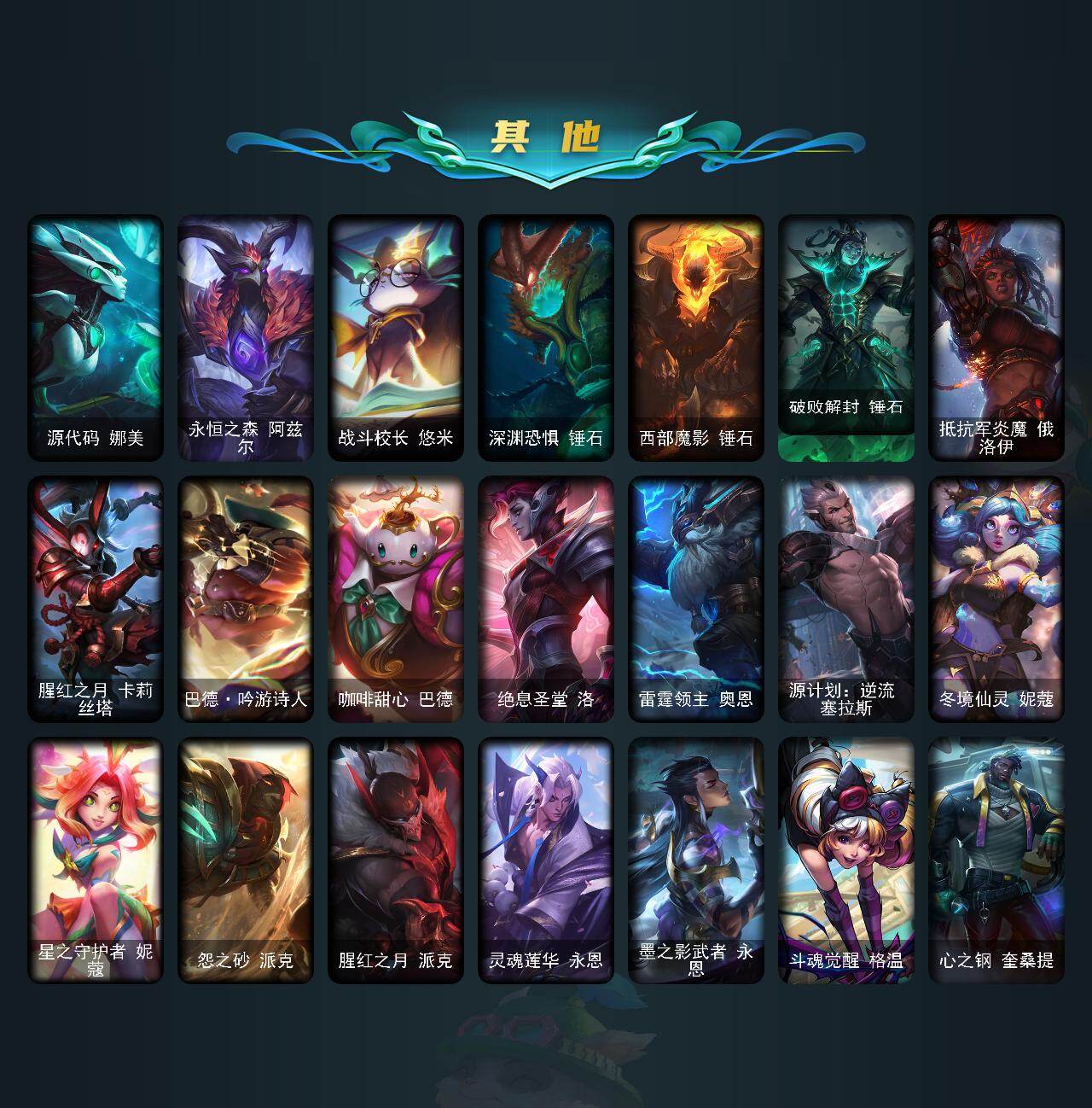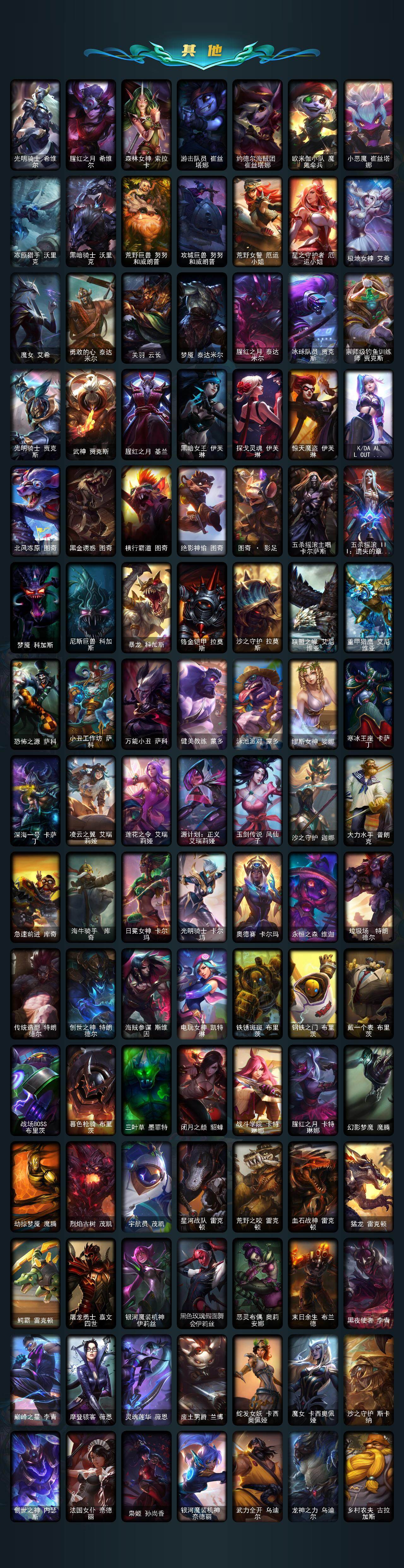 【神话皮肤】:十周年纪念安妮,源代码乐芙兰,十五周年纪念希维尔,神凰行者瑞羽圣凰艾尼维亚,永恒之森奥恩,海克斯科技嘉文四世,海克斯科技卡萨丁,海克斯科技克格莫,海克斯科技雷克顿,恐惧新星德莱厄斯,零之枪骑赫卡里姆,摄魂使者薇恩,新创战纪希维尔,至臻真实伤害亚索,至臻KDA阿狸,至臻KDAALLOUT卡莎,至臻灵能特工伊泽瑞尔,至臻墨之影武者亚索,至臻绒毛菲兹,至臻腥红之月亚托克斯,至臻源