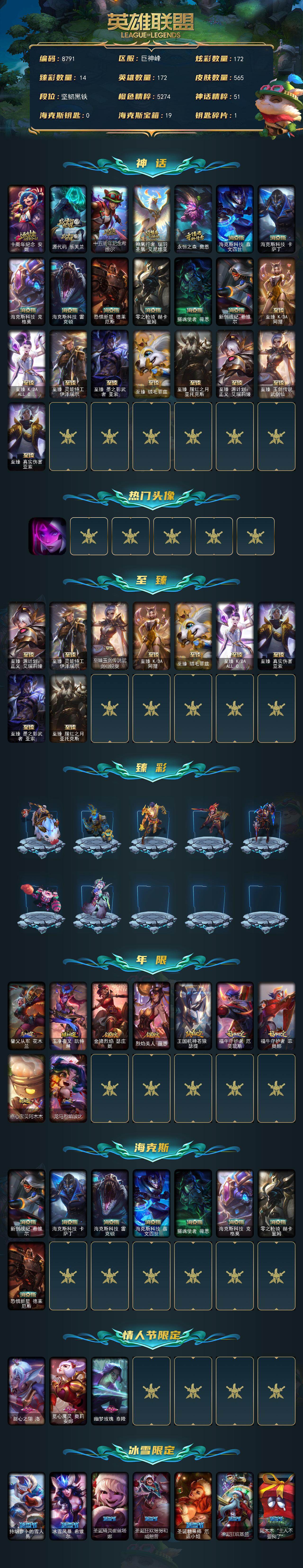 单双未定级段位-172英雄-565皮肤-172炫彩-2终极-22神话-80限定-54传说-135史诗