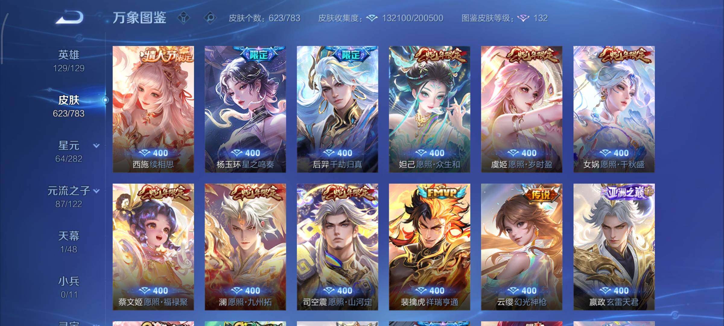 【精品V10·10典藏·3无双·3珍品·110按键·265个性戳戳·云缨关羽狄仁杰马年·全皮西施·全皮曜·全皮守约·全皮云缨·全皮元歌等·带妹专属·可二次】YXw16378-安卓WX-129英雄-623皮肤-17王者印记-300铭文-贵族积分35w【贵族10】【10典藏·3无双·3珍品·4星传说·103传说·1天幕·110按键·265个性戳戳】【因赛季更新游戏段付