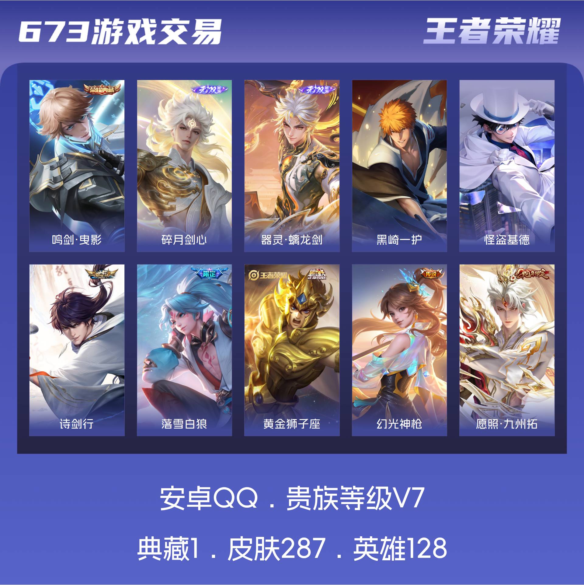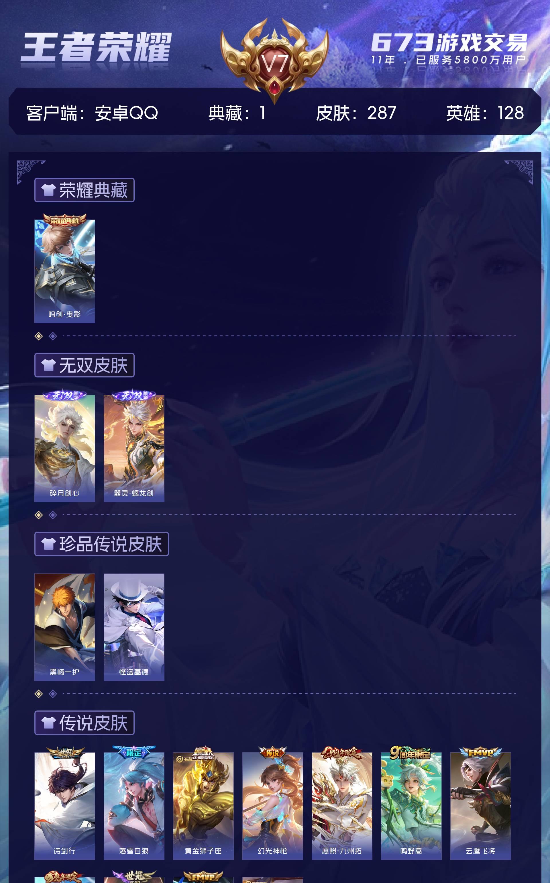 安卓QQ/至尊星耀/287皮肤/128英雄/1典藏/0珍品无双/2无双/2珍品传说/10传说/96史
