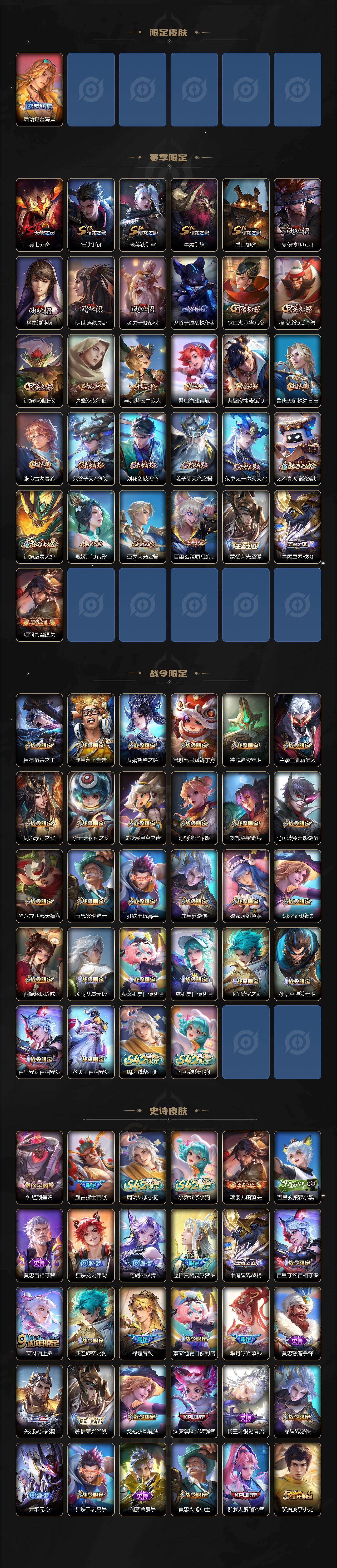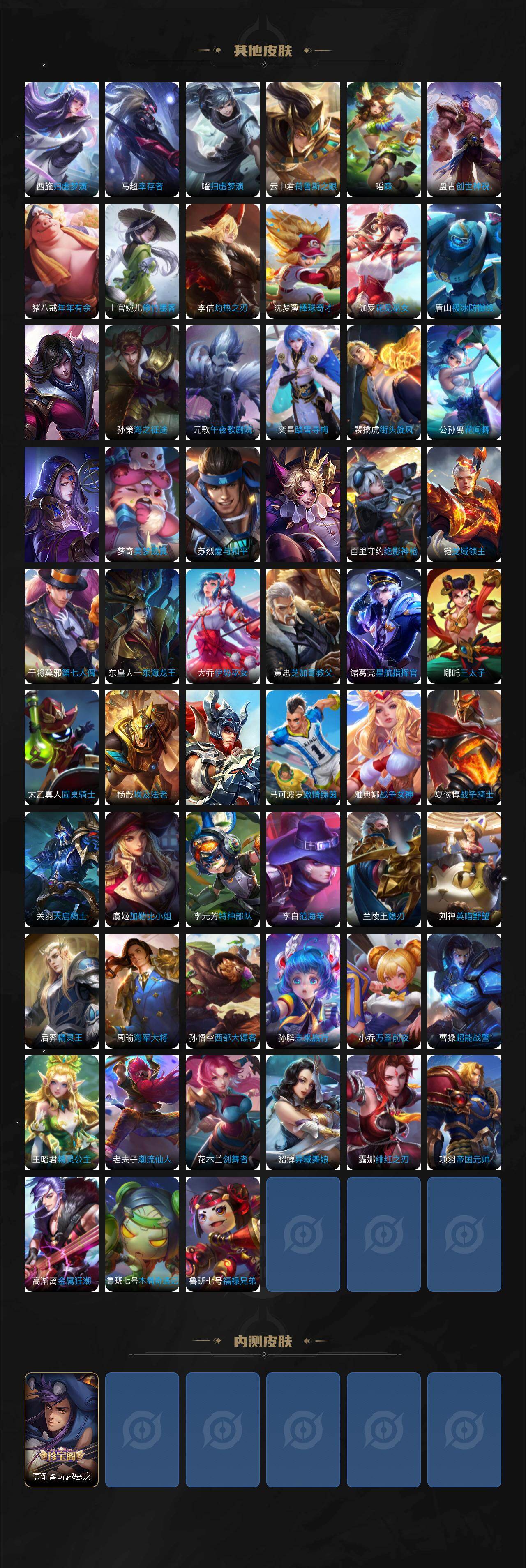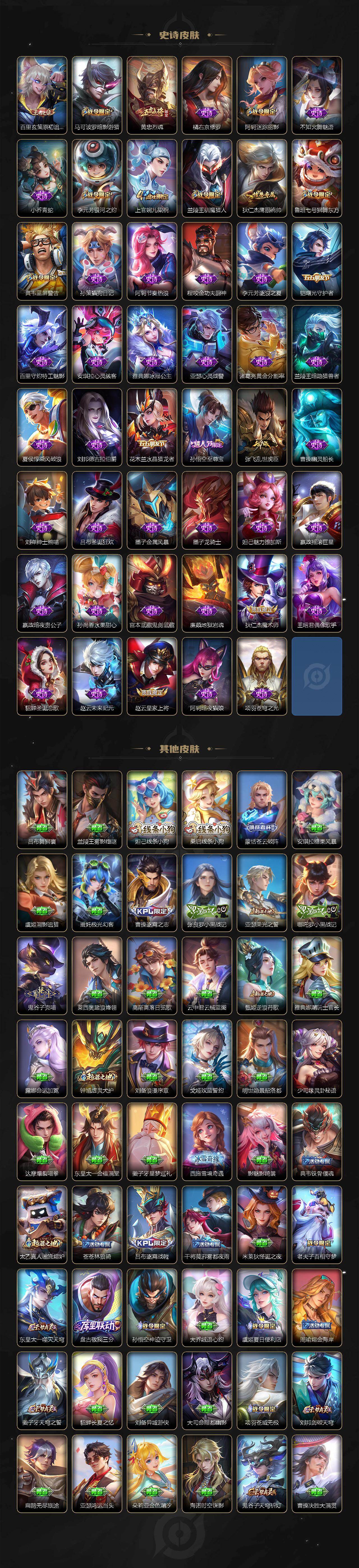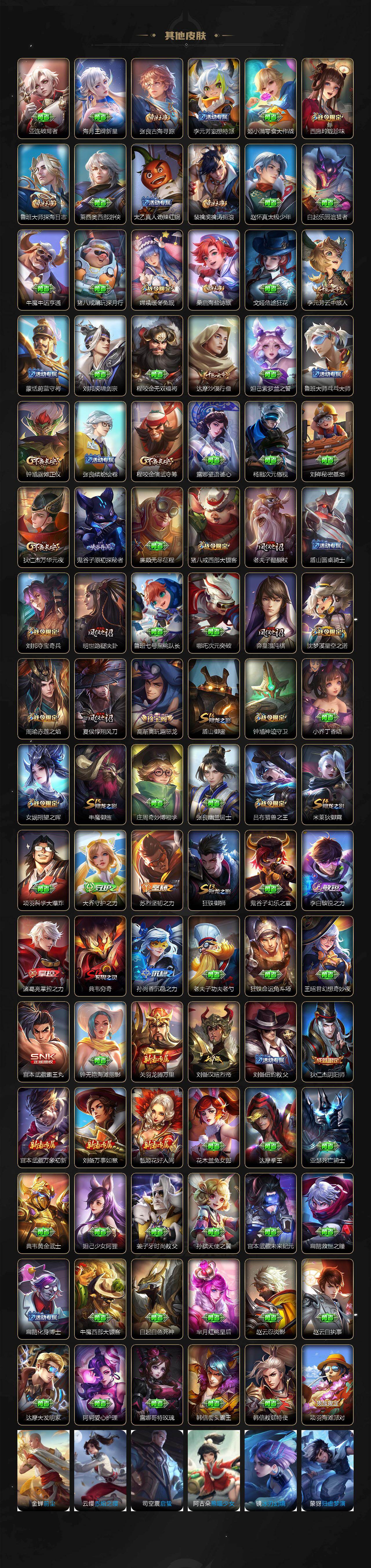 【传说皮肤】:云缨神骥越千峰,关羽神骥镇沧海,马超神骥逐星野,公孙离云诺千山,云缨幻光神枪,桑启鸣野蒿,夏侯惇霜北刀,典韦战鼓燎原,孙悟空齐天大圣,李白诗剑行,孙尚香音你闪耀,马超无双飞将,赵云淬星耀世,铠绛天战甲,虞姬启明星使,干将莫邪久胜战神,达摩黄金狮子座,花木兰冠军飞将,梦