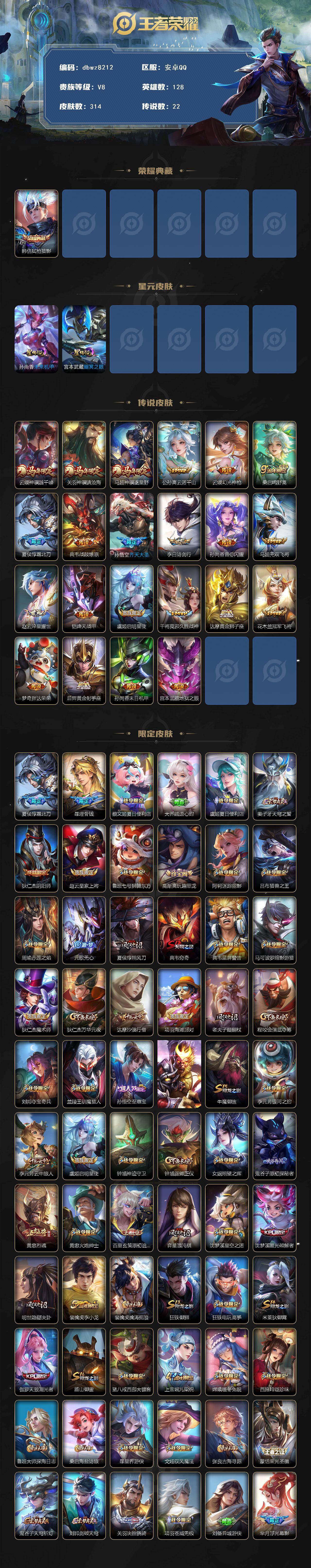 【商品标题】:安卓Q-有二次-V8(50925分)-314皮-1典藏-22传说-9109场-5按键-【最新段位以实际为准,截图仅供参考】
