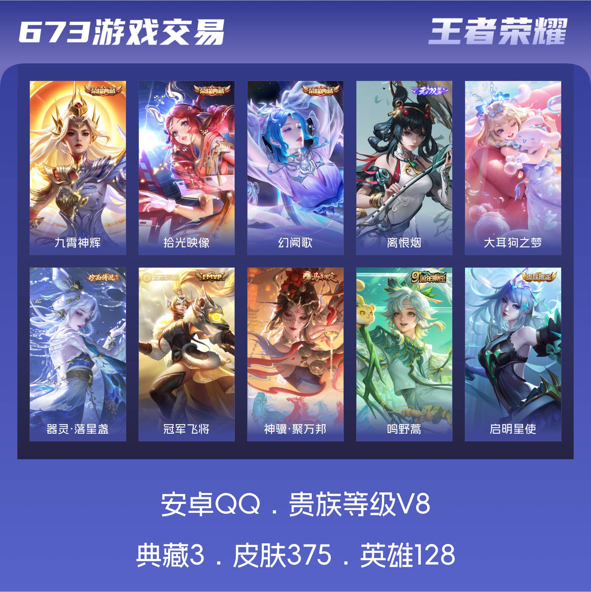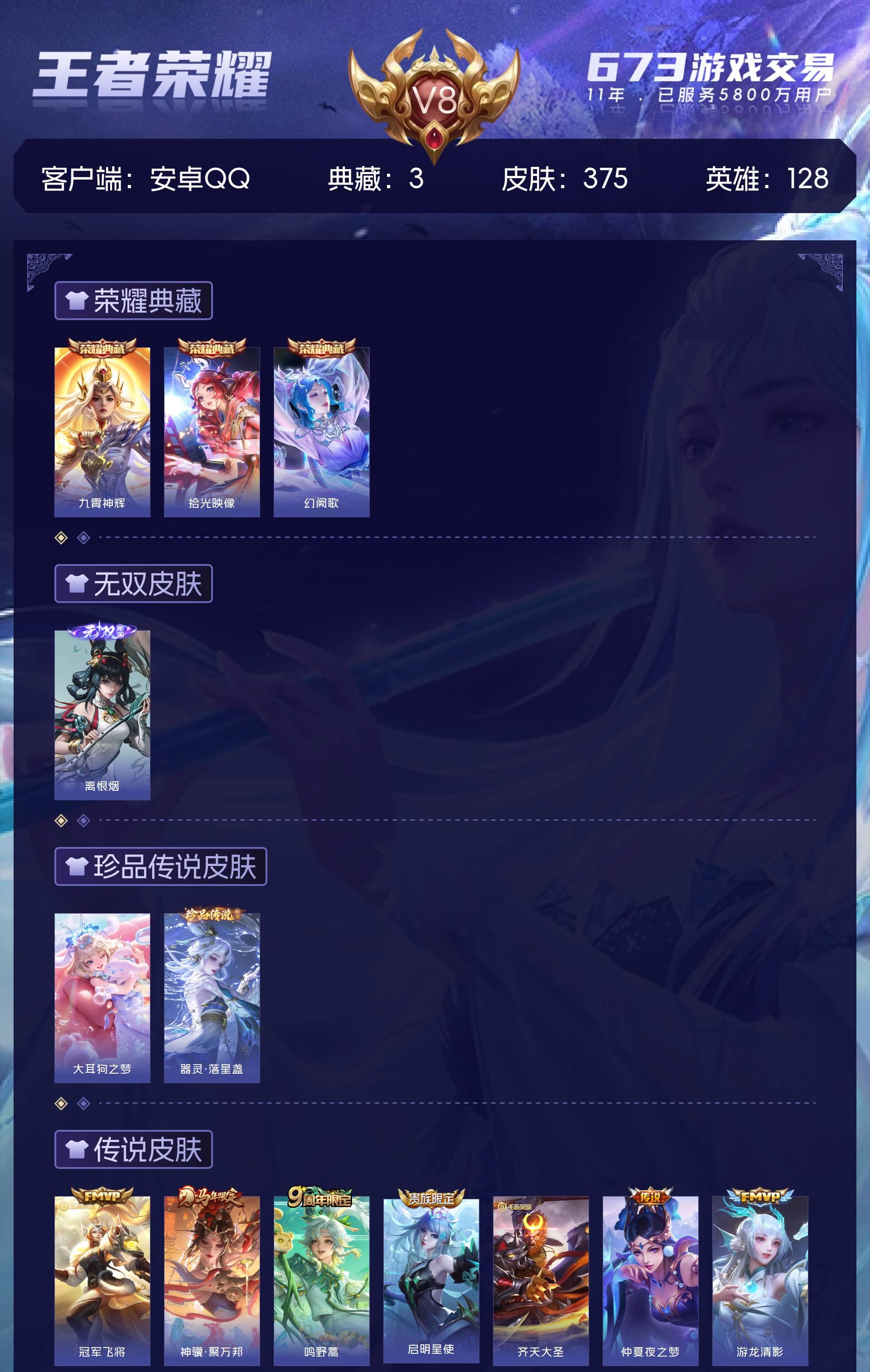 V8 皮肤375 英雄128 最强王者 荣耀典藏3 无双皮肤1 珍品传说2 传说15 其他皮肤361