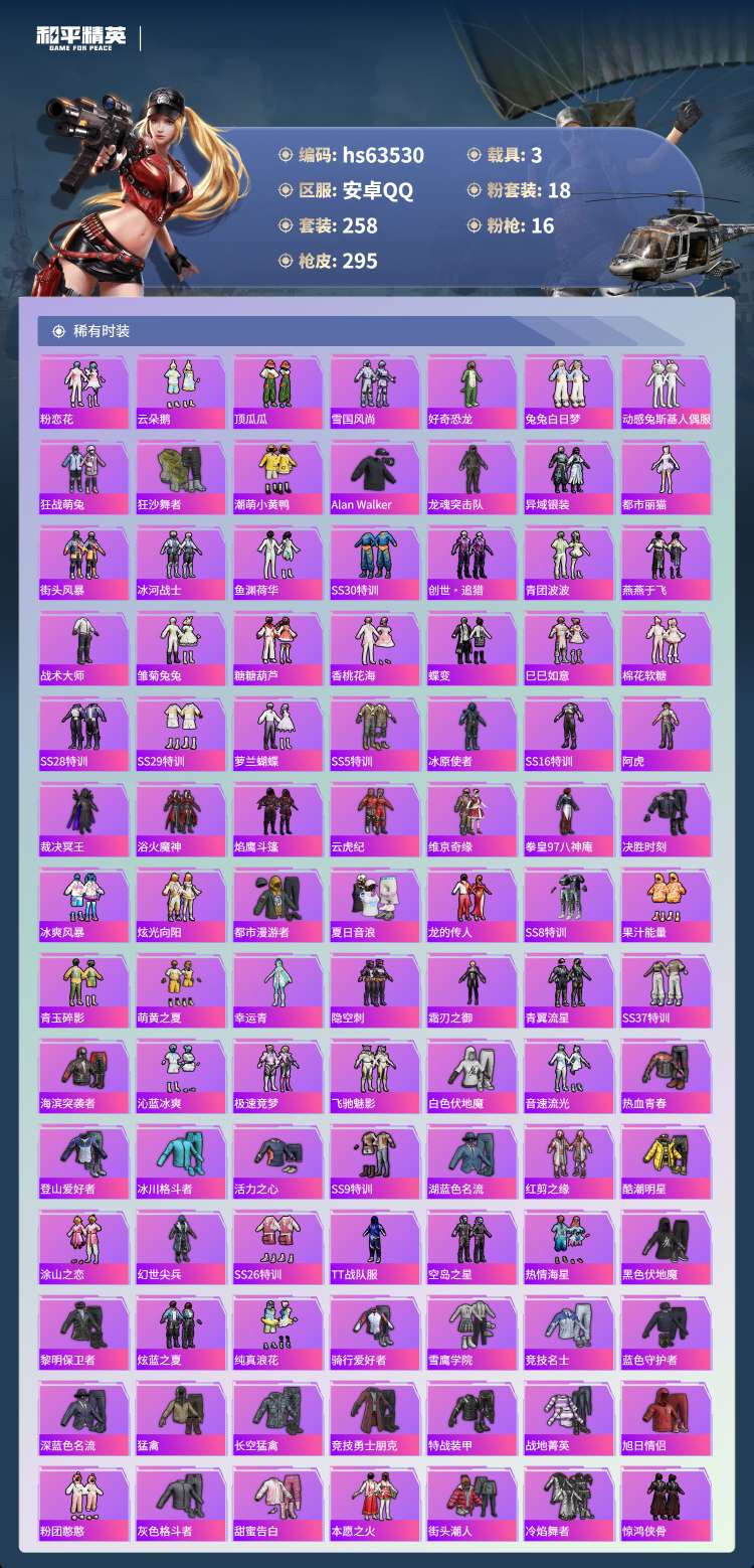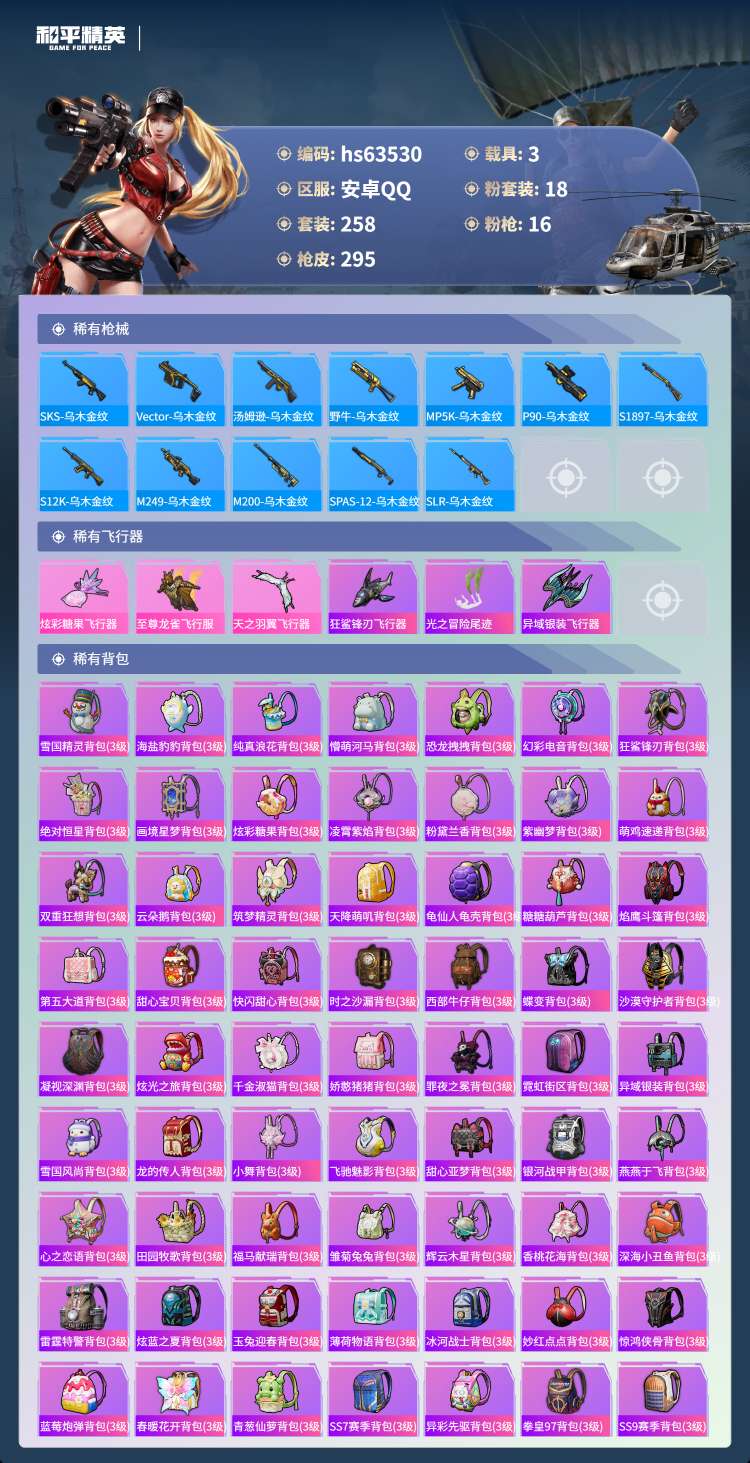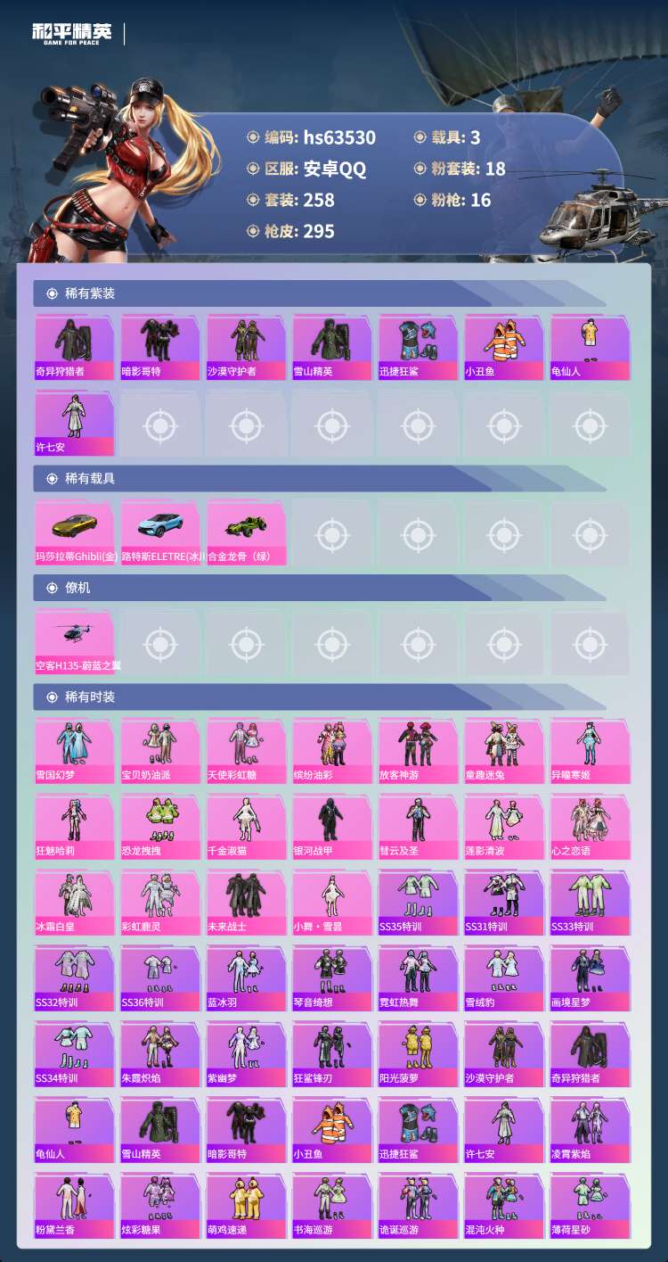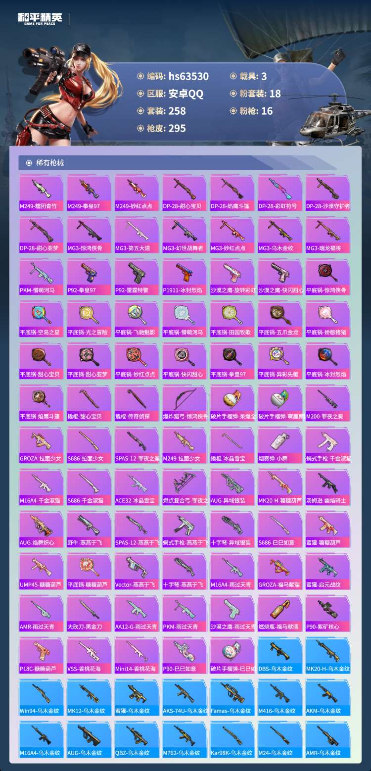 hs63530 安卓手Q-16王牌印记-有战神框-18粉装-16特效枪-3载具-111690热力值-