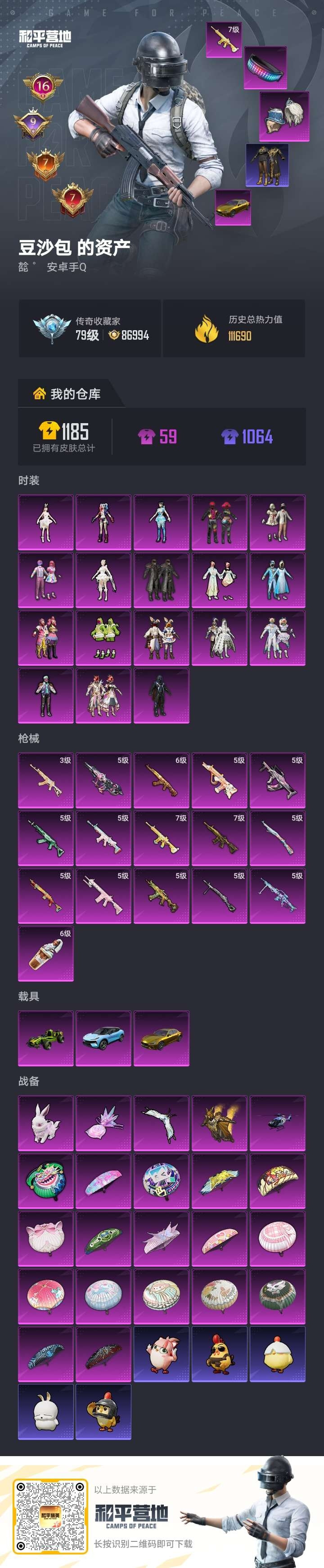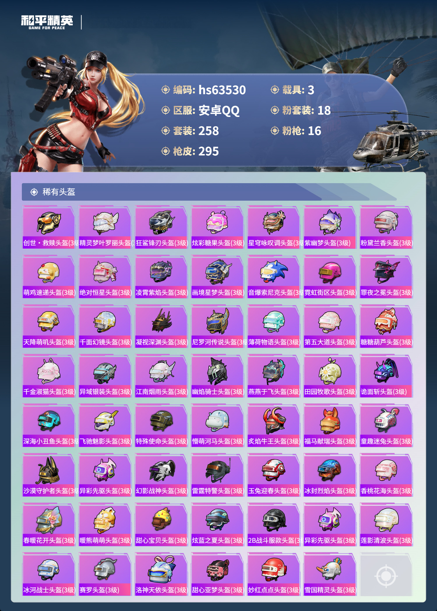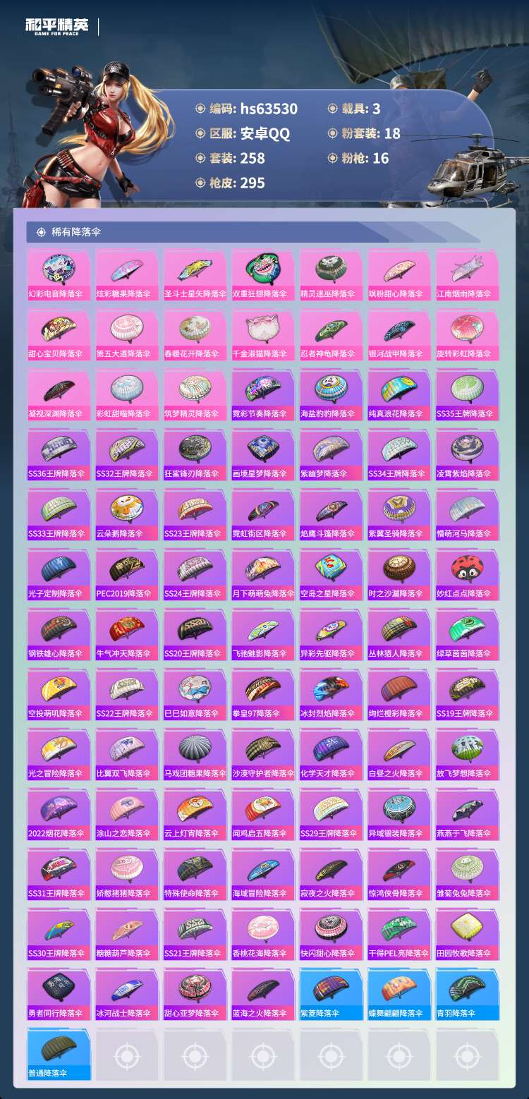 hs63530 安卓手Q-16王牌印记-有战神框-18粉装-16特效枪-3载具-111690热力值-