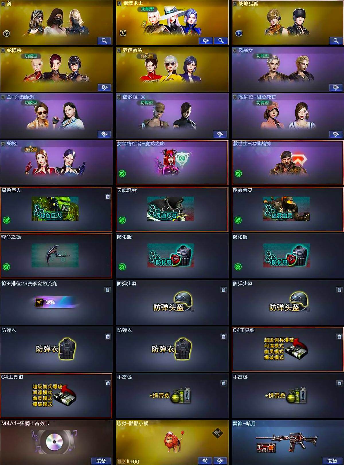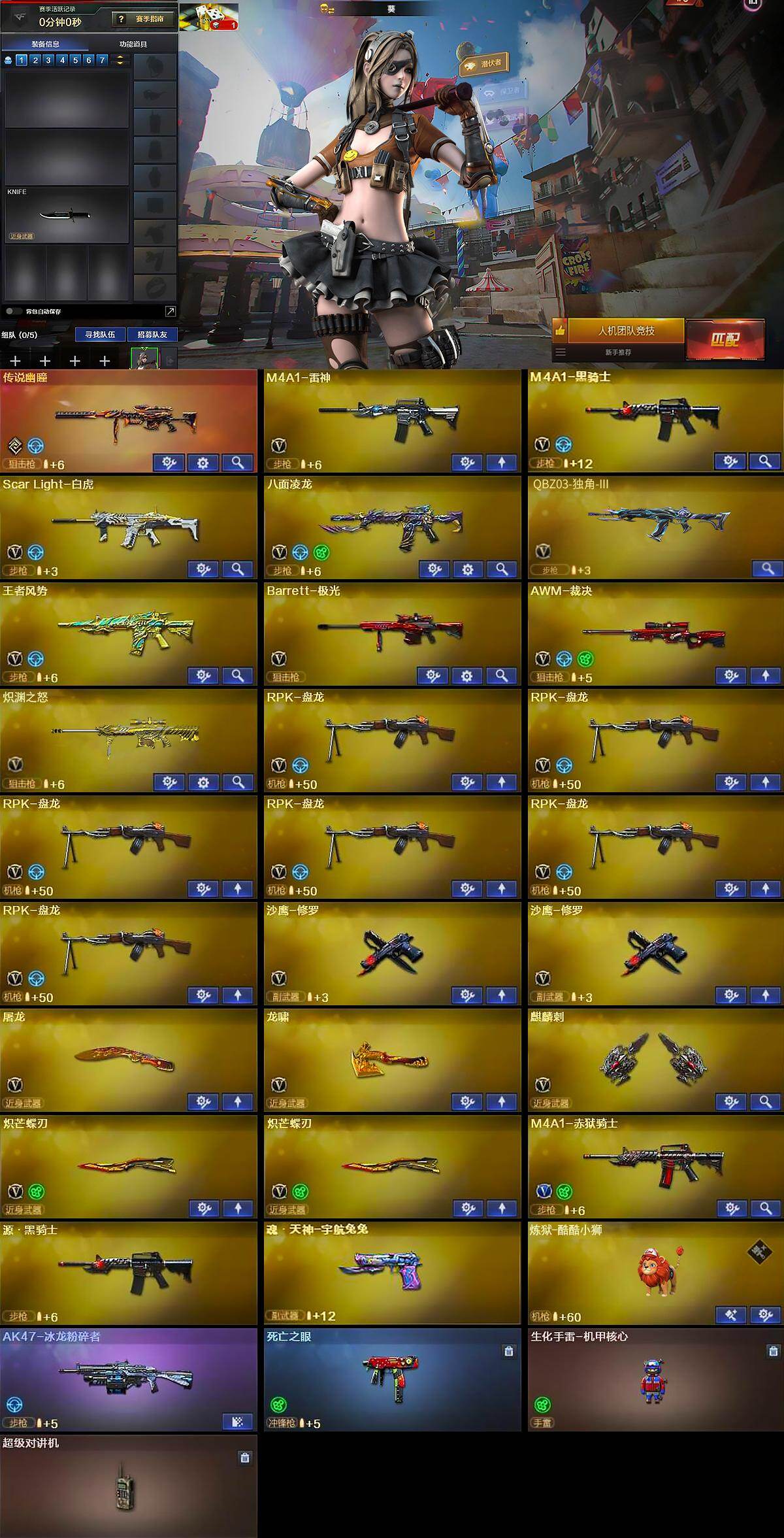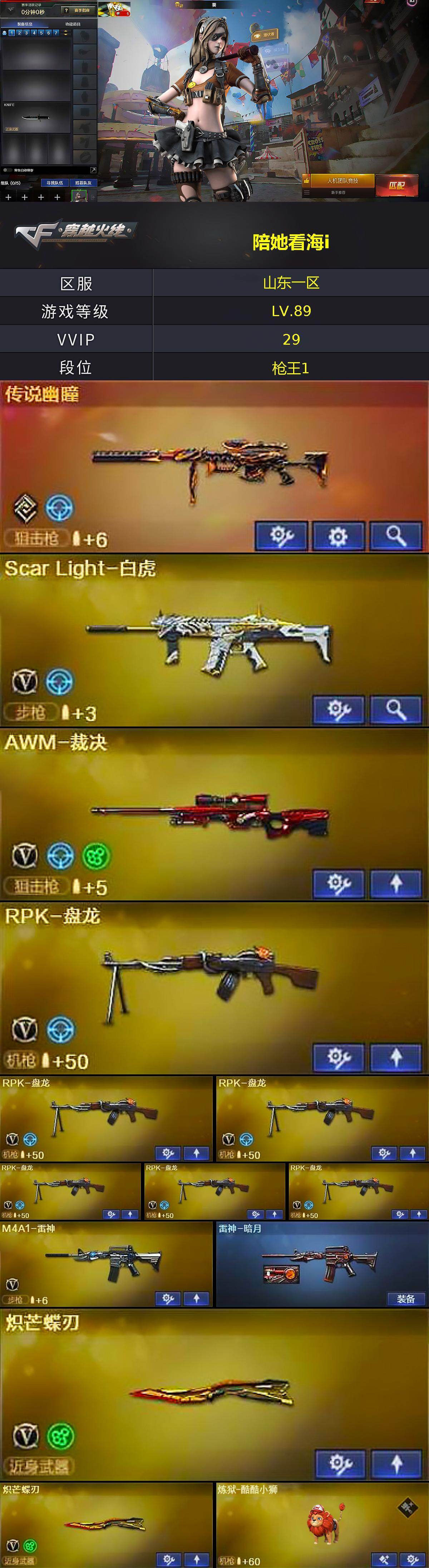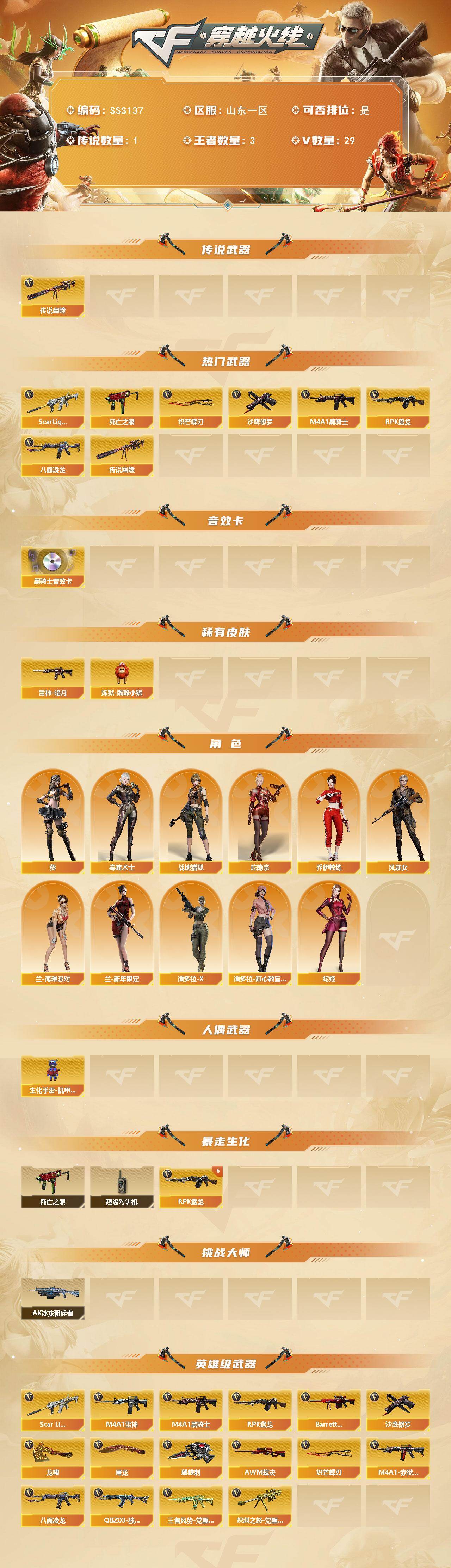 山东一区-30V-3王者武器数-0炫金武器数【传说武器】:传说幽瞳【热门武器】:传说幽瞳,Scar Light-白虎,八面凌龙,死亡之眼,M4A1-黑骑士,RPK-盘龙*6,沙鹰-修罗*2,炽芒蝶刃*2【音效卡】:M4A1-黑骑士音效卡【皮肤】:雷神-暗月,炼狱-酷酷小狮【角色】:葵,毒蝰术士,战地猎狐,蛇隐宗,乔伊教练,风暴女,兰-海滩派对,兰-新年限定,潘多拉-X,潘多拉-甜心教官,蛇姬【人偶武器】:生化手雷-机甲核心【暴走生化】:死亡之眼,超级对讲机【挑战大师】:AK47-冰龙粉碎者【英雄