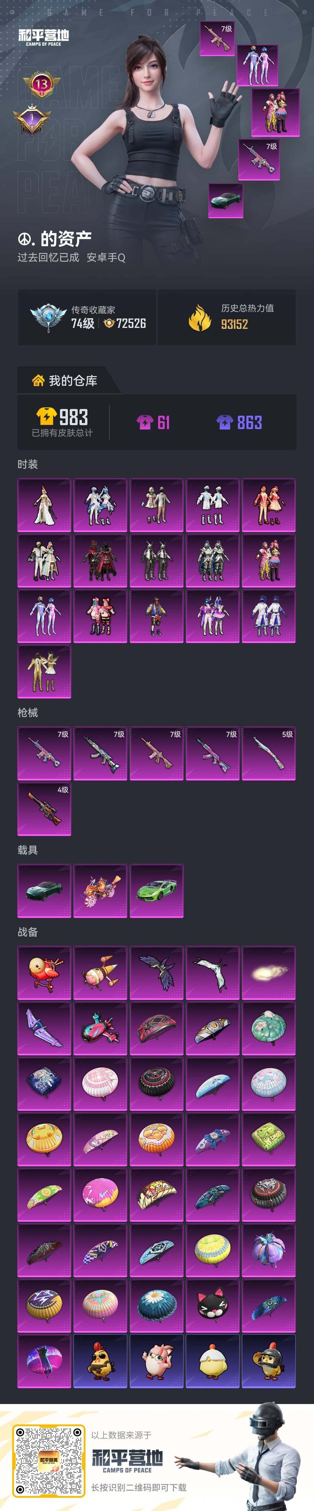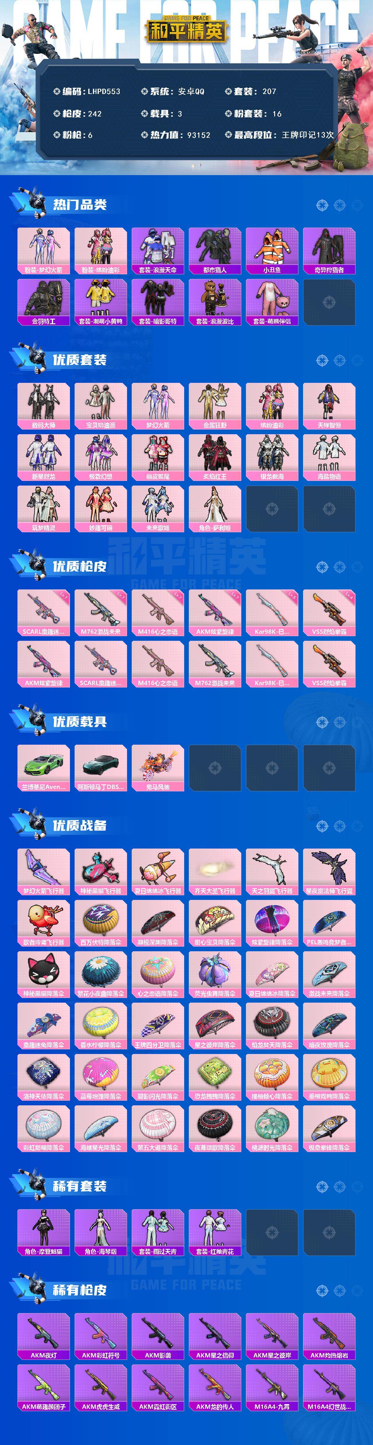 【特价出售/店主推荐】安卓 手Q-16粉装-6特效枪-3载具-7粉色飞行器-93152热力值-13王牌印记-207套装-242枪皮【热门品类】:粉装-梦幻火箭,粉装-缤纷油彩,套装-浪漫天命,套装-都市猎人,套装-小丑鱼,套装-奇异狩猎者,套装-金羽特工,套装-潮萌小黄鸭,套装-暗影哥特,套装-浪漫波比,套装-萌熊伴侣【粉色套装】:粉装-数码大师,粉装-宝贝奶油派,粉装-梦幻火箭,粉装-金属狂野