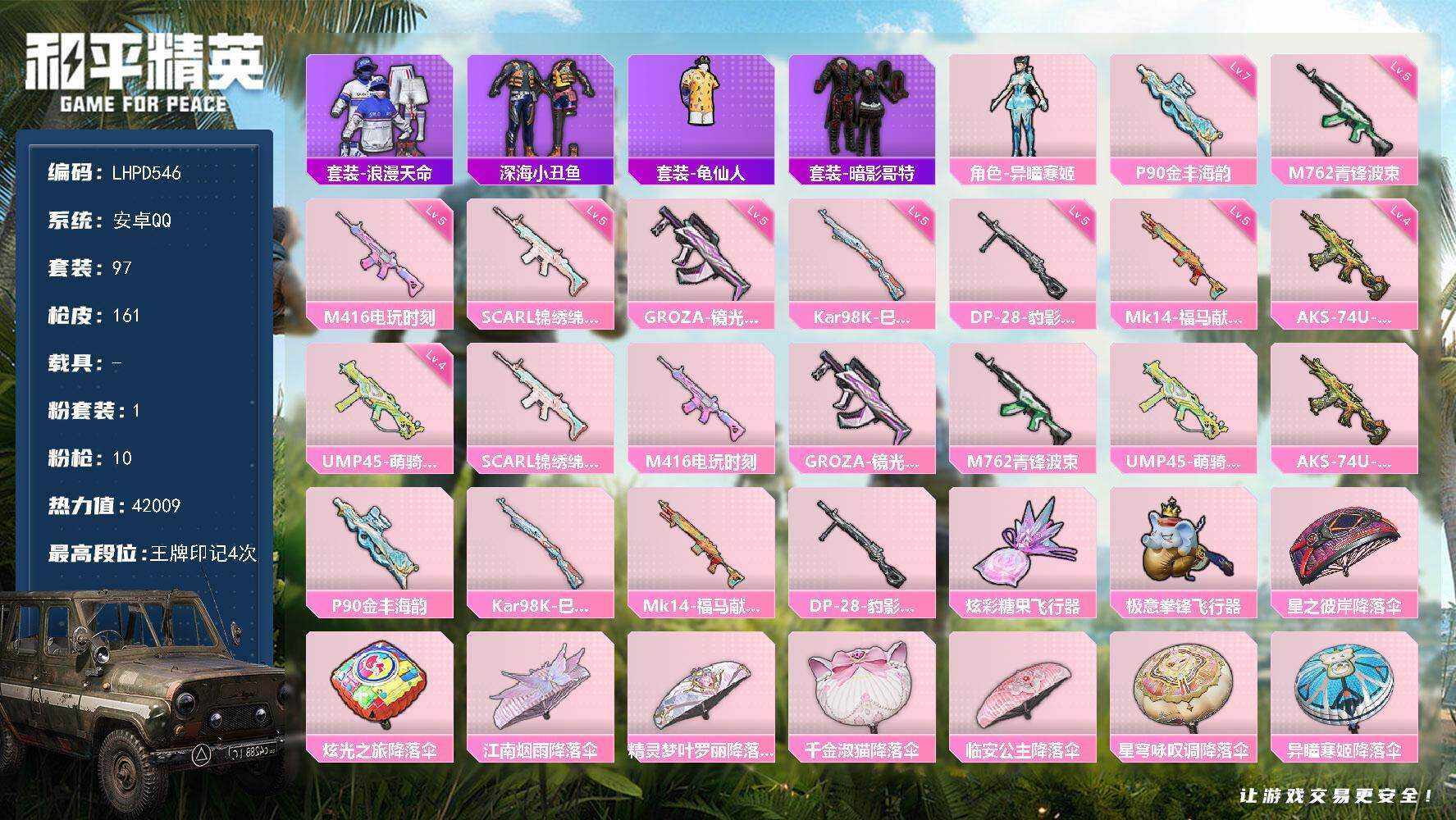 【店主推荐捡漏号!可直接换绑】安卓 手Q-1粉装-10特效枪-0载具-2粉色飞行器-42009热力值-4王牌印记-97套装-161枪皮【热门品类】:套装-浪漫天命,套装-深海小丑鱼,套装-龟仙人,套装-暗影哥特【粉色套装】:角色-异瞳寒姬【粉色枪皮等级】:SCAR-L-锦绣绵绵(五级),M416-电玩时刻(五级),GROZA-镜光银凌(五级),M762-青锋波束(五级),UMP45-萌骑冒险(四