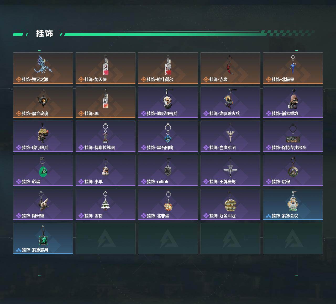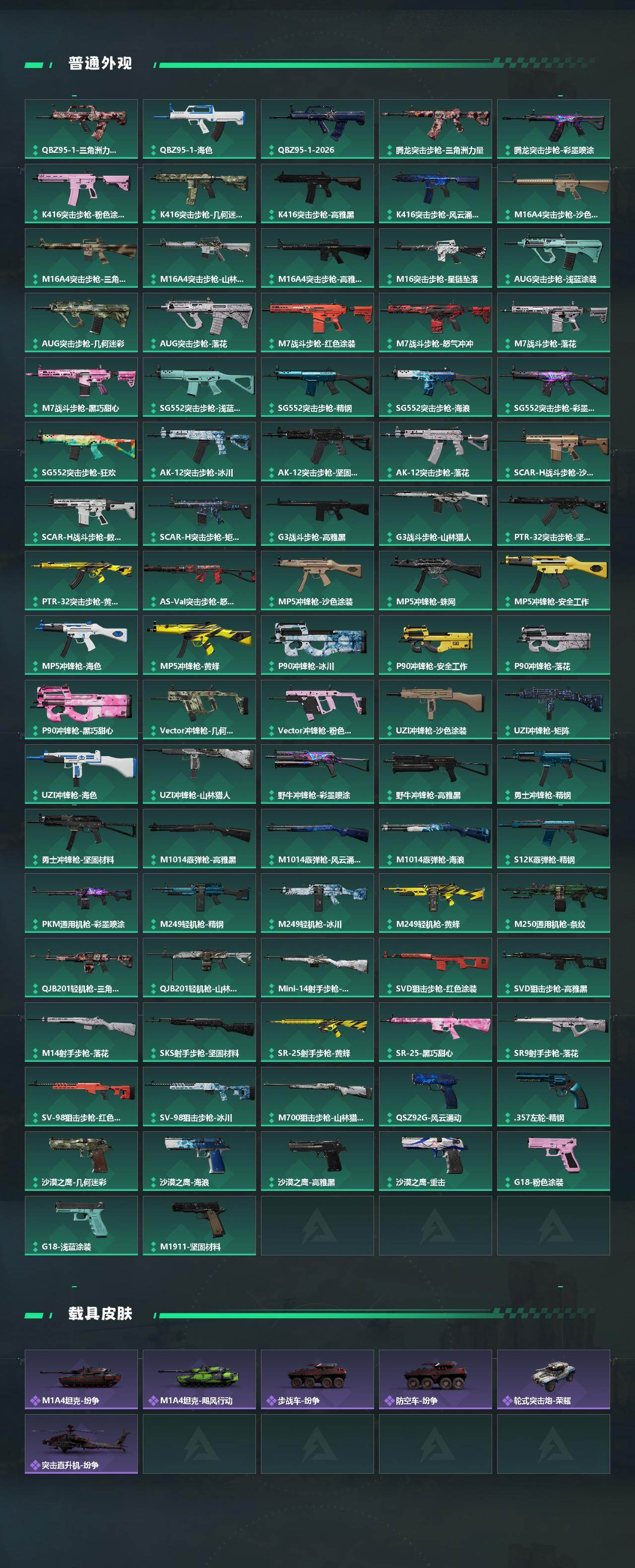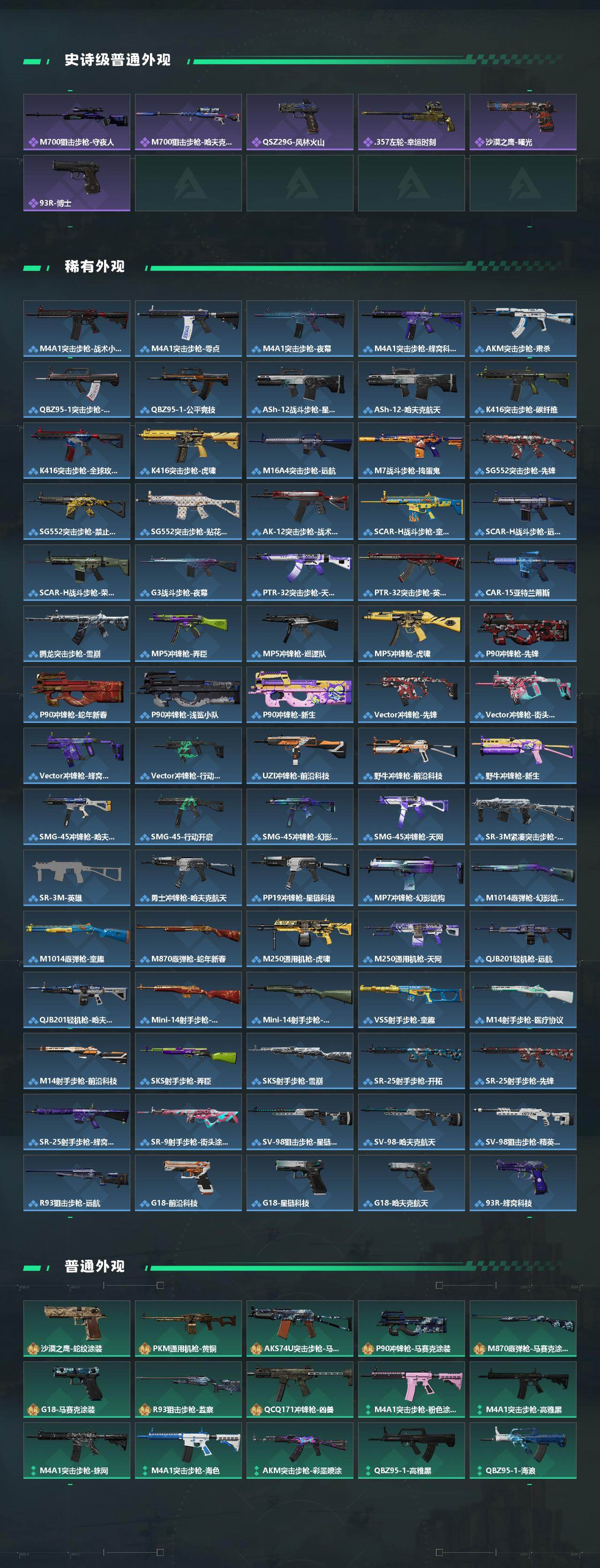 【传说外观】:M4A1突击步枪-蚀金玫瑰,M4A1突击步枪-阿米娅,AKM突击步枪-赤枭,QBZ95-1突击步枪-破军,K416突击步枪-白鹰军团,K416突击步枪-行动记录,SG552突击步枪-白鹰