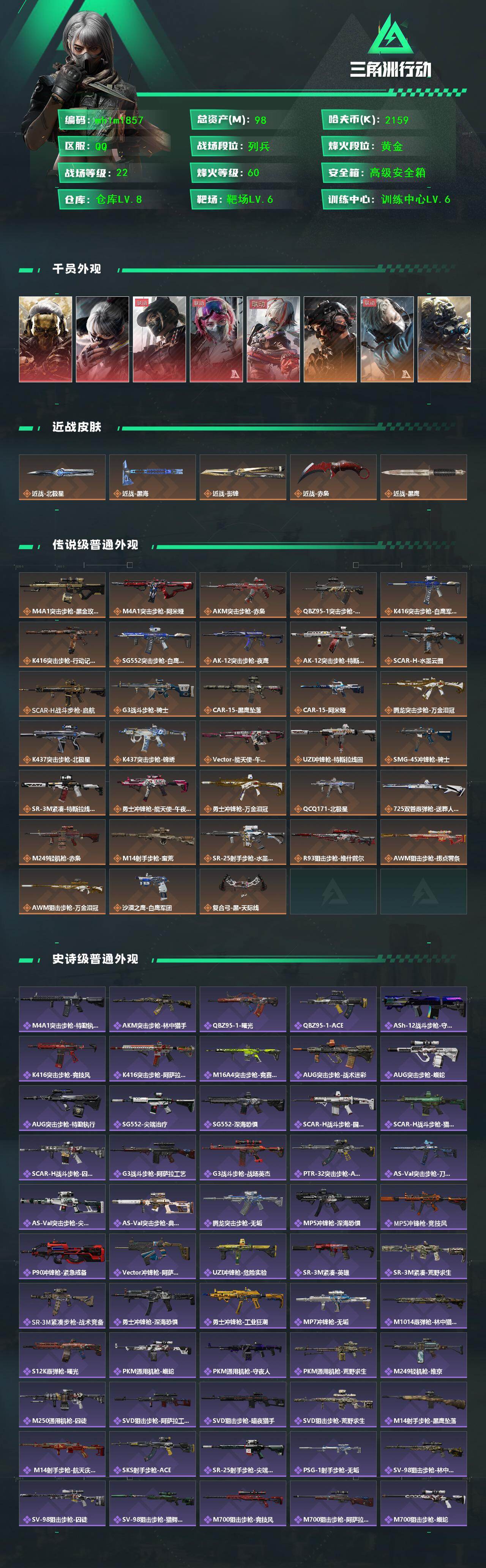 98m总资产-2159k哈伏币-60烽火等级-黄金-22战场等级-列兵【干员