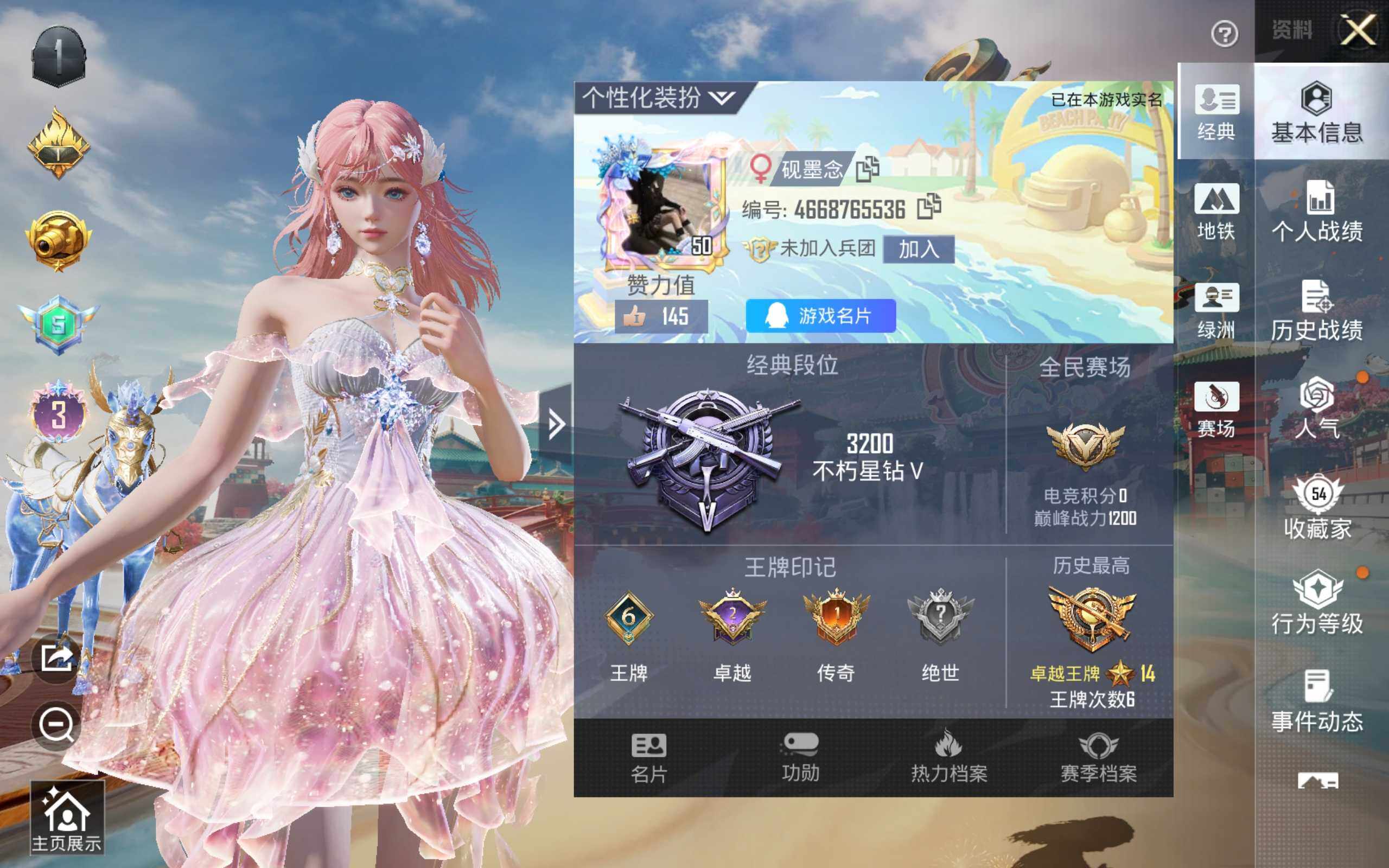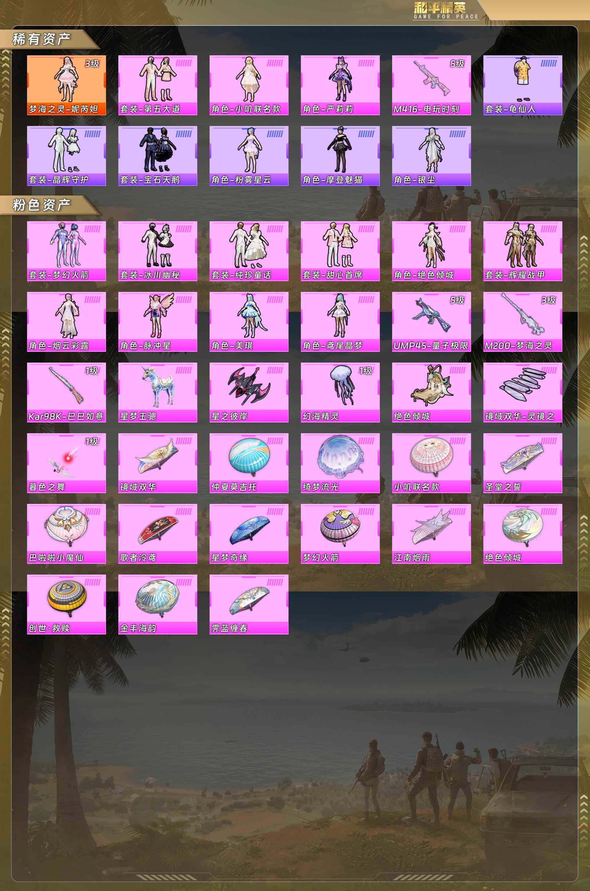 公主号-3级妮芮妲/第五大道/小叽联名款/严莉莉/M4电玩时刻5级/梦幻火箭/冰川幽秘/纯珍童话/甜心首席/绝色倾城/辉耀战甲/烟云彩露/脉冲星/美琪/鸢尾晶梦/UMP量子极限5级/M200梦海之灵3级/星梦玉骢(1神装13粉套4粉枪1载具)没战神框HP5699-5粉色飞行器-40515热力值-6王牌印记-73套装-108枪皮