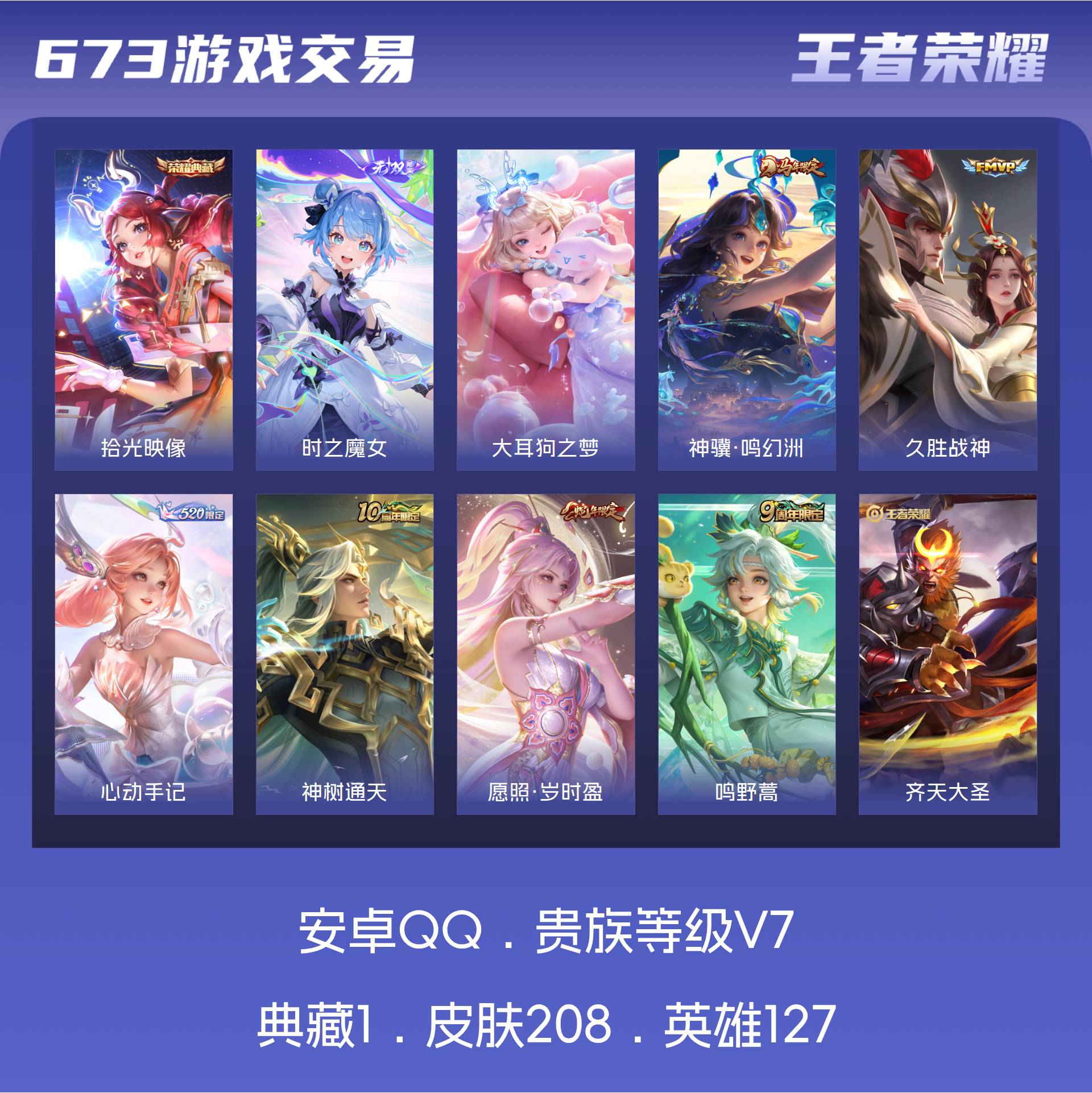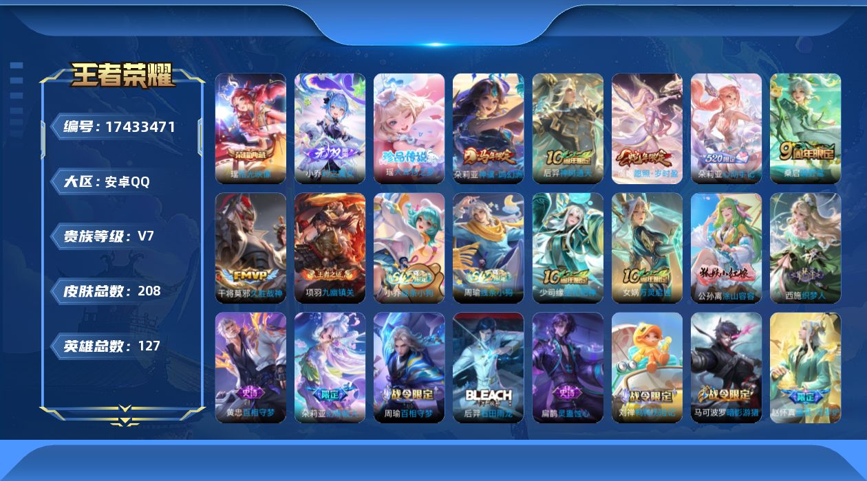 安卓Q-V7-最强王者段位-127英雄-208皮肤-1典藏皮肤-1无双-1珍品传说-6传说-64史诗