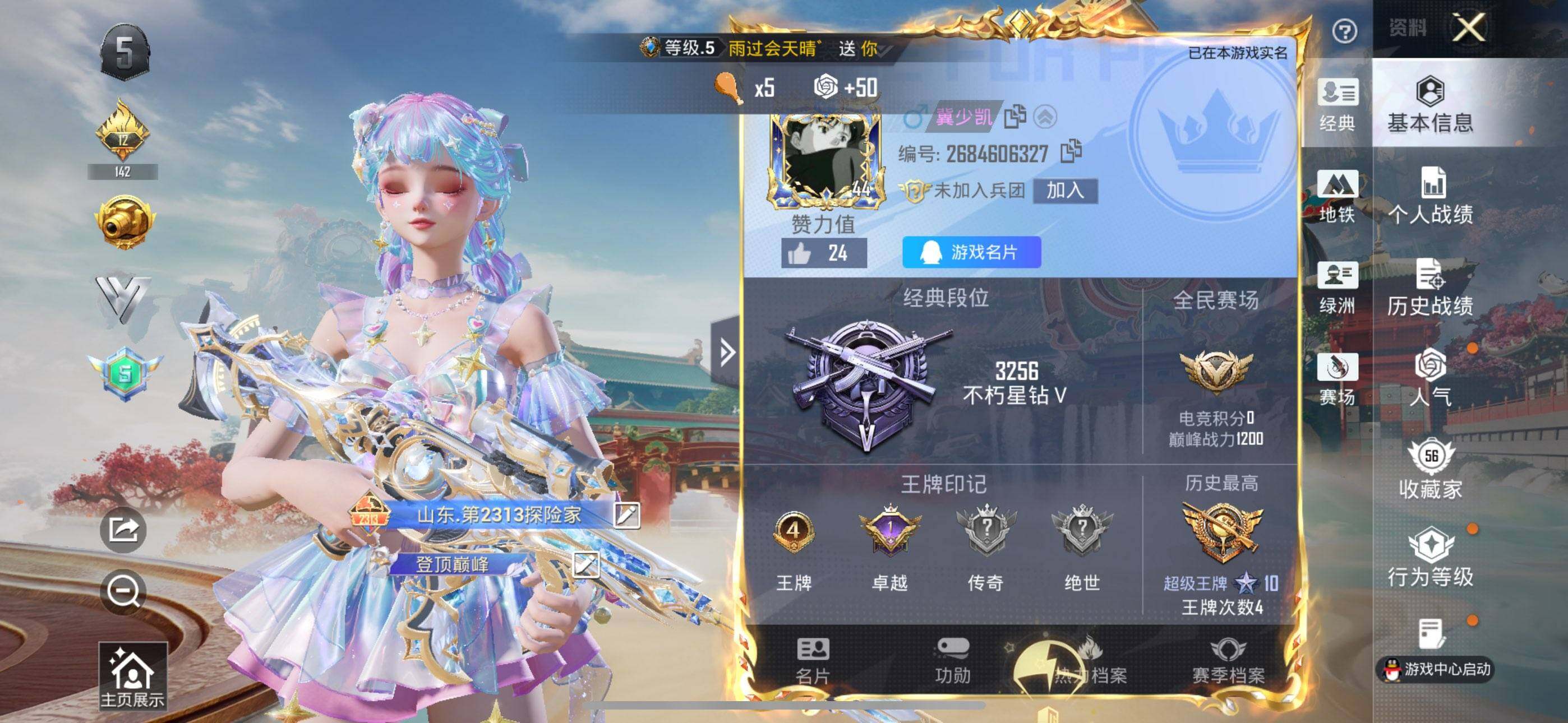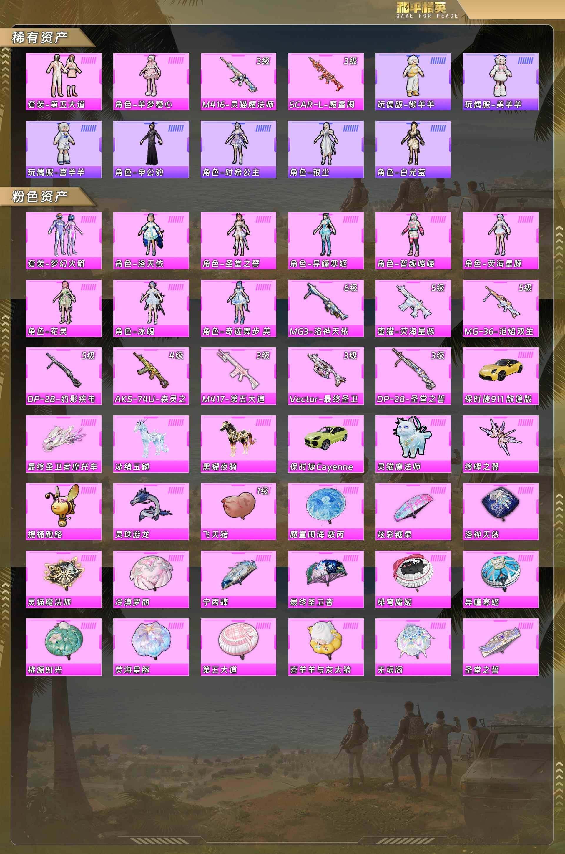 公主号-第五大道/羊梦糖心/梦幻火箭/洛天依/圣堂之誓/异瞳寒姬/智趣喵喵/荧海星豚/花灵/冰魄/奇迹舞步美琪/M4灵猫魔法师3级/SCAR魔童闹海3级/MG3洛神天依6级/蜜獾荧海星豚5级/M417第五大道3级/DP28圣堂之誓3级/保时捷敞篷版(黄)/最终圣卫者摩托/冰绡玉鳞/黑曜夜骑/保时捷(绿)(11粉套10粉枪5载具)没战神框HP5725-5粉色飞行器-40284热力值-4王牌印记-57套装-98枪皮