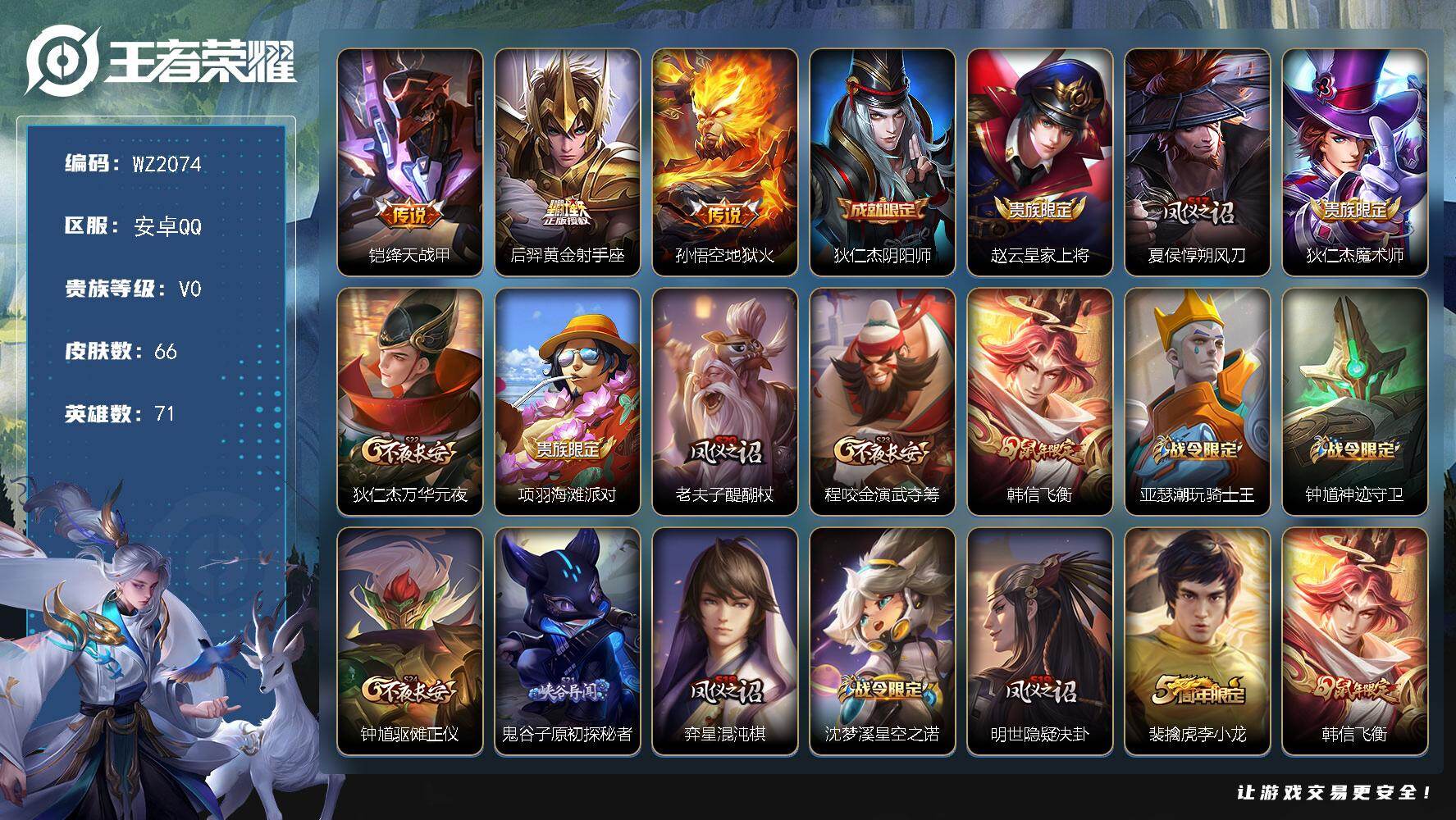 安卓Q-66皮肤-3传说-11史诗【传说皮肤】:铠绛天战甲,后羿黄金射手座,孙悟空地狱火【限定皮肤】:狄仁杰阴阳师,赵云皇家上将,夏侯惇朔风刀,狄仁杰魔术师,狄仁杰万华元夜,项羽海滩派对,老夫子醍醐杖,程咬金演武夺筹,韩信飞衡,亚瑟潮玩骑士王,钟馗神迹守卫,钟馗驱傩正仪,鬼谷子原初探秘者,弈星混沌棋,沈梦溪星空之诺,明世隐疑决卦,裴擒虎李小龙【年限皮肤】:韩信飞衡【赛季限定】:夏侯惇朔风刀,弈星混沌棋,明世隐疑决卦,老夫子醍醐杖,鬼谷子原初探秘者,狄仁杰万华元夜,程咬金演武夺筹,钟馗驱傩正仪【战