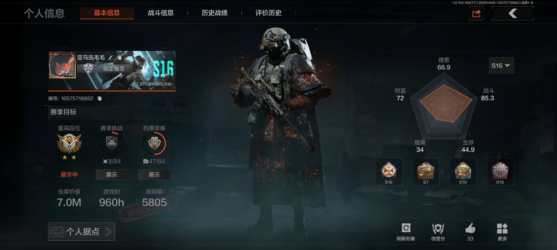 等级:30/段位:暗区传说/仓库价值(百万):7.5/柯恩币: