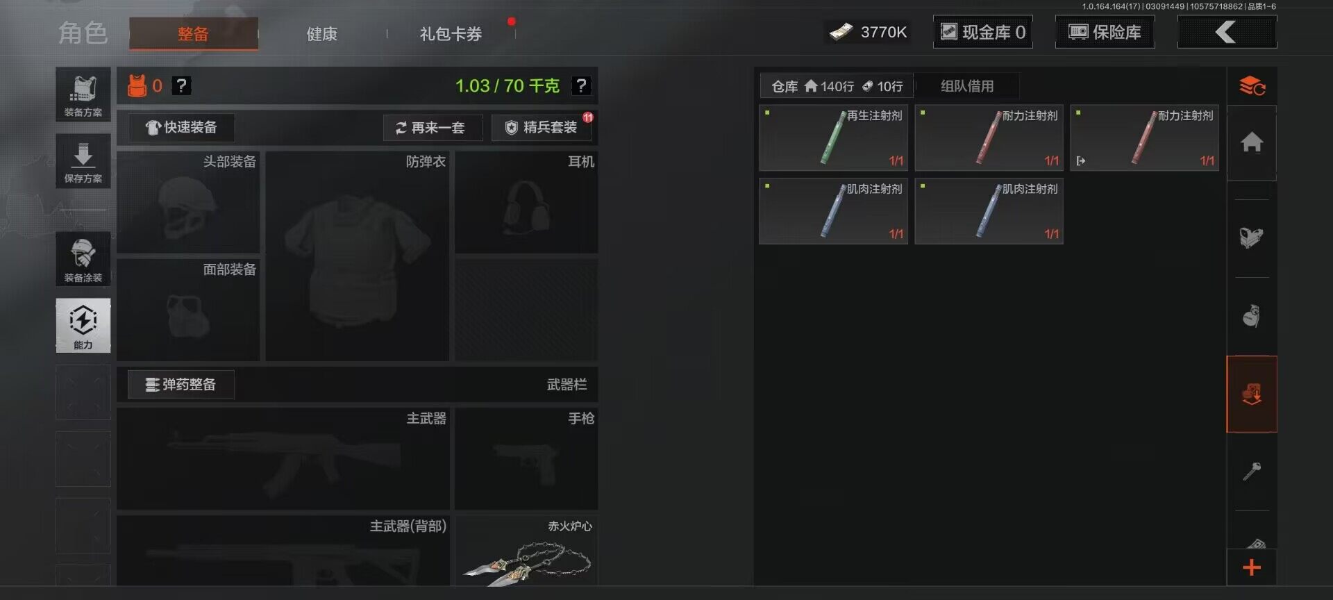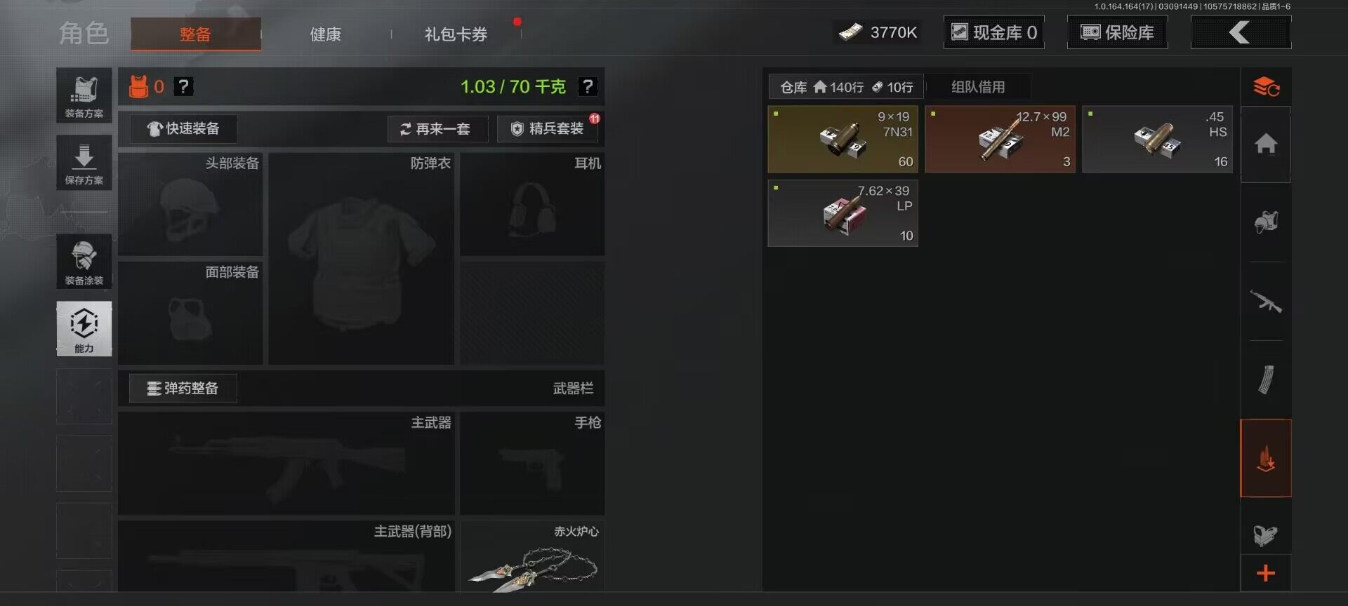 【AQQH776】等级:30/段位:暗区传说/仓库价值(百万):7.5/柯恩币:3770/急袭弯刀/幽燕钛玄/赤火炉心/工兵铲/来战开山刀/近卫荣誉RPK16/千炼铁阵MK14/百锻铁骑AEK/镀火熔金H416/长夜千军武将