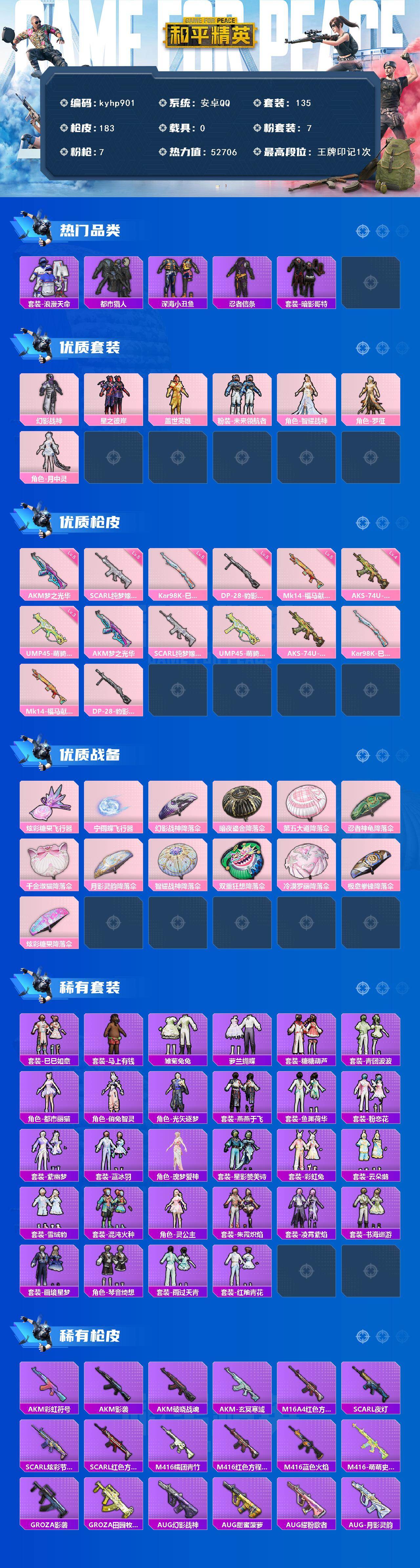 安卓 手Q-7粉装-7特效枪-0载具-2粉色飞行器-52706热力值-1王牌印记-135套装-183枪皮
