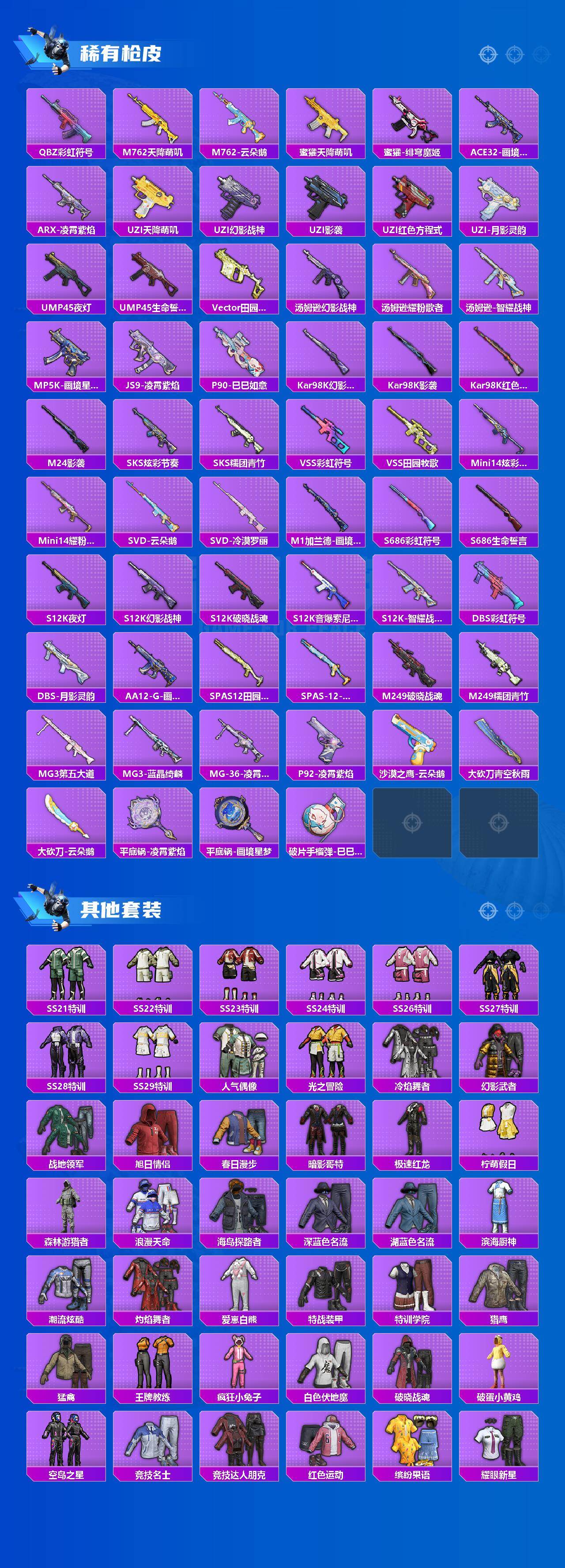 【粉色枪皮等级】:AKM-梦之光华(五级),SCAR-L-纯梦嫁纱(五级),UMP45-萌骑冒险(三级),AKS-74U-森灵之息(四级),Kar98K-巳巳如意(五级),Mk