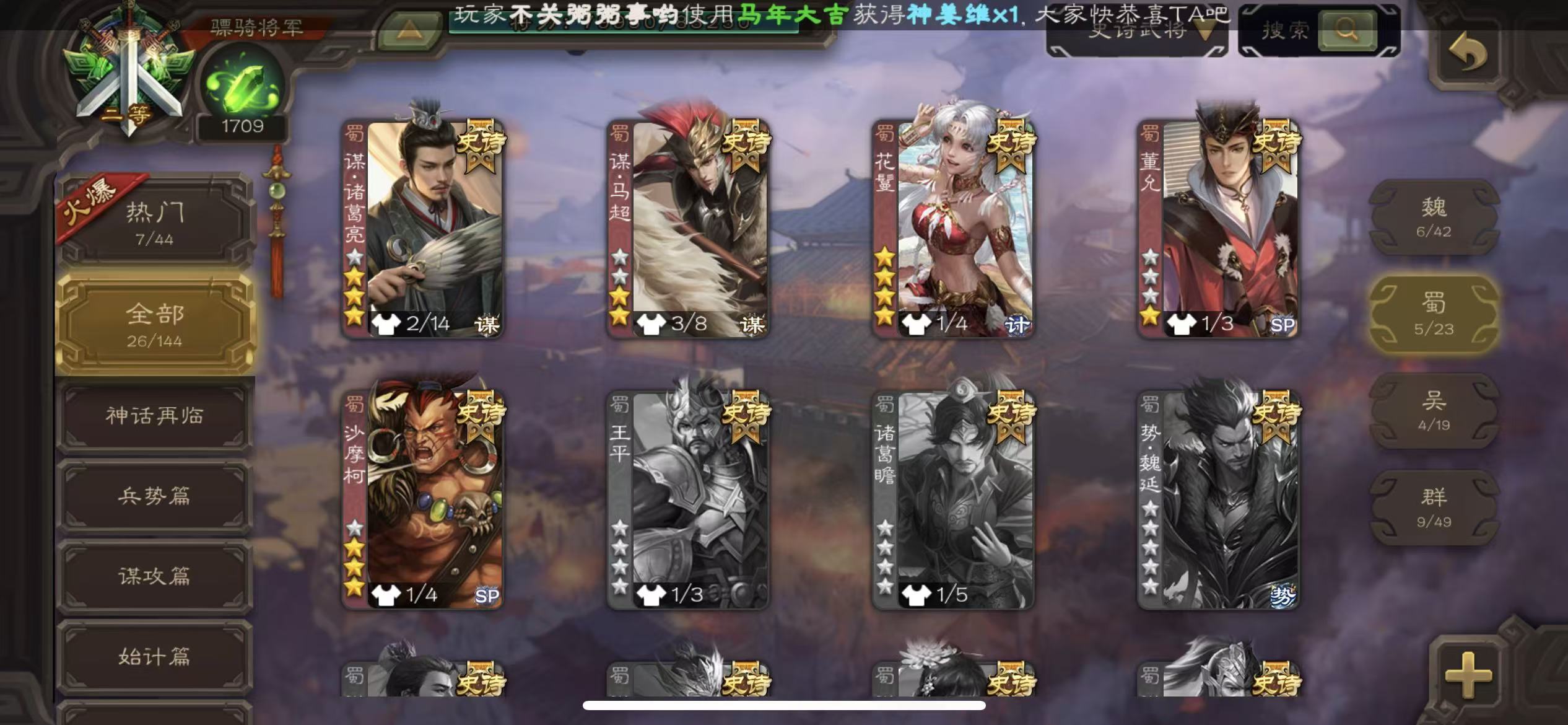 二等骠骑26史诗势钟会动态谋貂蝉动态势陆郁生谋诸葛亮动态界李儒动态白马界左慈三卡
